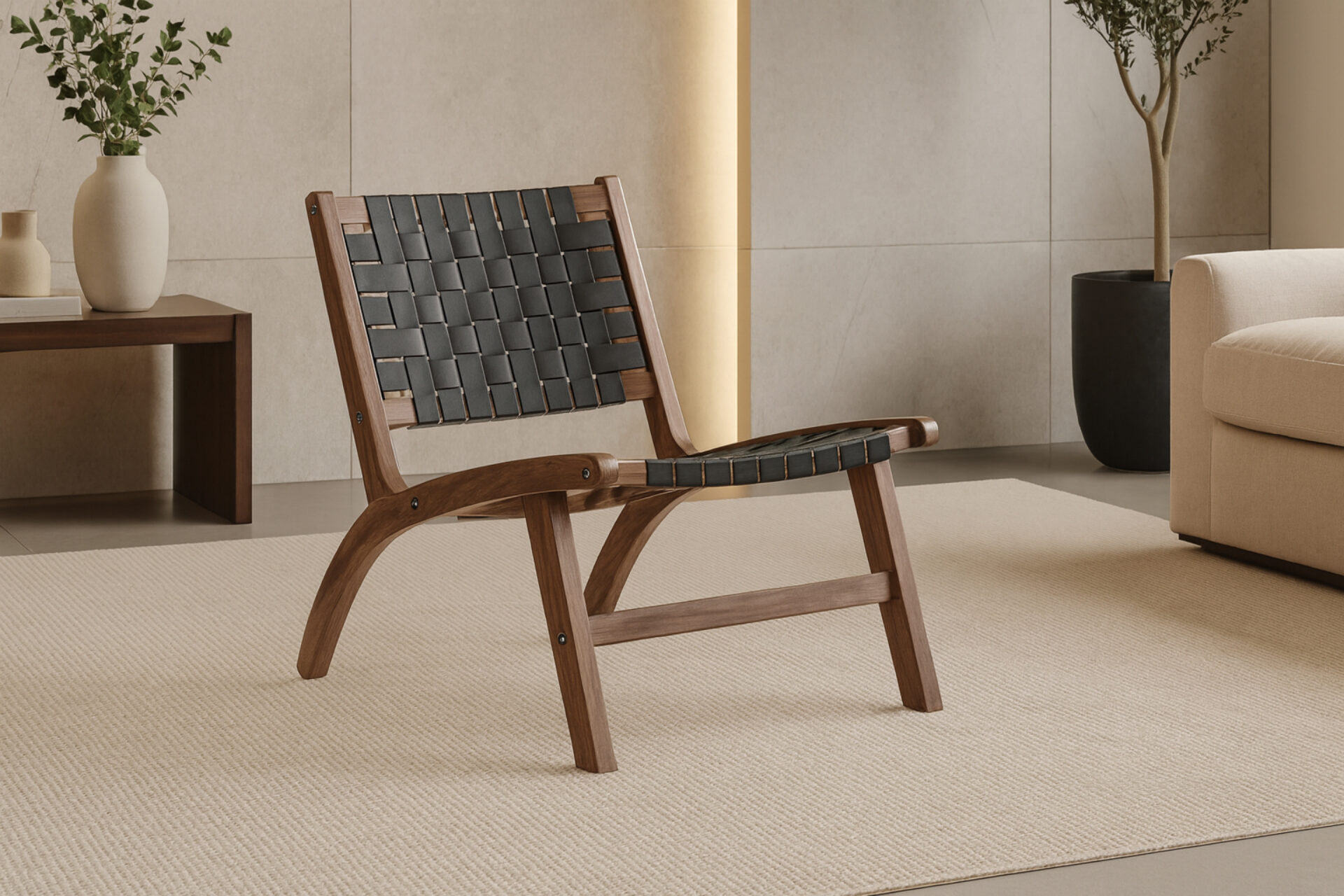 The Elena Accent Chair in rich walnut wood pairs timeless craftsmanship with sleek black vegan leather for a bold, elegant statement. Its sculpted wooden frame provides lasting strength and support, while the supple seat ensures everyday comfort. Perfect for living rooms, lounges, or receptions, it balances warmth, depth, and sophistication. Designed with modern sustainability and classic appeal, the Elena Chair transforms any interior into a refined yet welcoming space. -