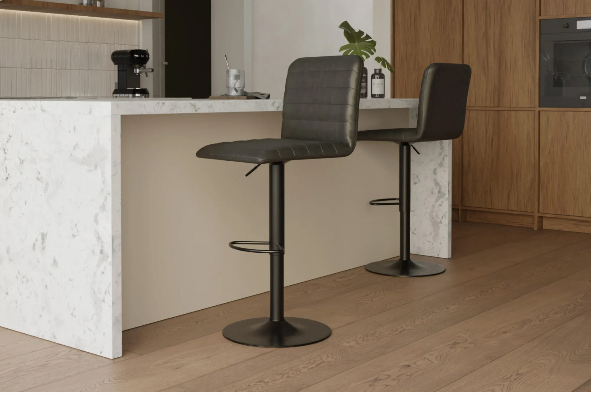 Bold and modern, the Arna Barstool pairs sleek black vegan leather with a matching black base. Compact yet sturdy, it’s perfect for kitchens, bars, or offices.
