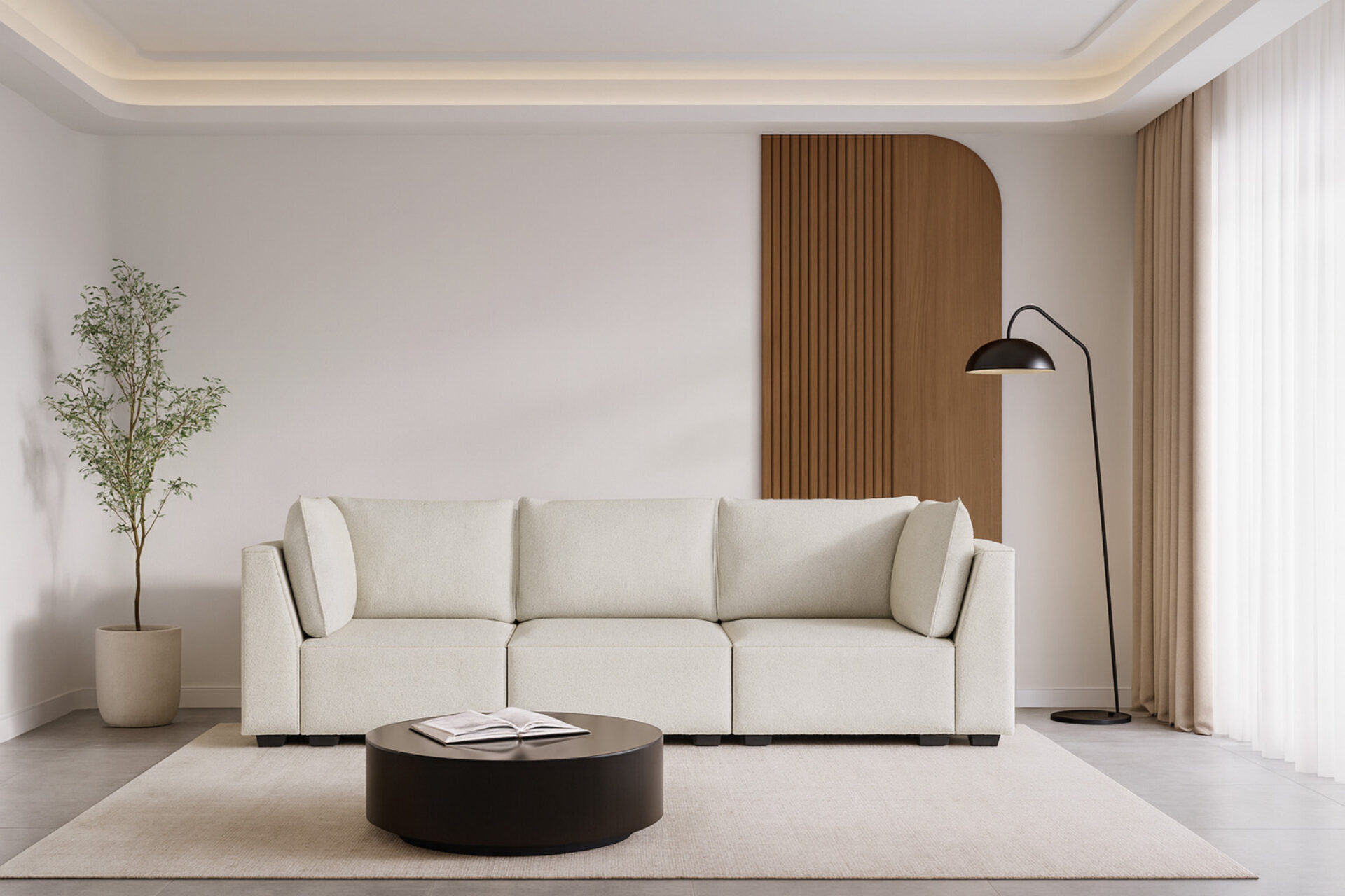 The Elaine Armless Module in White Bouclé reflects Nordic elegance with a minimalist touch, bringing timeless refinement to your home. Upholstered in soft bouclé, it adds warmth and texture while fitting seamlessly into any arrangement. Plush cushions and supportive seating provide lasting comfort and promote natural posture. Designed for versatility, it integrates effortlessly with other modules to expand or reshape your sofa. More than just a linking piece, Elaine creates a welcoming retreat where family gathers, conversations flow, and quiet moments feel at home. -