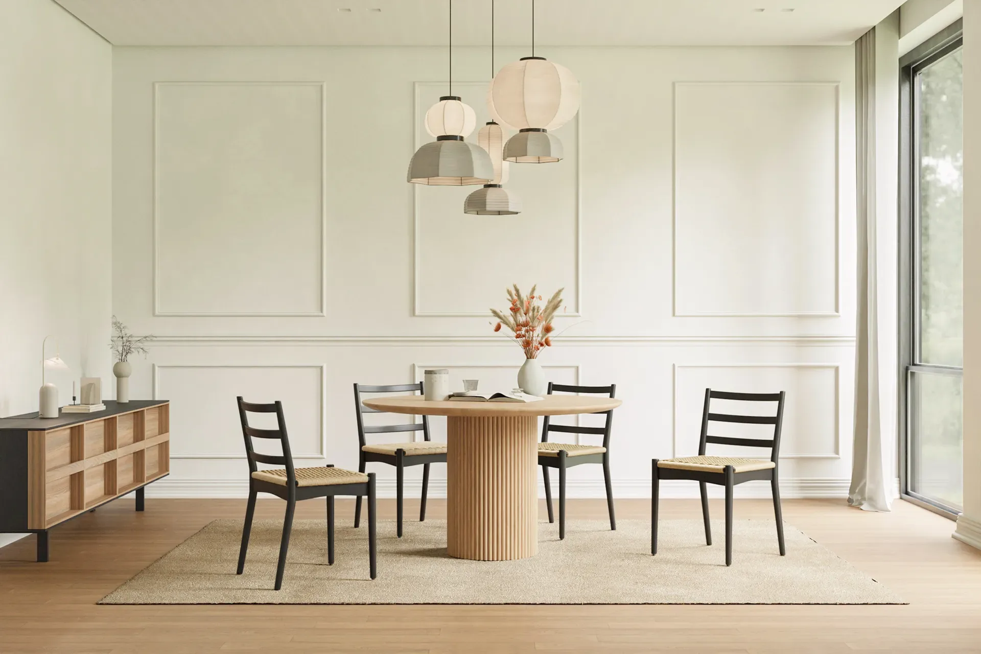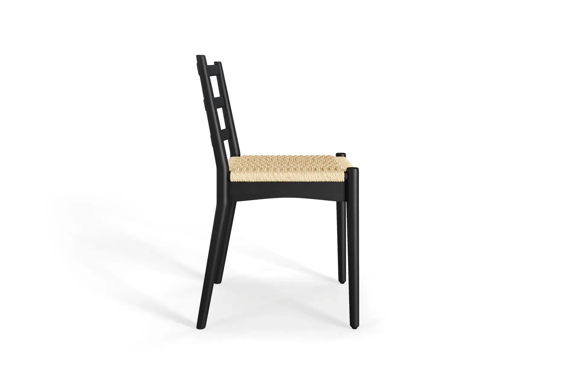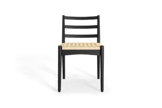 Crafted from solid wood with a deep black finish, the Raylan Chair pairs bold contrast with natural warmth. Its handwoven paper cord seat adds breathability, while the curved backrest ensures ergonomic comfort—bringing timeless sophistication and balance to your dining space.