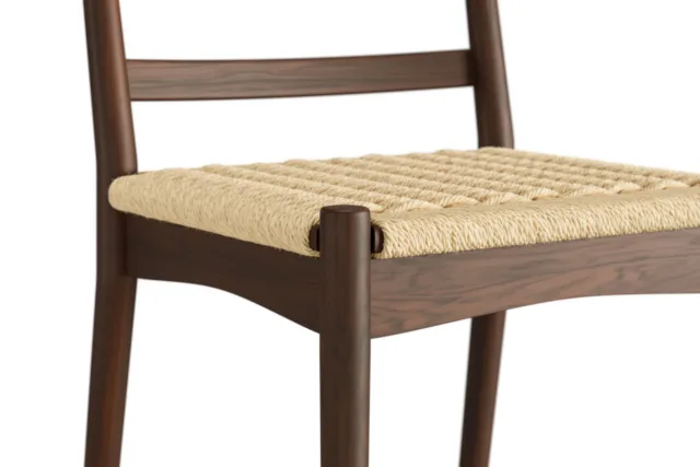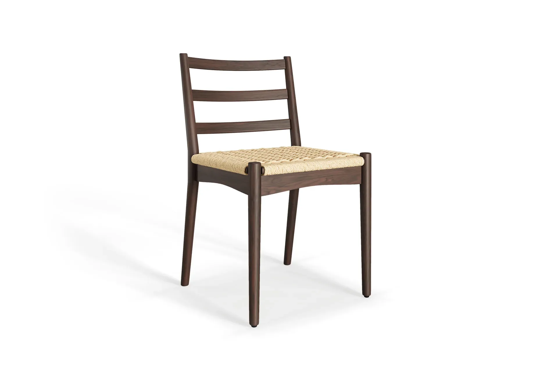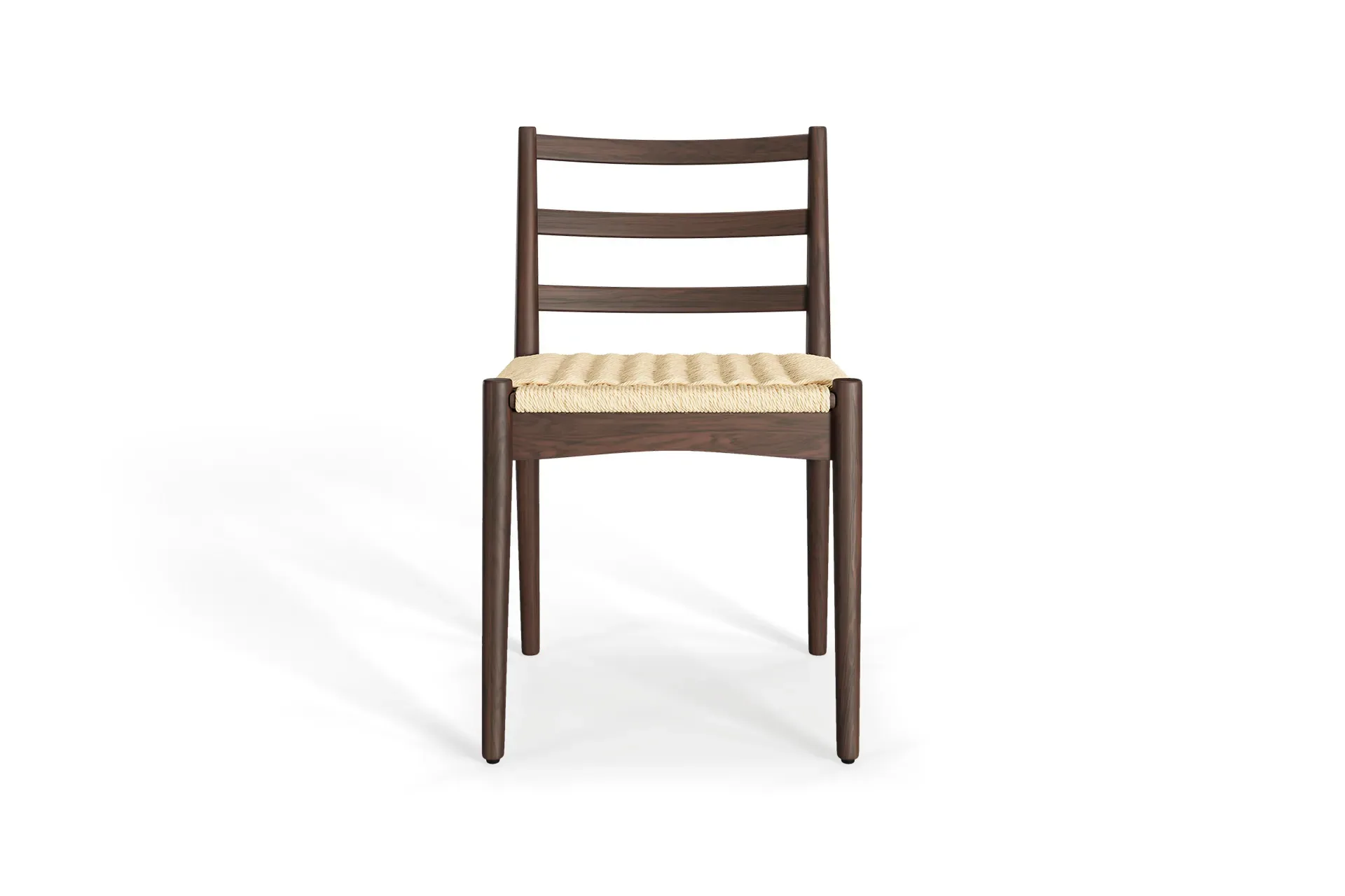 The Raylan Dining Chair in walnut brings depth and quiet refinement to your dining space. Crafted from solid wood with a natural woven paper cord seat, it combines durability with a sense of timeless beauty. Its curved backrest enhances comfort for lingering over meals or conversation. The rich walnut tone contrasts elegantly with the soft texture of the seat, creating a balanced expression of warmth and sophistication. A testament to mid-century craftsmanship, Raylan turns any dining room into a serene, welcoming retreat. -
