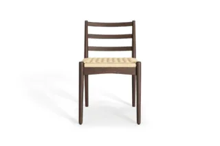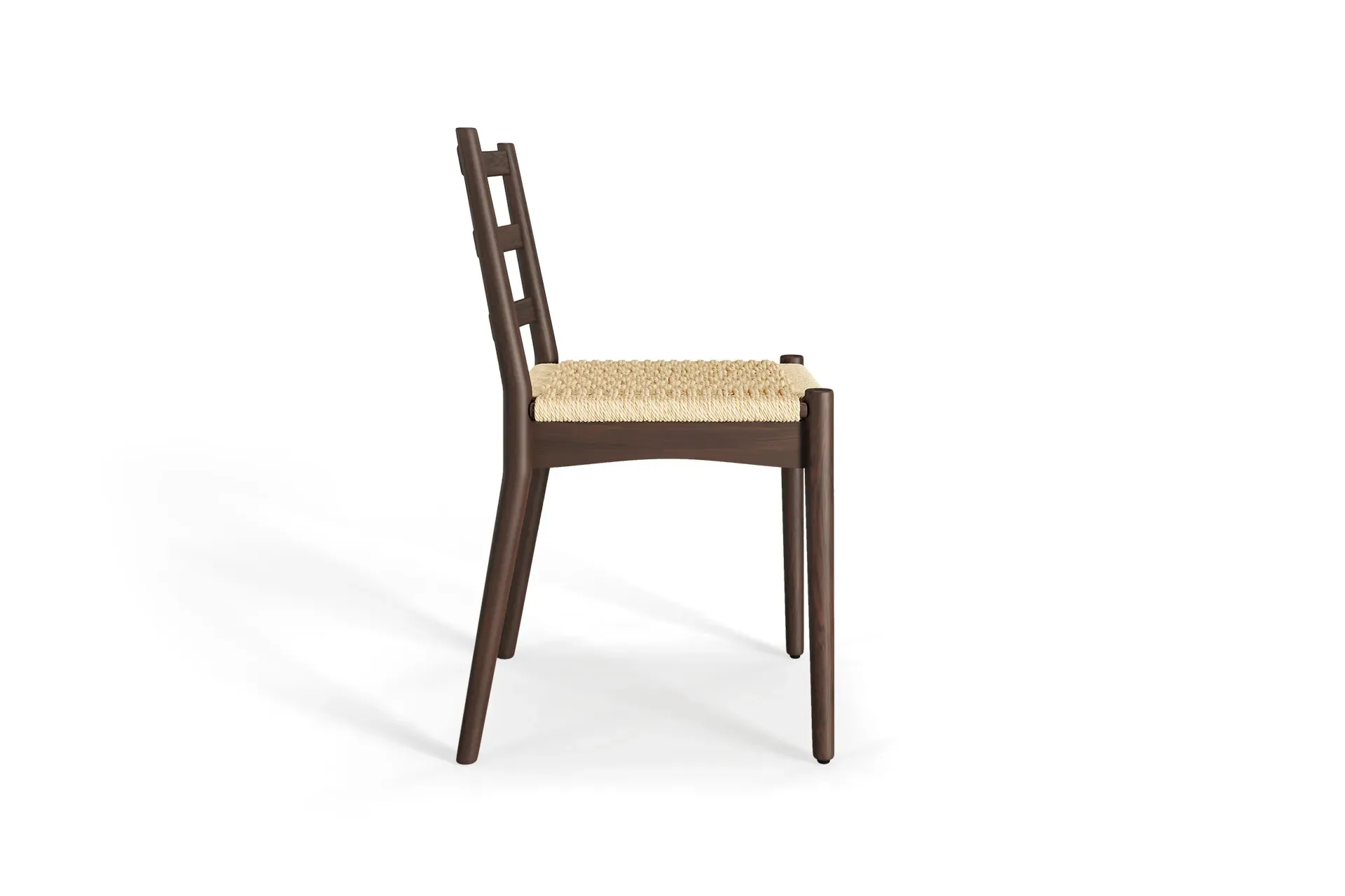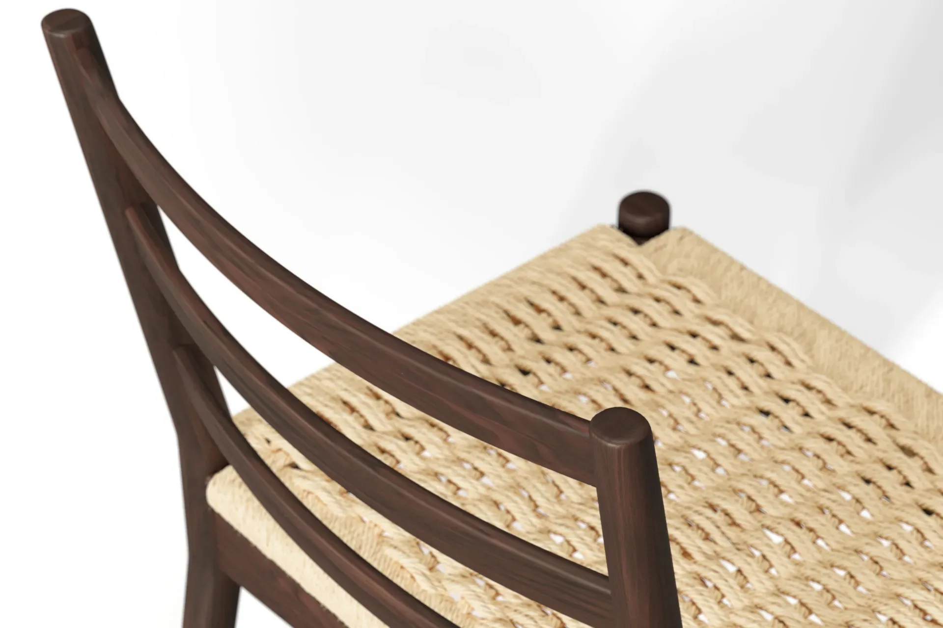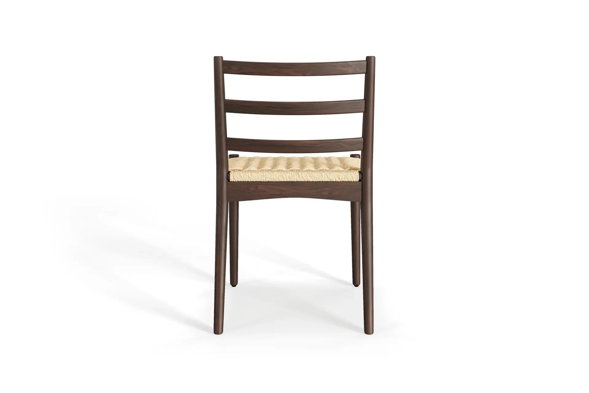 The Raylan Dining Chair in walnut brings depth and quiet refinement to your dining space. Crafted from solid wood with a natural woven paper cord seat, it combines durability with a sense of timeless beauty. Its curved backrest enhances comfort for lingering over meals or conversation. The rich walnut tone contrasts elegantly with the soft texture of the seat, creating a balanced expression of warmth and sophistication. A testament to mid-century craftsmanship, Raylan turns any dining room into a serene, welcoming retreat. -