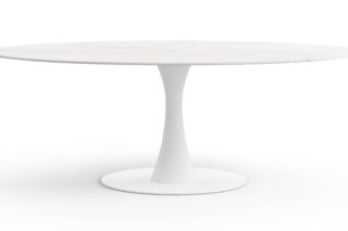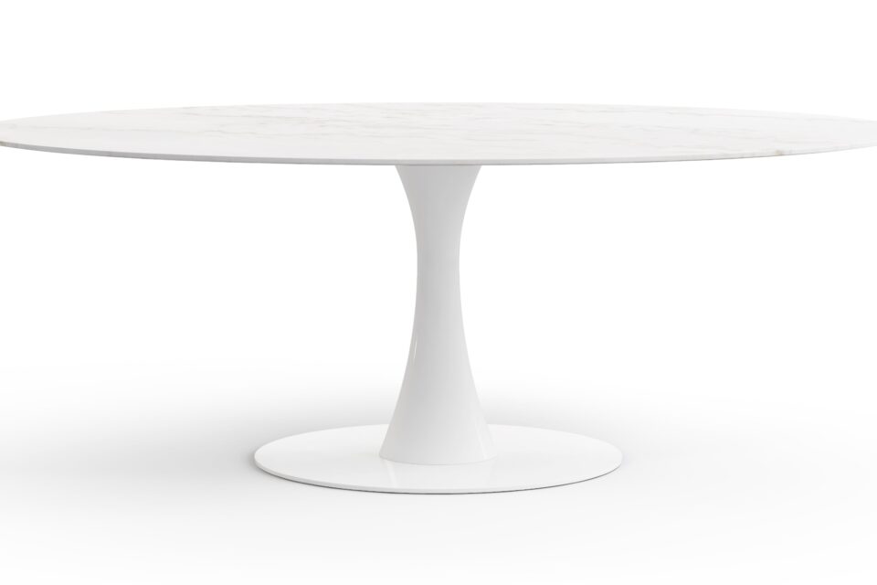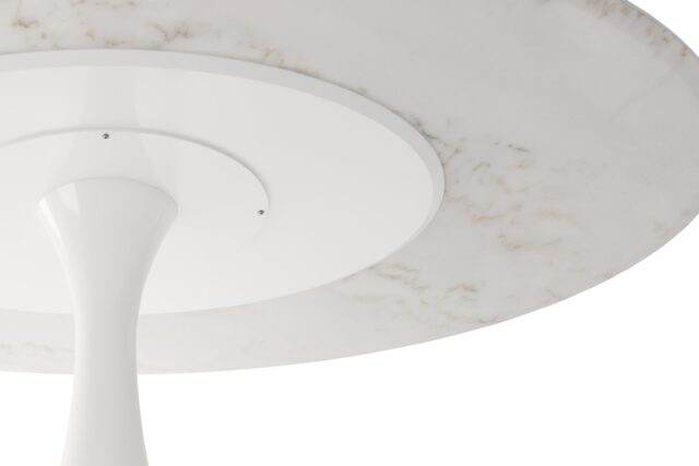 Elevate your space with the sophisticated Aarhus Table featuring a chic design and pedestal base that swaps traditional legs for a sleek yet sturdy central base. Inspired by mid-1950s futuristic aesthetics, this versatile piece doubles as a dining table or contemporary desk alternative, now available in a stunning Calacatta Marble finish. Upgrade your space with this impeccably minimalist, functional, and elegant furniture solution.