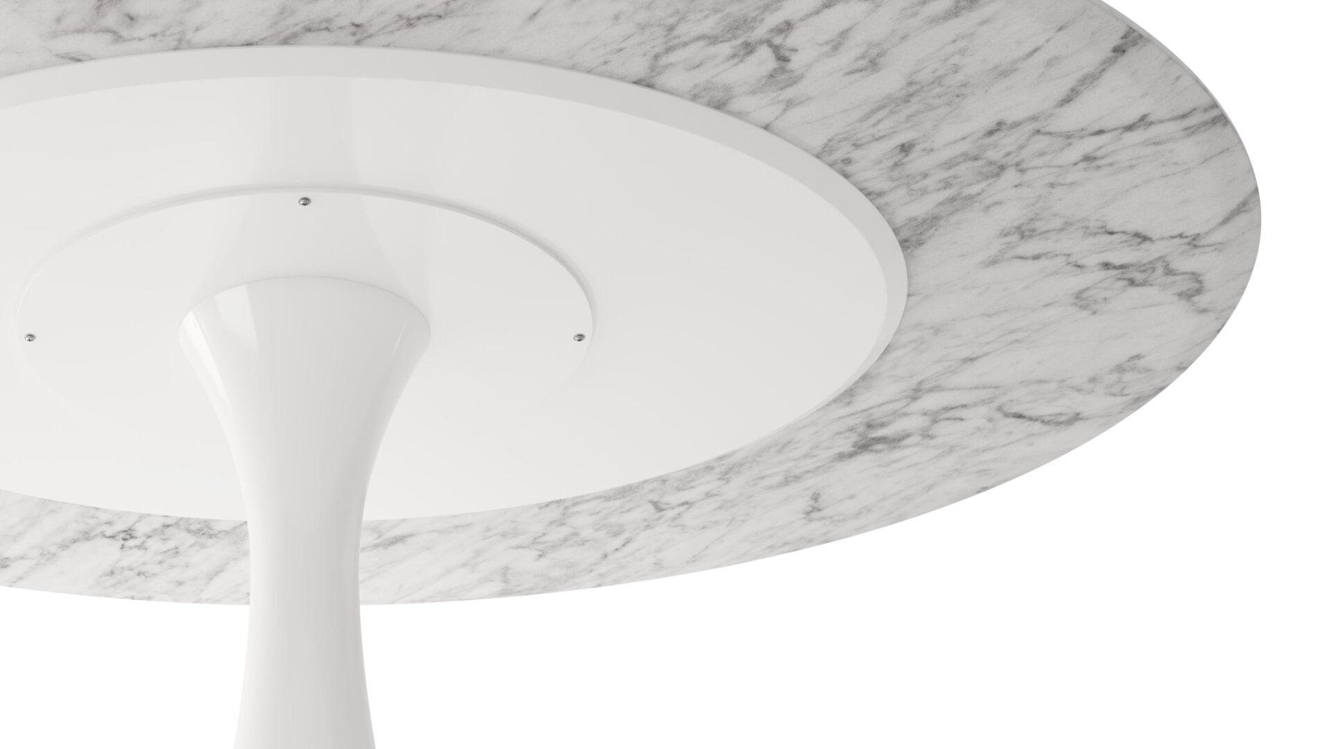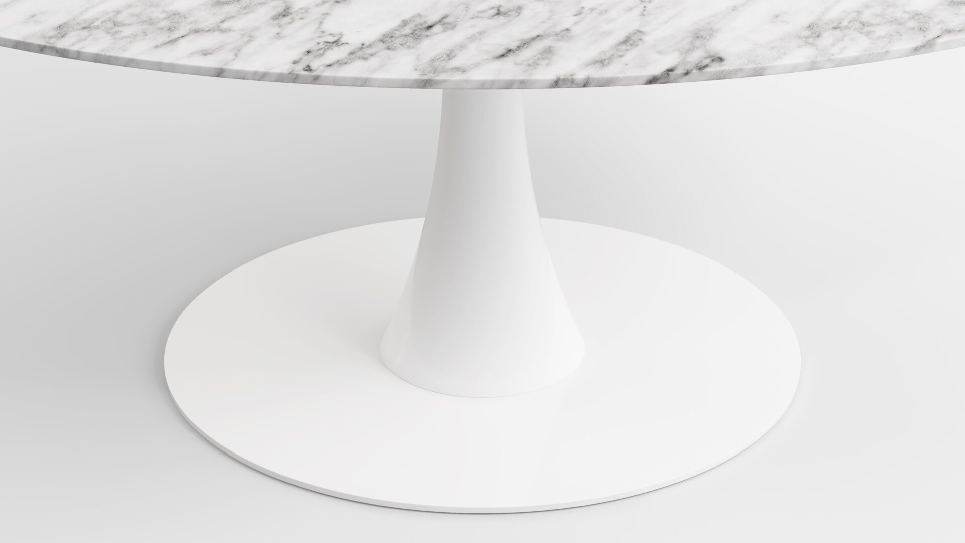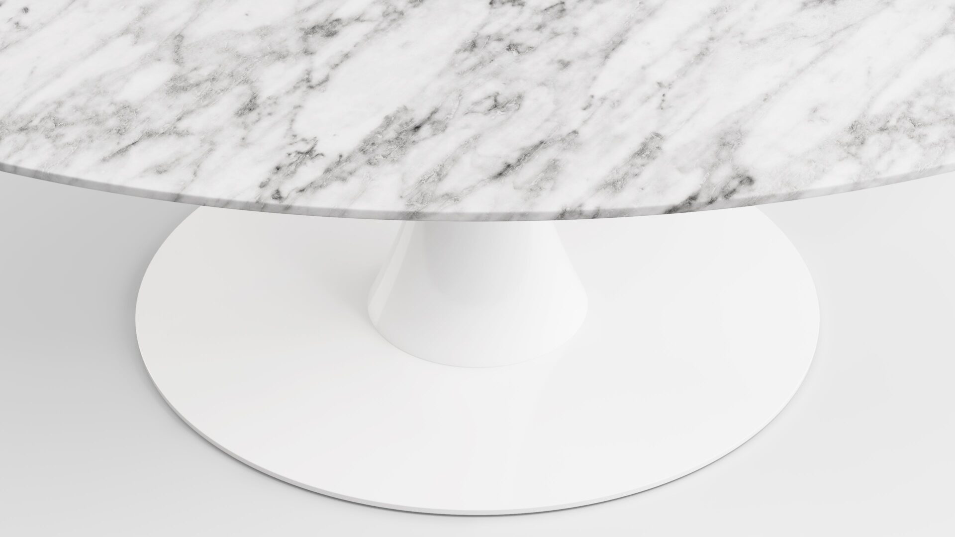 Introducing the Aarhus Table, a chic and modern masterpiece boasting a sleek pedestal base that swaps traditional legs for a sturdy central support. Inspired by mid-century futuristic aesthetics, this versatile piece functions as a stylish dining table or contemporary desk alternative. The Aarhus Table in Carrara Marble is a timeless, elegant addition that seamlessly elevates any space with its timeless design. Ideal for daily use and easy maintenance, this dazzling piece promises to transform your home into a sophisticated haven of style.