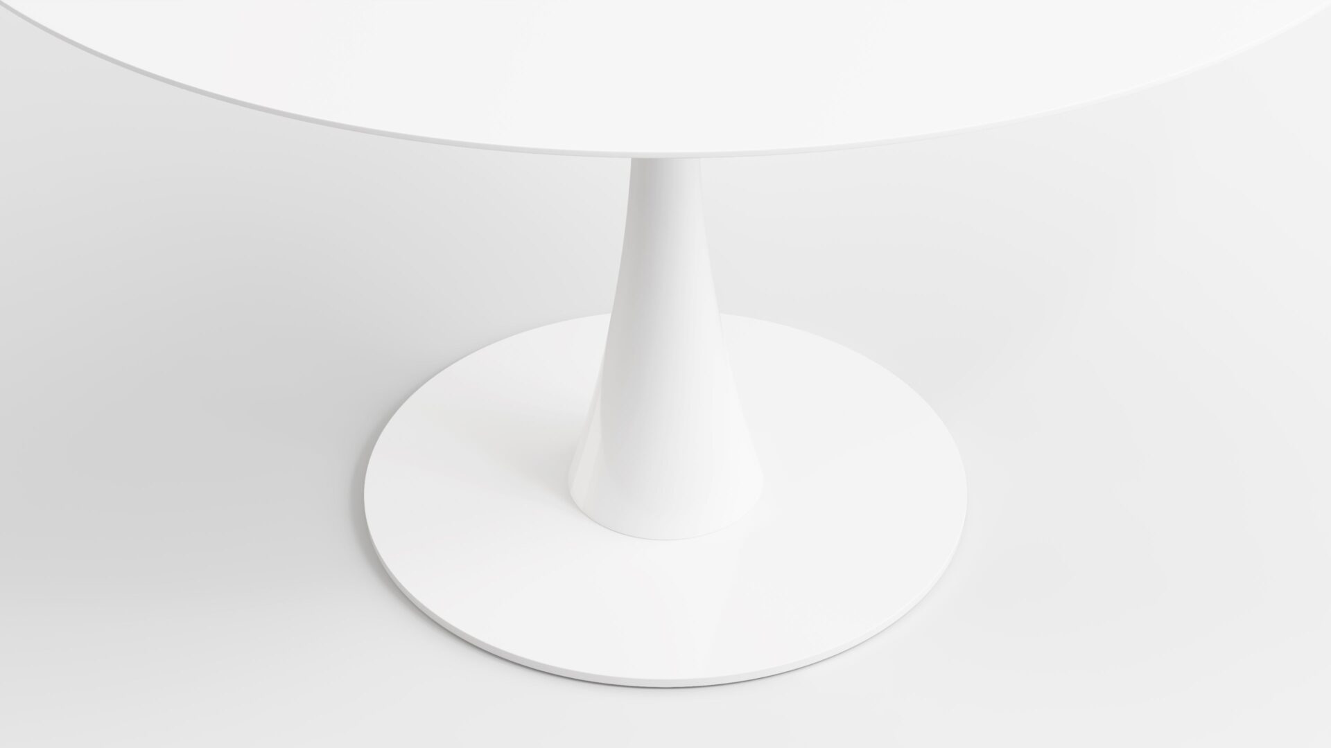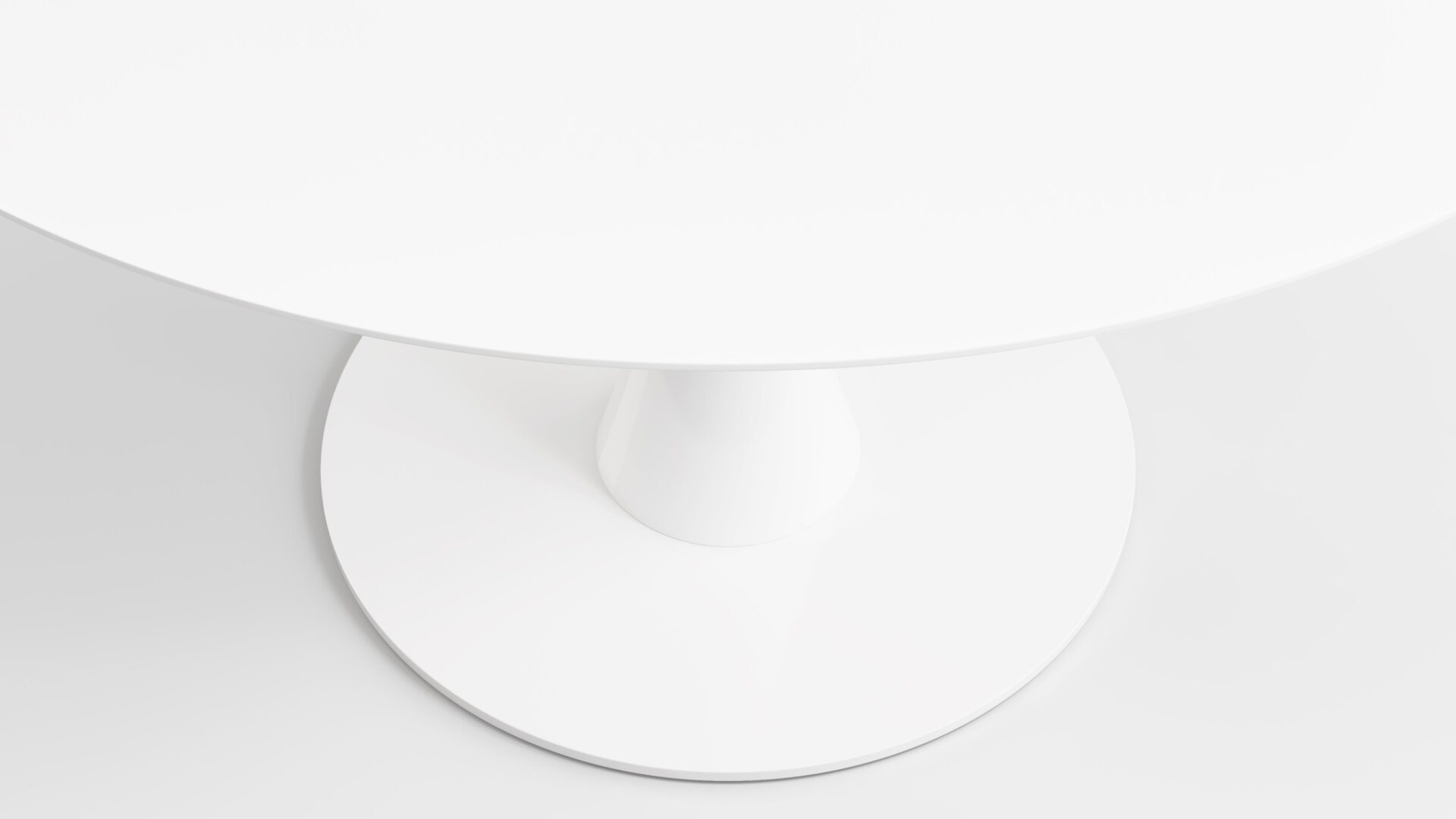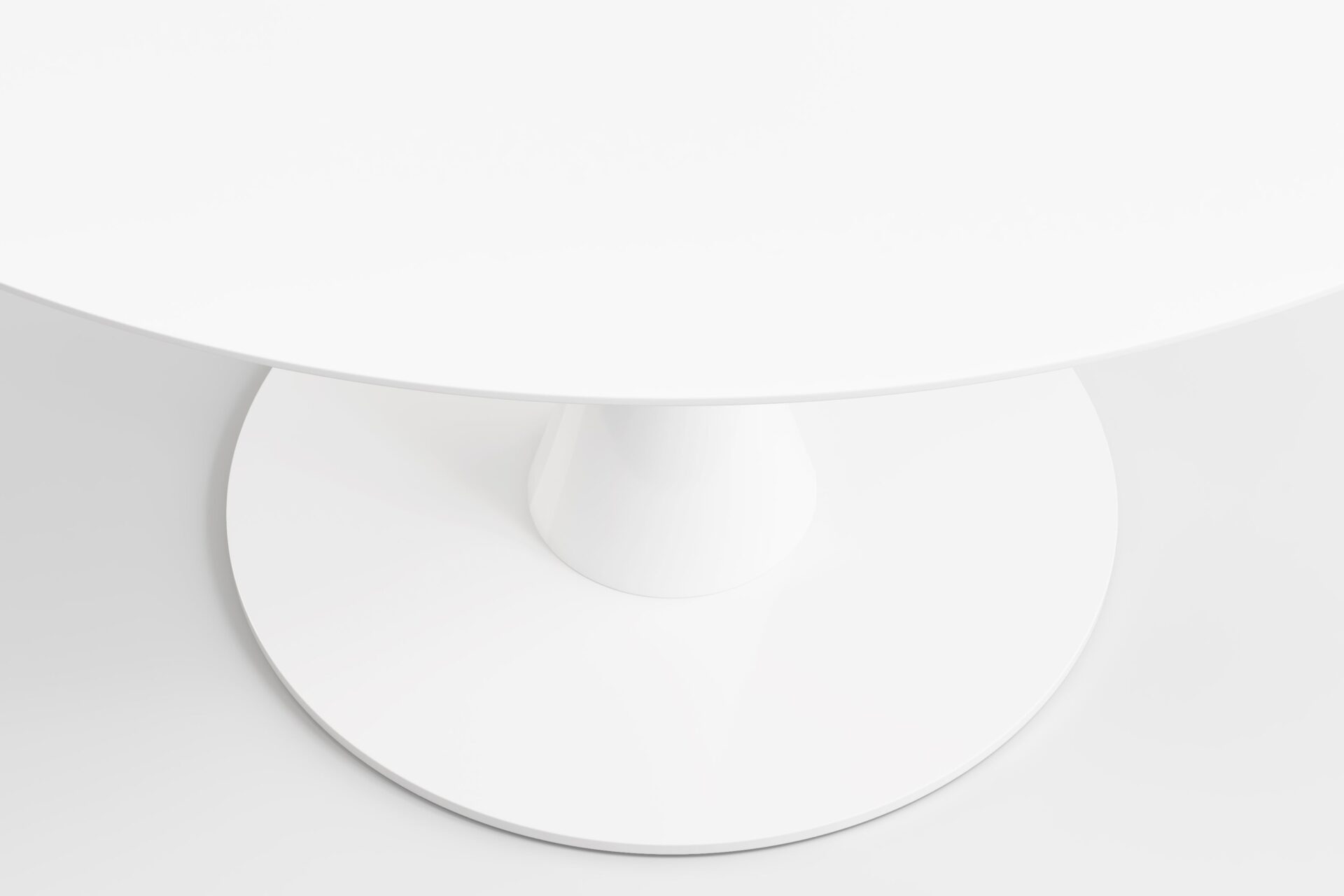 Revamp your space with the Aarhus Table, boasting a chic design and sturdy pedestal base that swaps traditional legs for a sleek central support. Inspired by futuristic mid-1950s aesthetics, this versatile minimalist piece serves as a dining table or contemporary desk. The white lacquer finish adds a touch of sophistication and durability, making it perfect for daily use, effortlessly blending in with any decor.