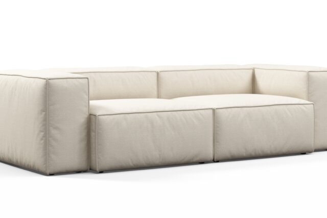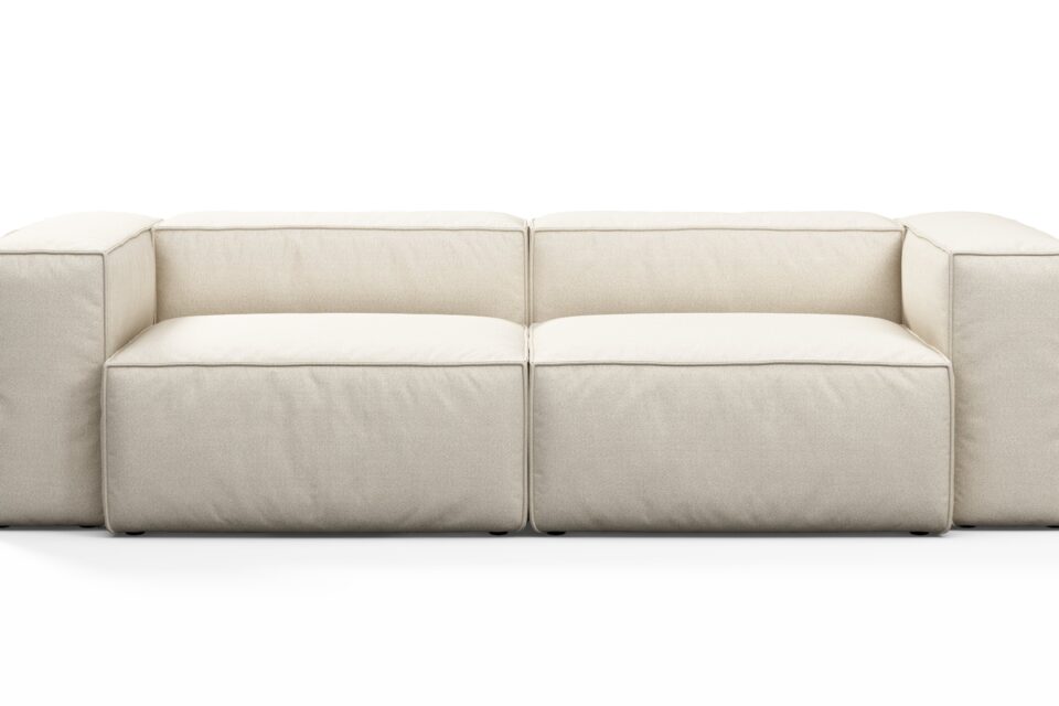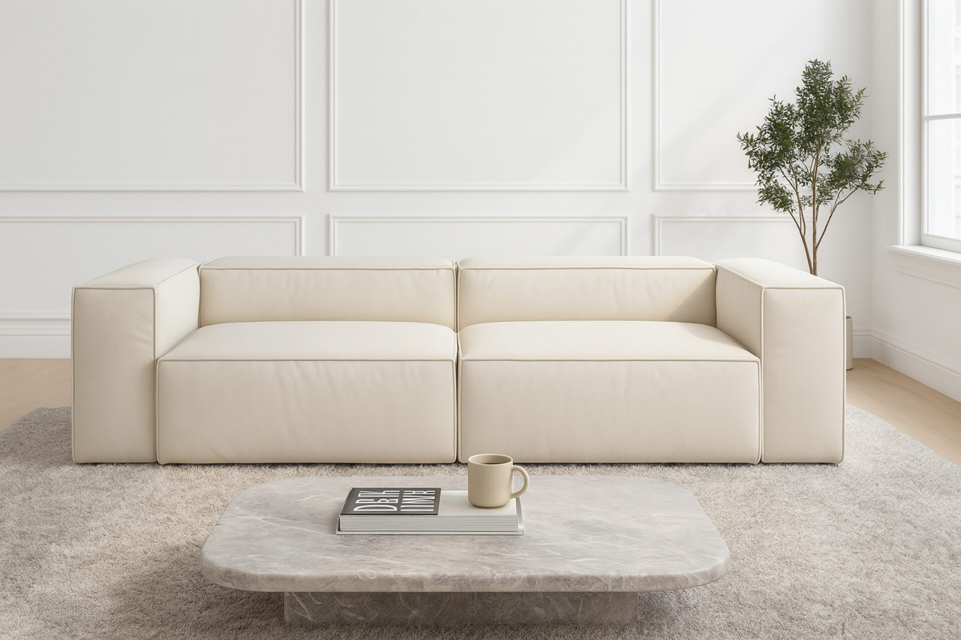 Introducing a collection showcasing a boxy silhouette with deep seating, enveloped in a neutral beige outdoor fabric and bolstered by a stylish aluminum frame, seamlessly merging contemporary design with resilient materials.