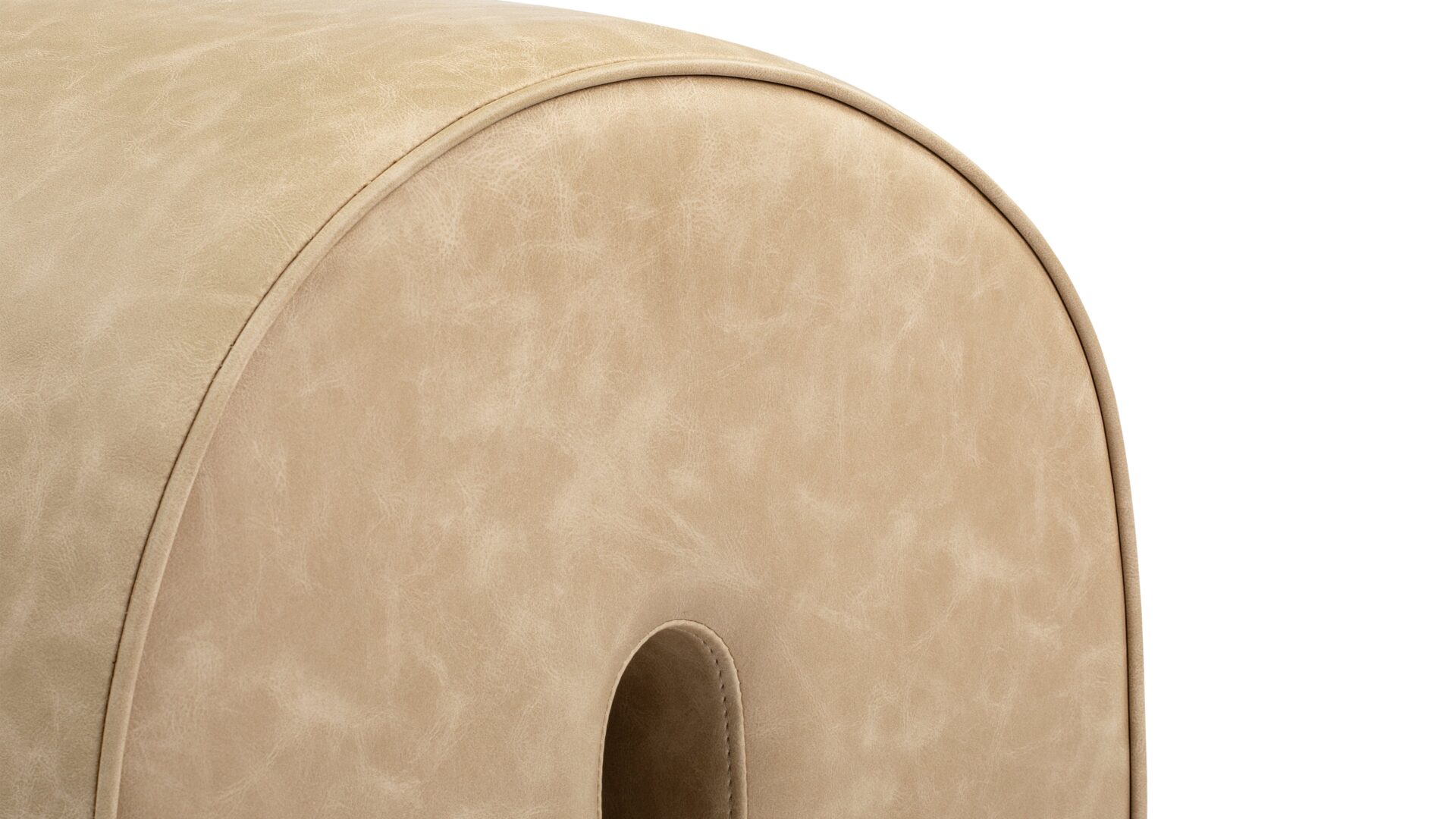 Elevate your living space with the Arch Ottoman, a fusion of contemporary style and practicality. Adorned in plush vegan leather, it boasts a velvety texture and eco-friendly standards. The sturdy wooden frame ensures durability, while the neutral beige hue seamlessly blends with any decor. Featuring an arched design and central cutout, this versatile ottoman serves as a modern focal point that offers comfort and chic sophistication.