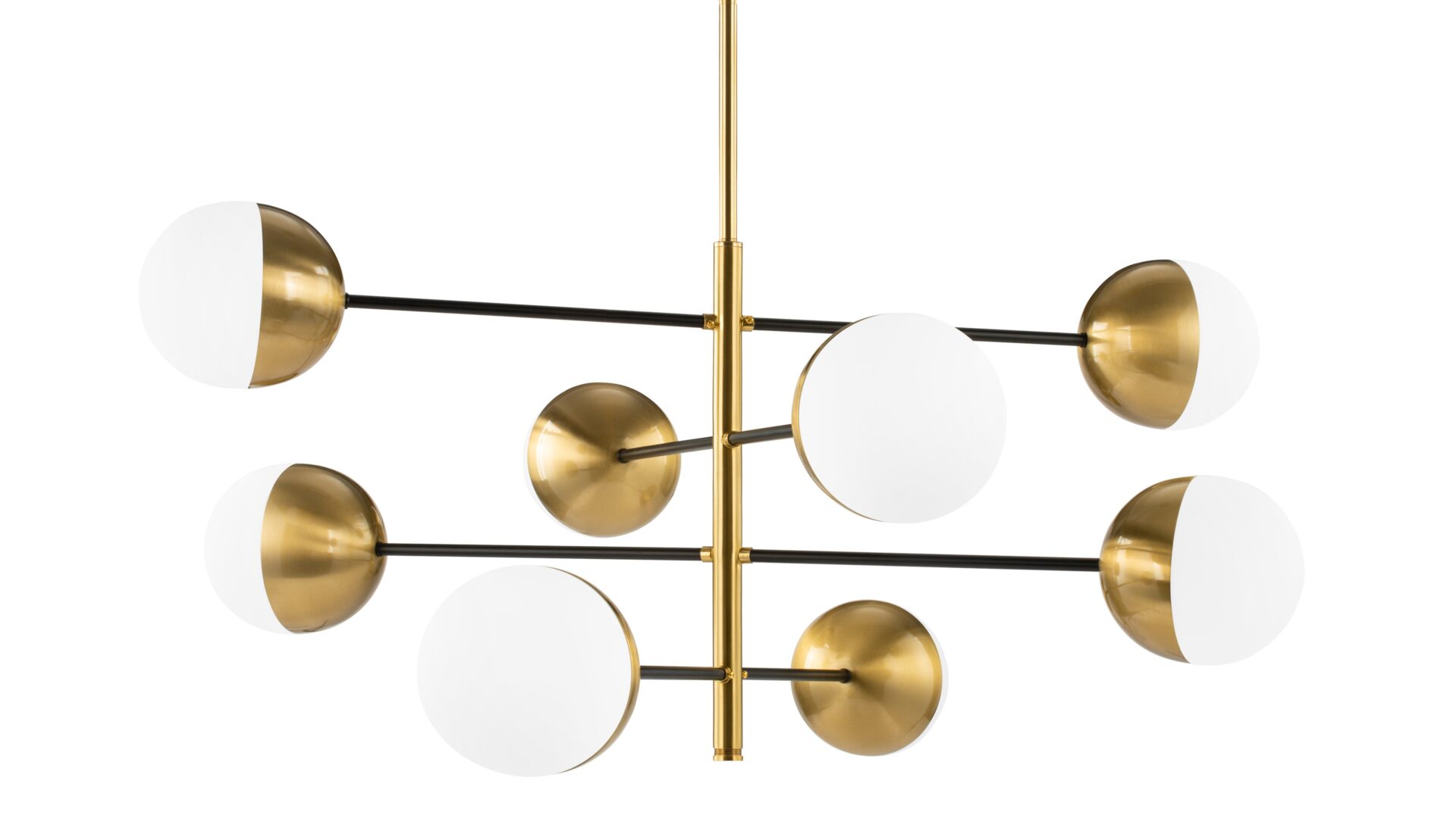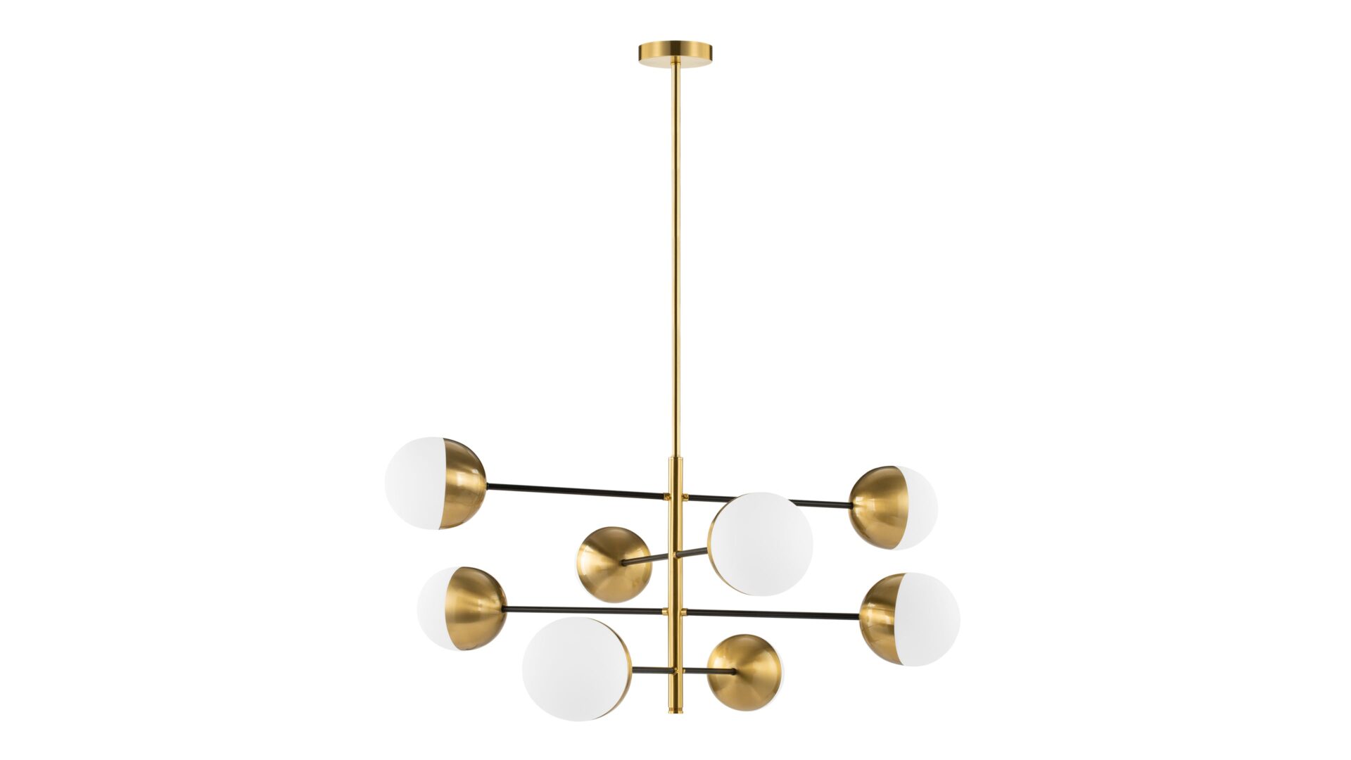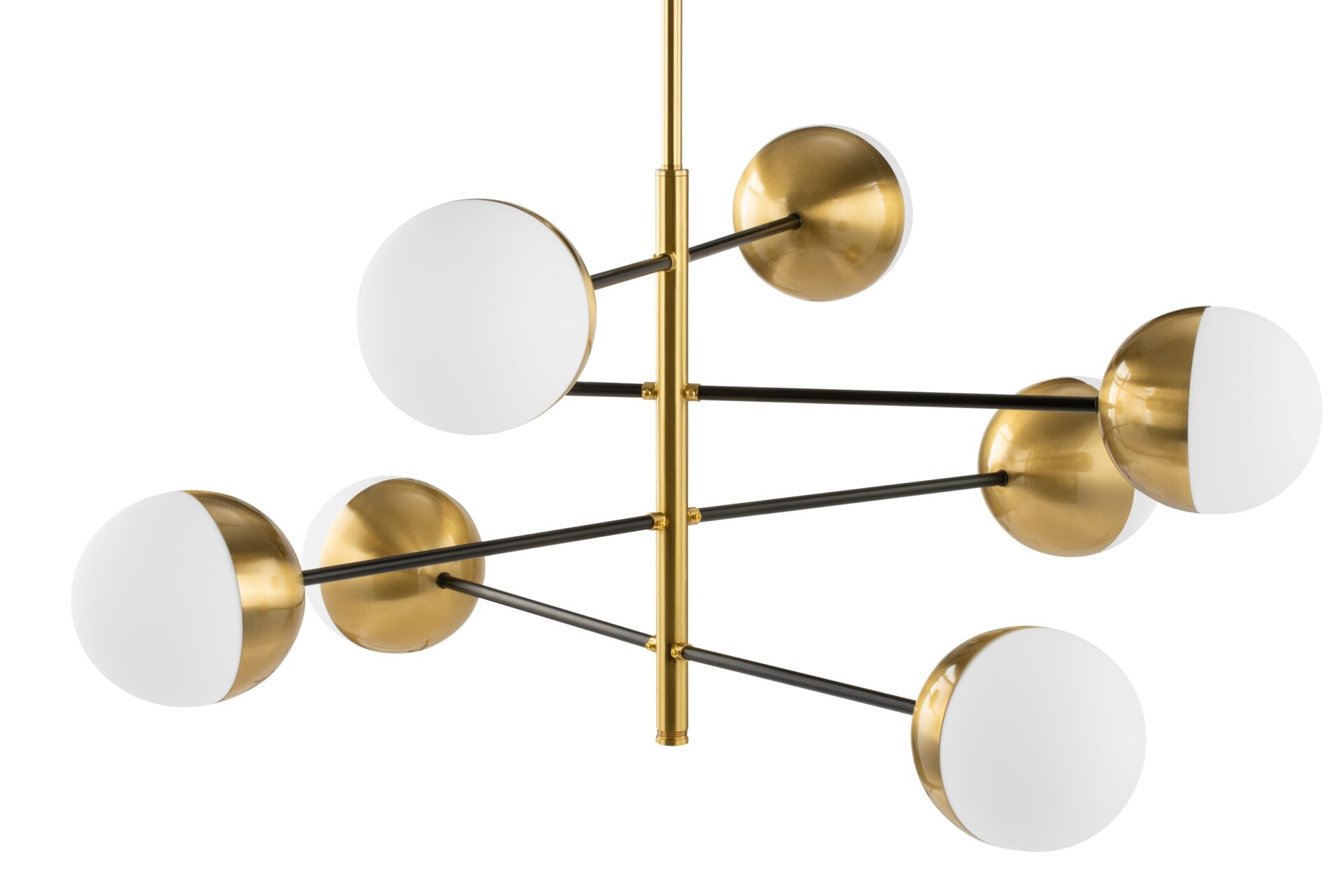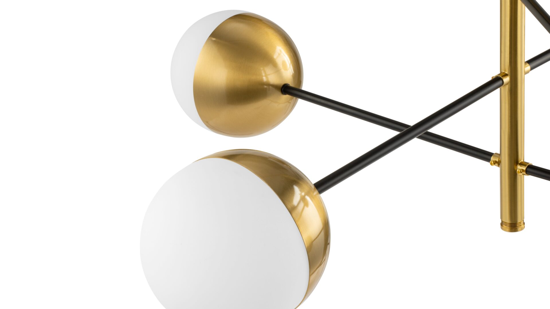 Illuminate your space with the Aurore Chandelier, a refined focal point blending contemporary design with ornamental sophistication. Crafted with brass finish and delicate white glass shades, this chandelier offers adjustable branches for customized lighting direction and intensity. Add elegance and charm to your living or dining area with its stylish and functional design.