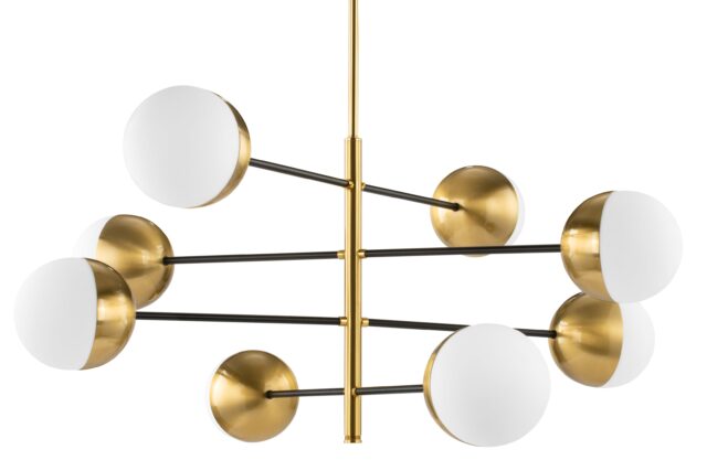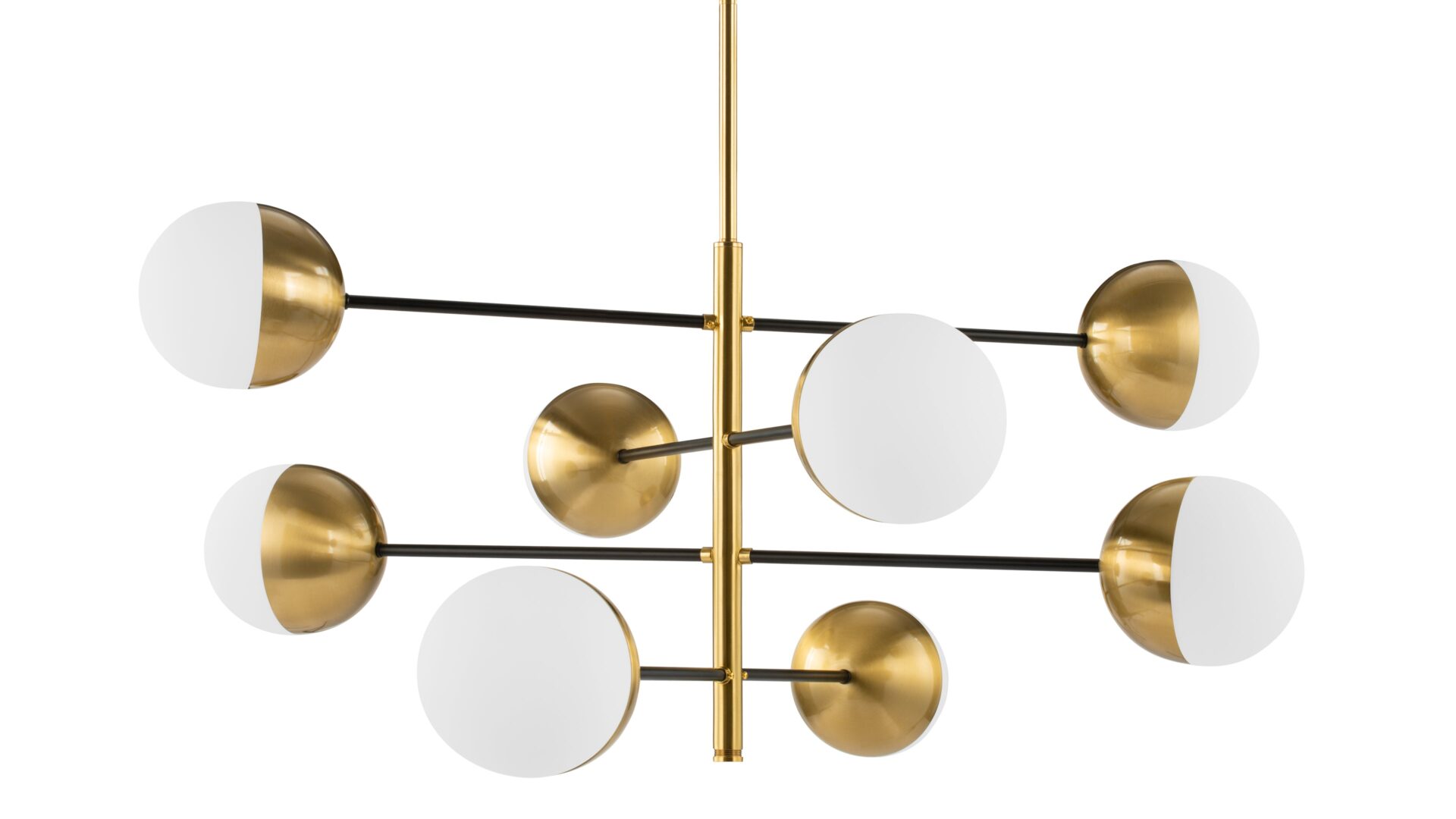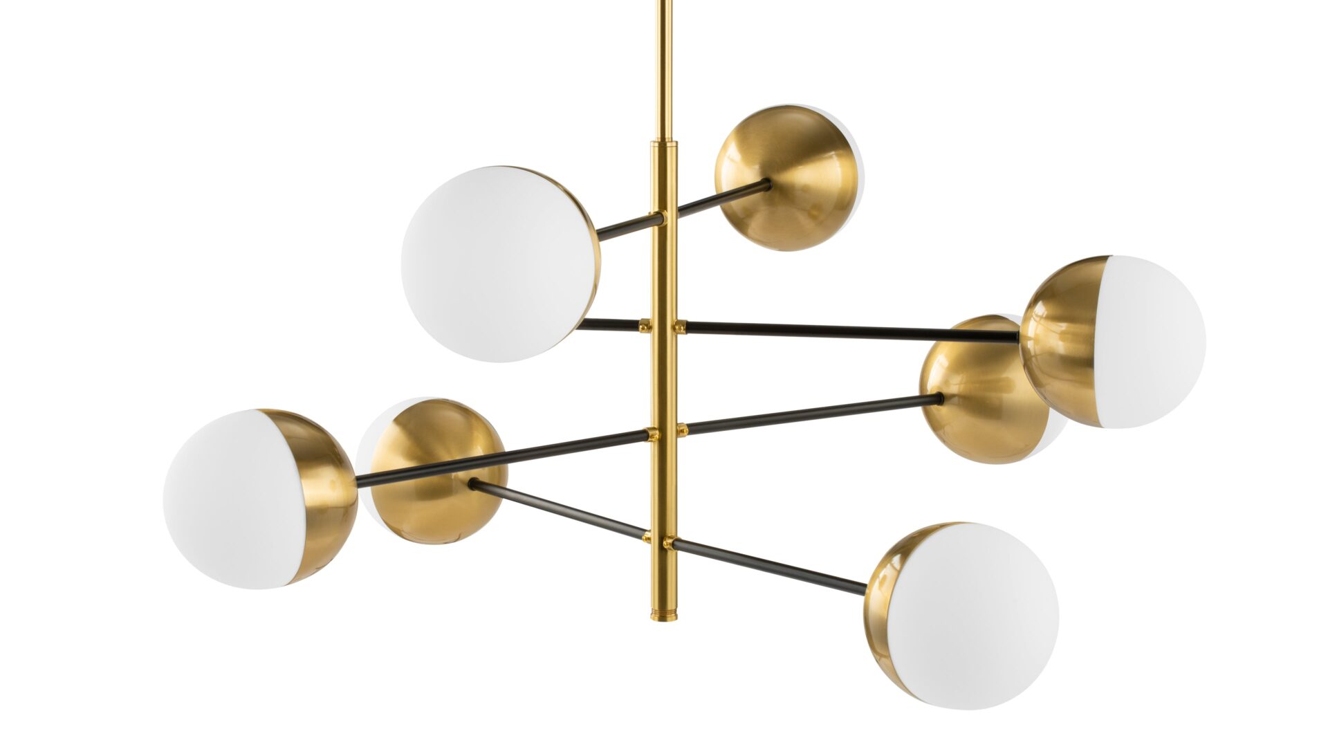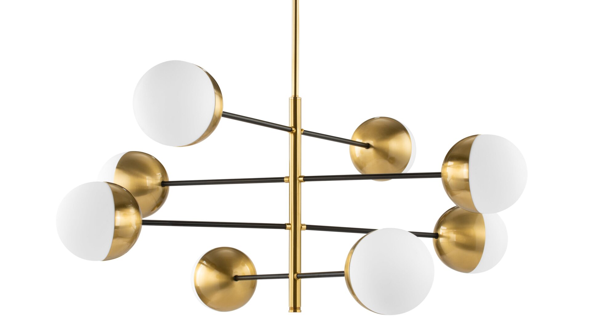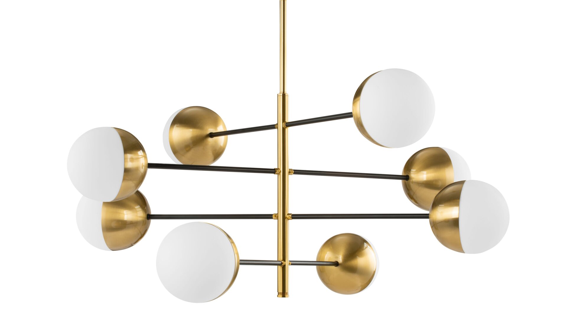 Illuminate your space with the Aurore Chandelier, a refined focal point blending contemporary design with ornamental sophistication. Crafted with brass finish and delicate white glass shades, this chandelier offers adjustable branches for customized lighting direction and intensity. Add elegance and charm to your living or dining area with its stylish and functional design.
