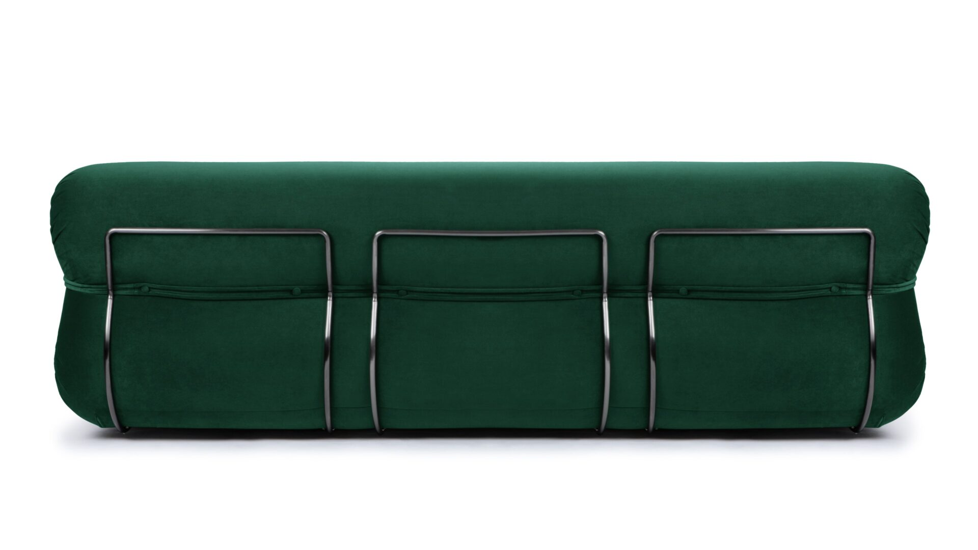 Discover the Bao Three Seater Sofa, showcasing a luxurious velvet in a rich green hue, elegantly paired with a sleek gunmetal gray metal frame. This sofa stands out with its distinctive thick piping detail along the back and seat cushions.