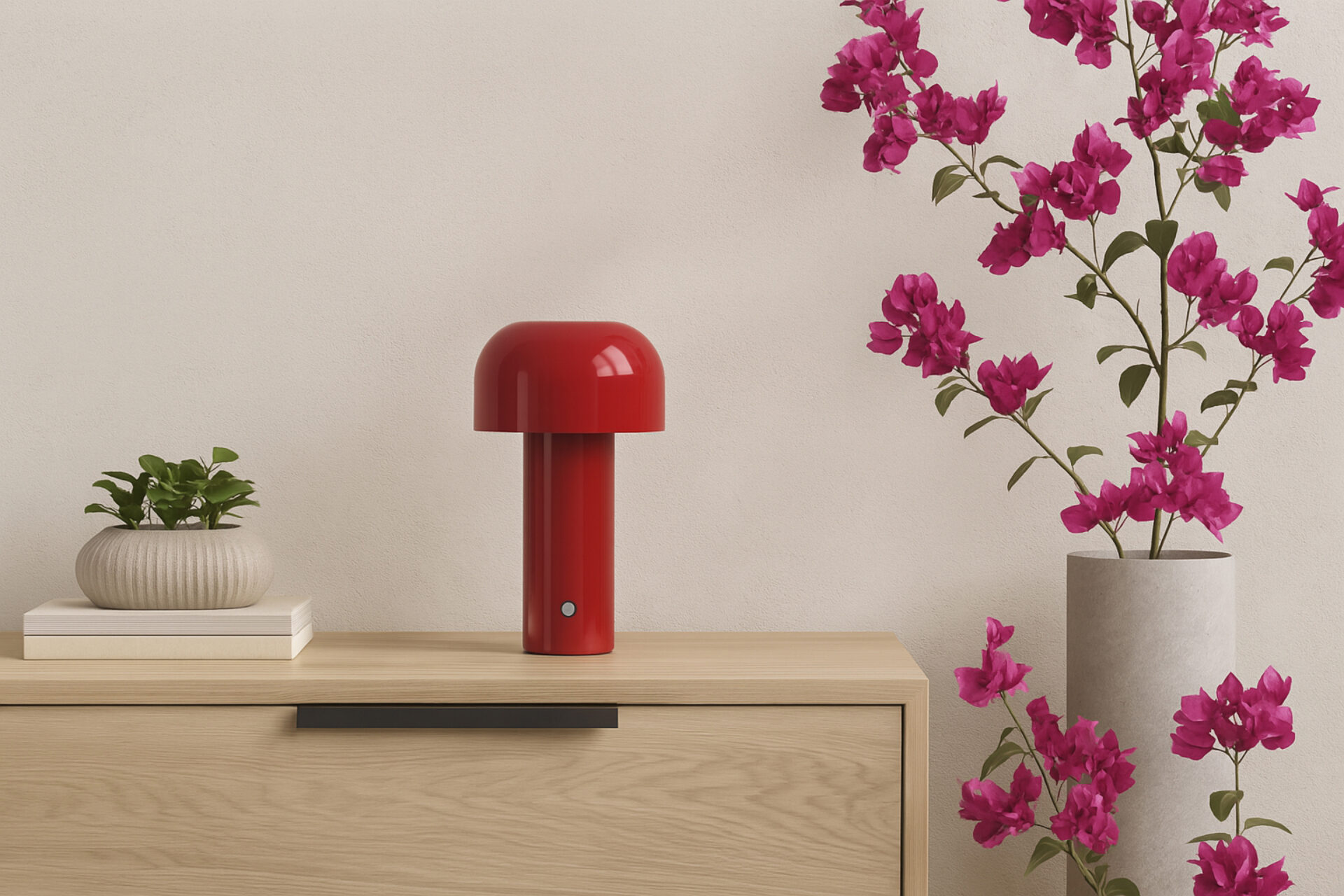 Introducing the Bellhop Table Lamp in vibrant Red, a true masterpiece of elegant lighting. This lamp boasts impeccable craftsmanship and minimalist design, offering seamless charging for hassle-free illumination. Its adaptability and portable structure, combined with a rechargeable battery, make it a striking addition to any contemporary setting. Transition effortlessly between rooms with this sophisticated piece that brings sophistication and grace to your décor.