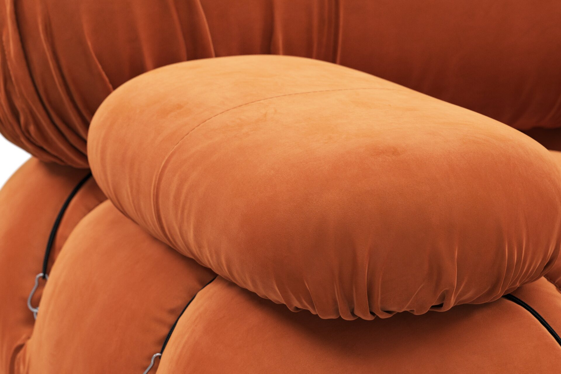 - Modular Instructions: Each section of the Mario Bellini Sofa is modular and is attached with string ties and carabiners. To assemble or rearrange your sofa, simply unclip the carabiners from one ring and attach to a corresponding ring on the module you wish to connect to.