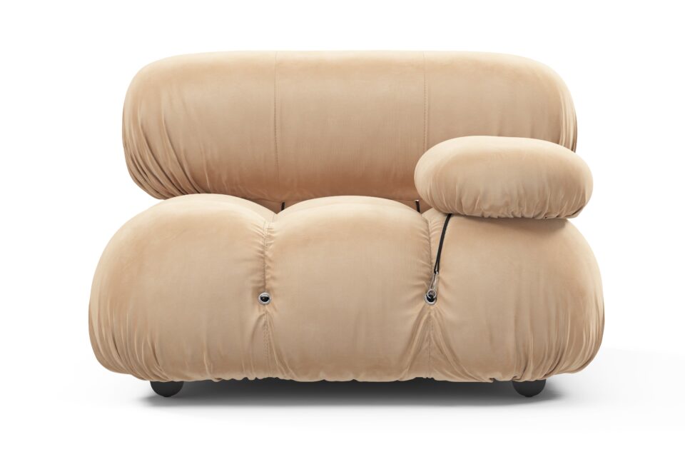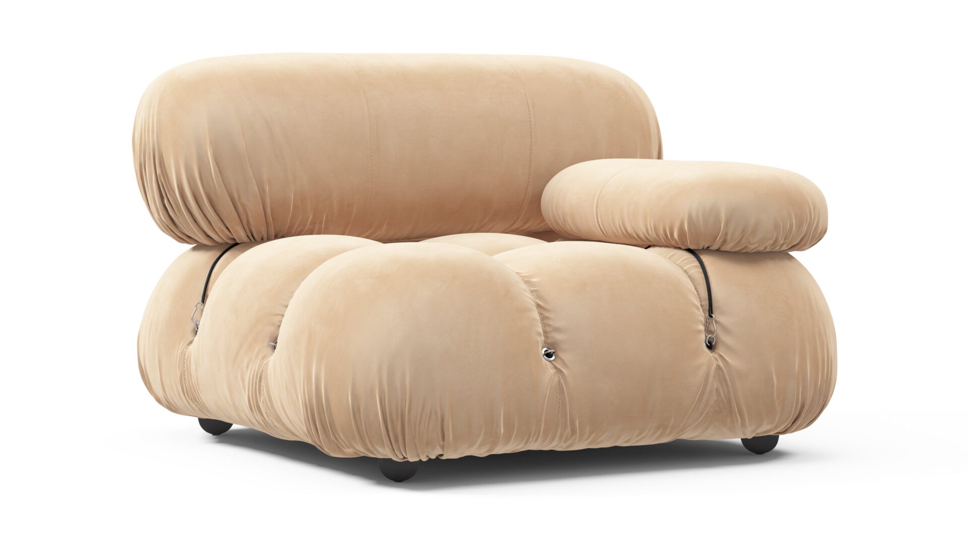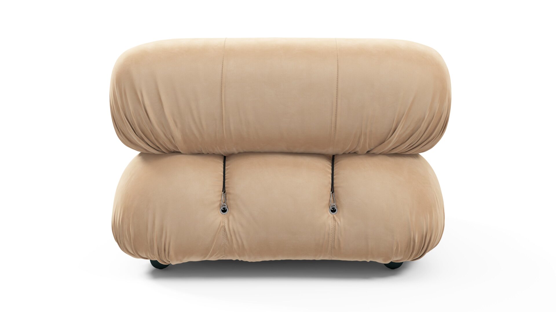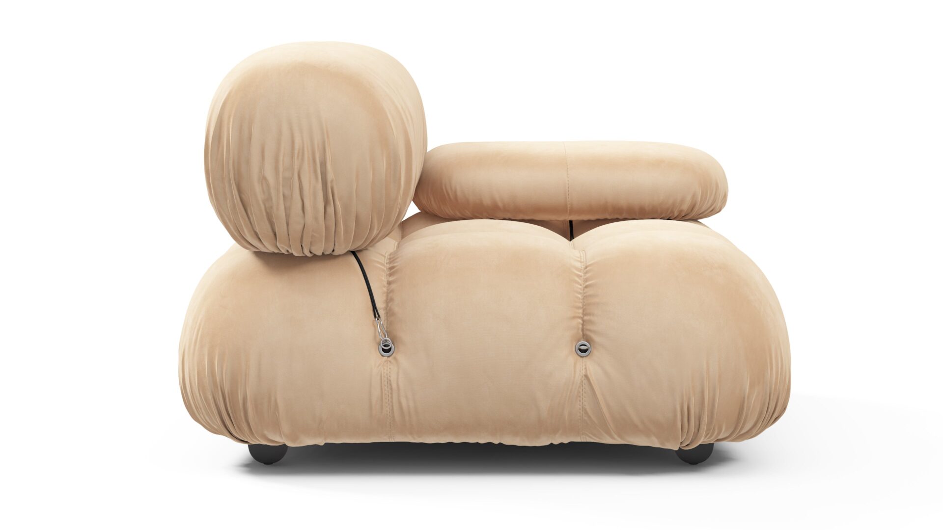 Step into the iconic '70s era with the Bellini sectional sofa, a modern homage to retro living. Its modular design allows effortless customization to suit your room layout and mood. Embraced by a new generation, the Bellini's versatile style features tie rods and rings for easy rearrangement, exuding relaxed luxury with plush ecru velvet upholstery on a sturdy wooden frame. Craft endless configurations to match your ever-evolving preferences and elevate your space with this liberating and stylish piece.