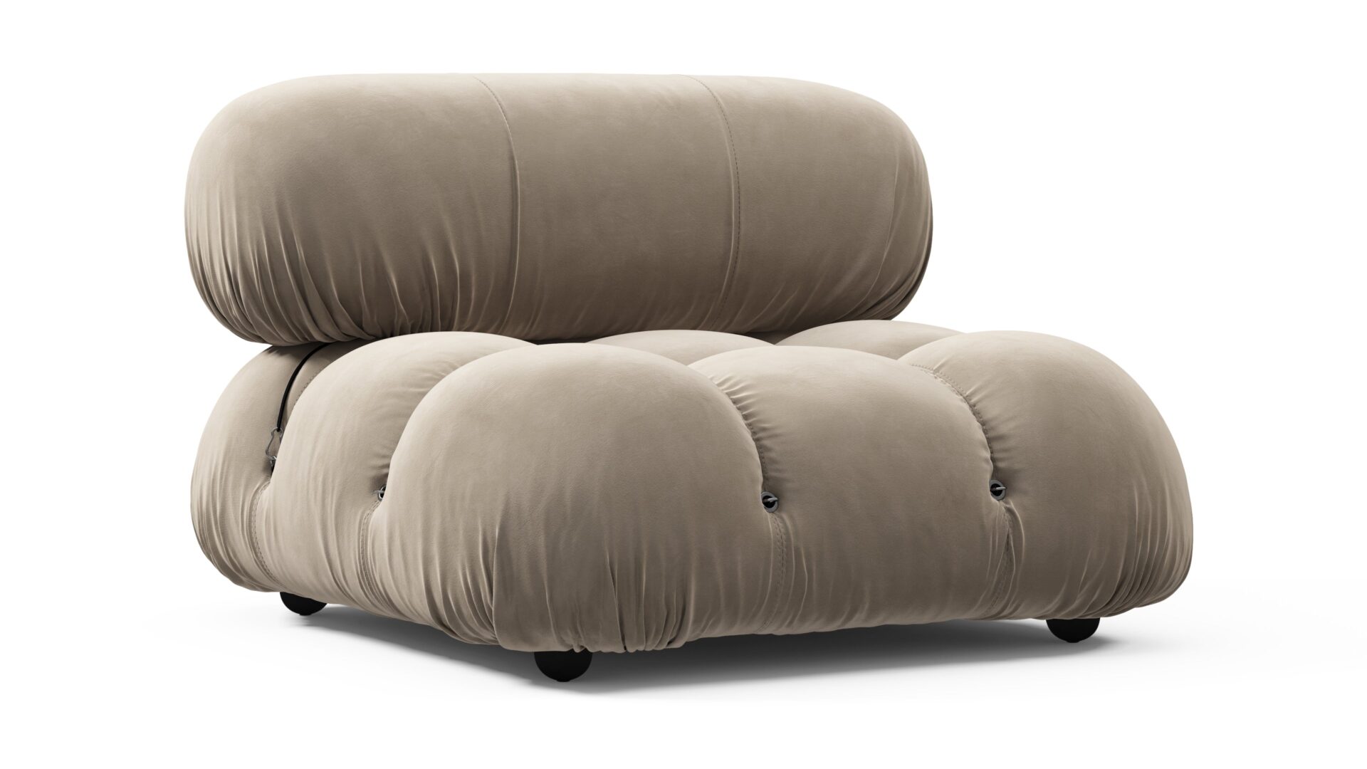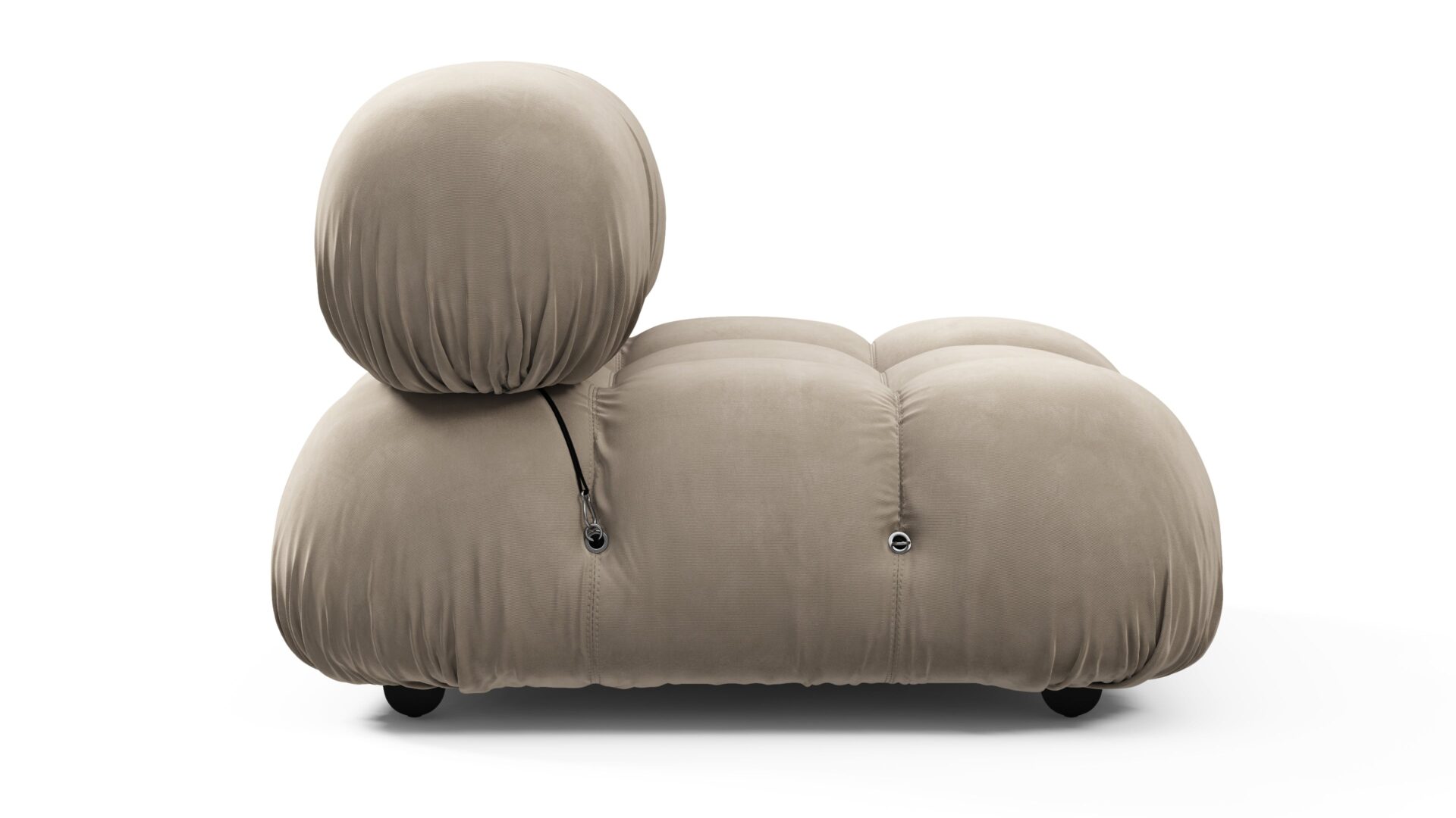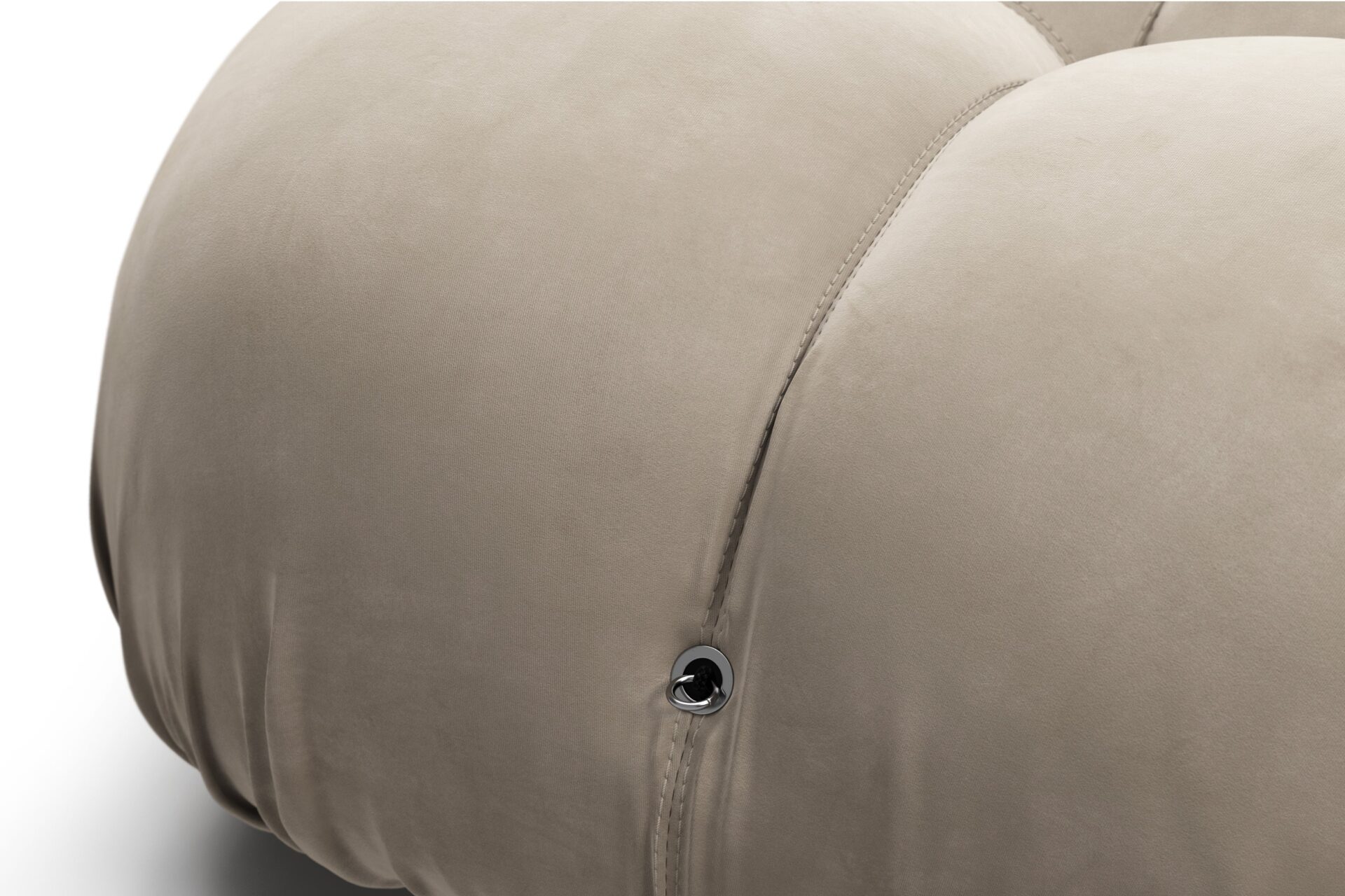Step back in time to the stylish 1970s with our Bellini sectional sofa, embodying retro vibes while defying traditional bulkiness. Designed for liberation, the modular Bellini offers customization options to suit your room layout and mood effortlessly. The newly beloved Bellini features tie rods and rings for easy rearrangement to match your evolving style preferences. Crafted with a sturdy wooden frame and plush cold-pressed foam enveloped in soft greige velvet, the low-profile Bellini brings relaxed luxury to any setting. Each inviting cushion invites you to unwind and elevate your space with versatile sectional design, promising unmatched style and comfort for a lavish seating experience.