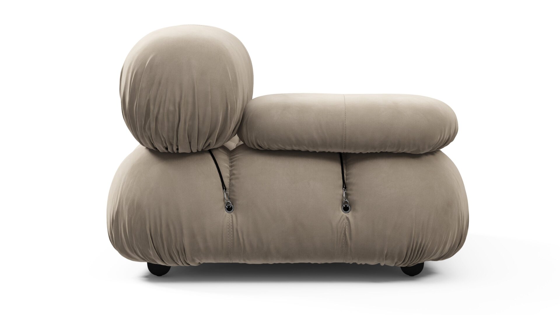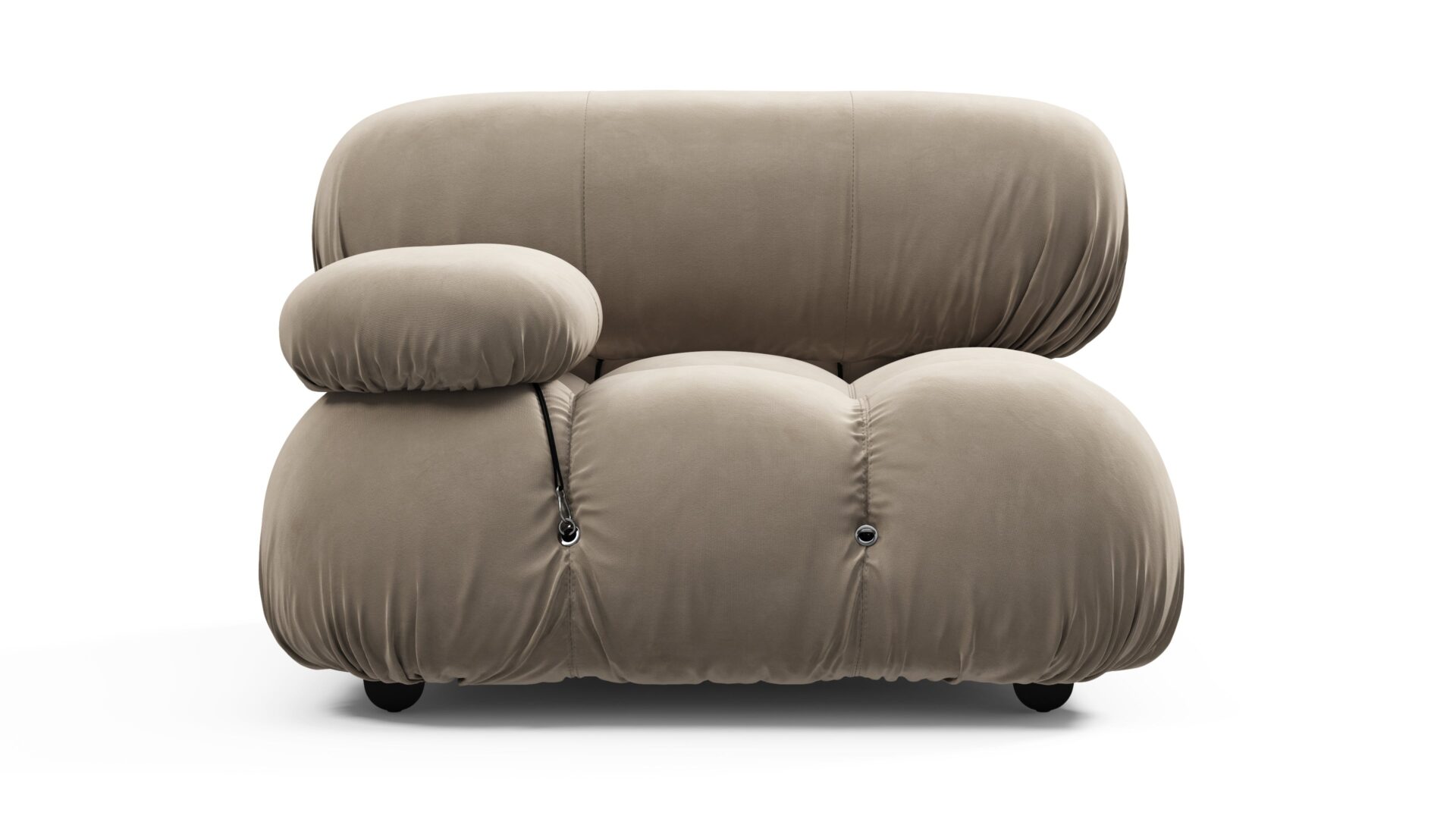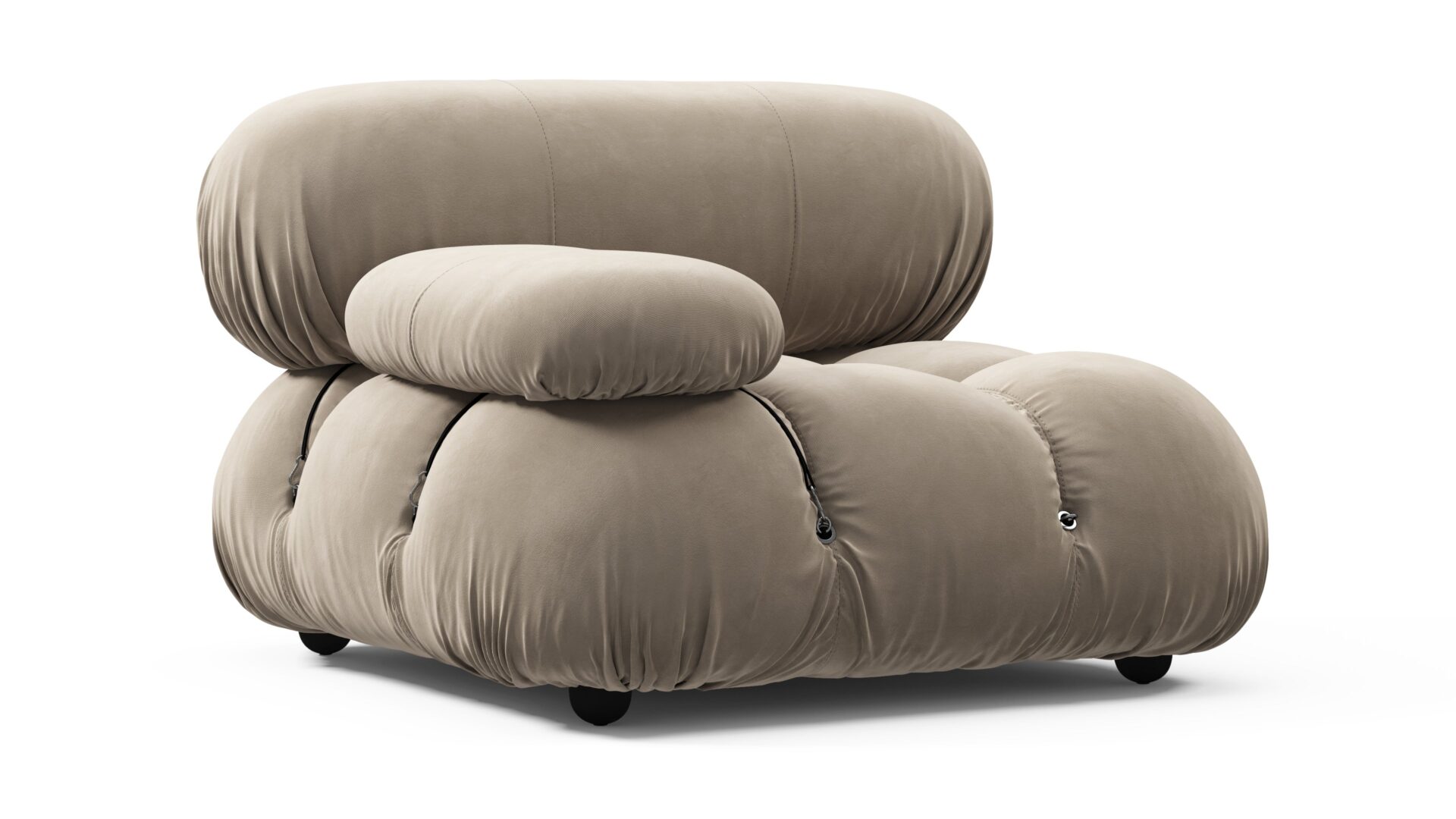 Step back in time to the 1970s with the Bellini sectional sofa, a nod to an era of groovy vibes and carefree living with its liberating essence. This modern classic, upholstered in Greige Velvet, offers customizable modular design with tie rods and rings, echoing versatility and adaptability for a personalized touch. Crafted with a sturdy wooden frame and plush cold-pressed foam, the low-profile silhouette exudes relaxed luxury. Each generously cushioned seat invites you to unwind in style, ensuring an opulent and cozy seating experience. The Bellini sectional sofa, a beloved choice among furniture enthusiasts, effortlessly blends into any setting with its varied configurations, embodying a timeless favorite that caters to diverse preferences.