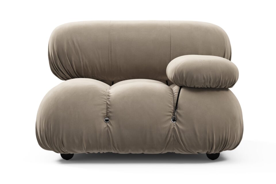 Step back into the iconic 1970s with the Bellini sectional sofa, exuding groovy vibes and free-spirited living. Its modular design offers freedom to personalize your space without a full makeover. Crafted with a sturdy wooden frame and plush cold-pressed foam wrapped in Greige Velvet, the low-profile Bellini invites luxurious relaxation. Customize your layout effortlessly, embody style and comfort unique to your preferences.