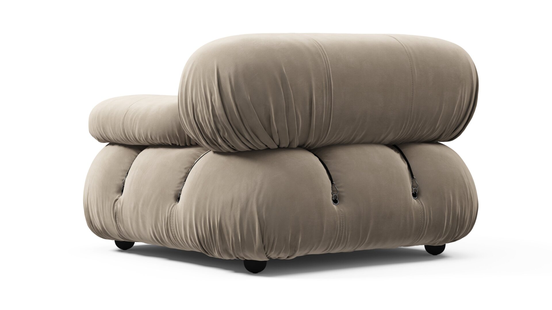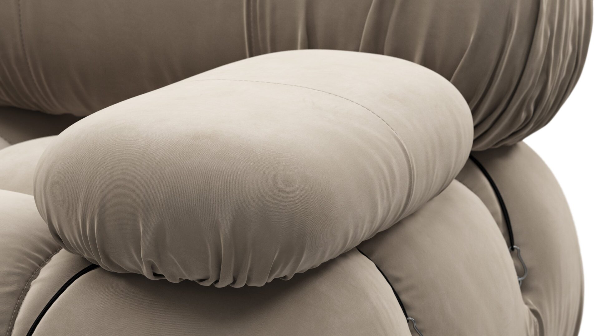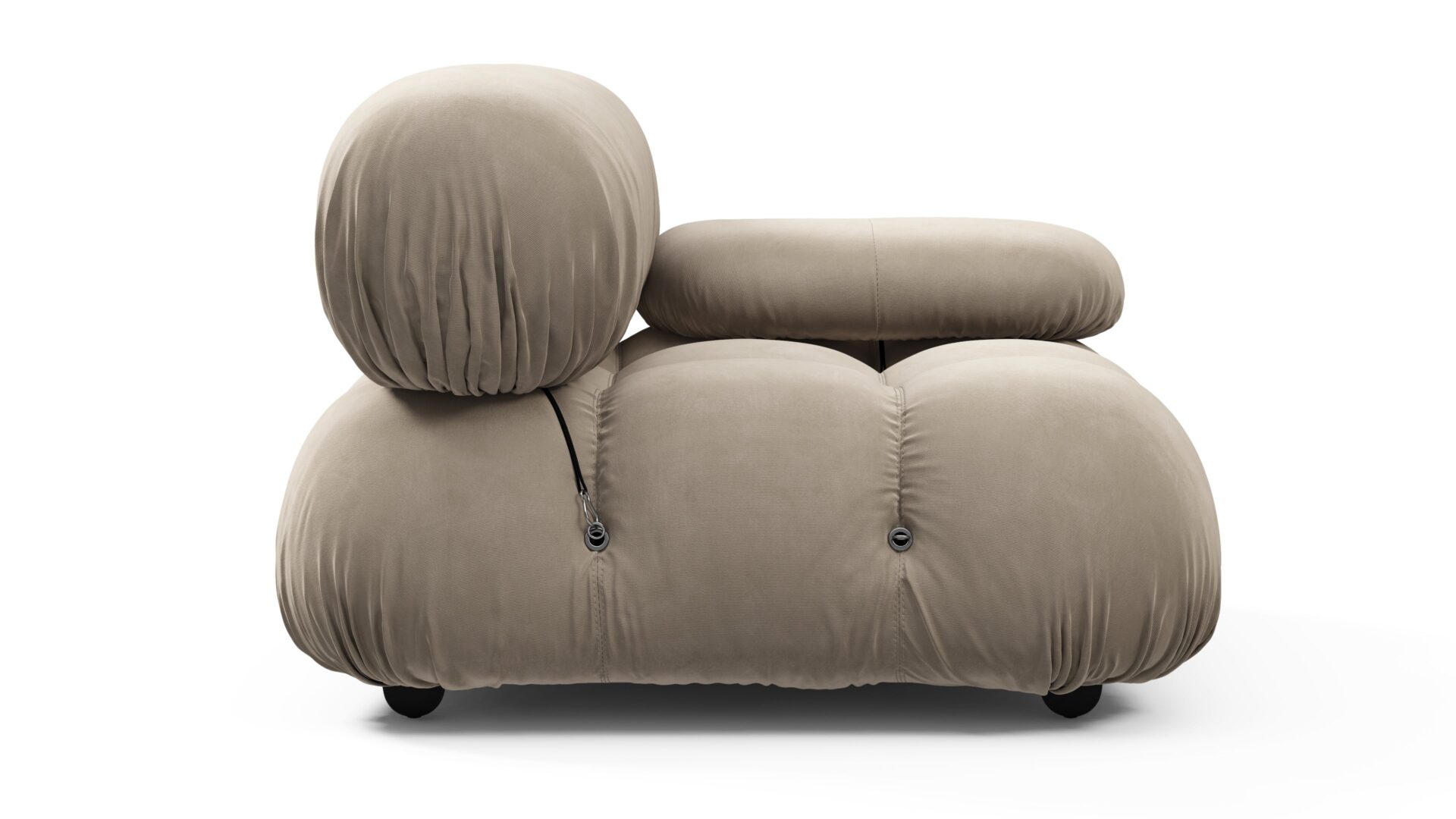 - Modular Instructions: Each section of the Mario Bellini Sofa is modular and is attached with string ties and carabiners. To assemble or rearrange your sofa, simply unclip the carabiners from one ring and attach to a corresponding ring on the module you wish to connect to.