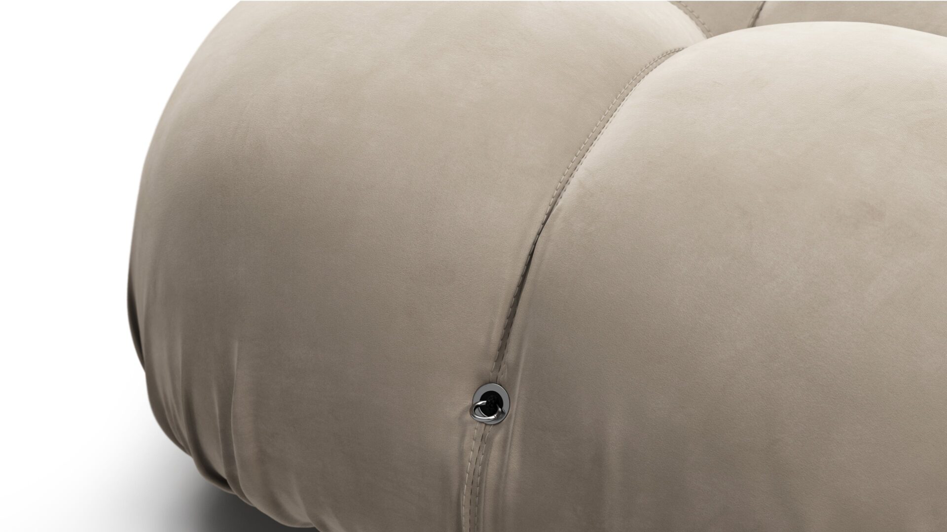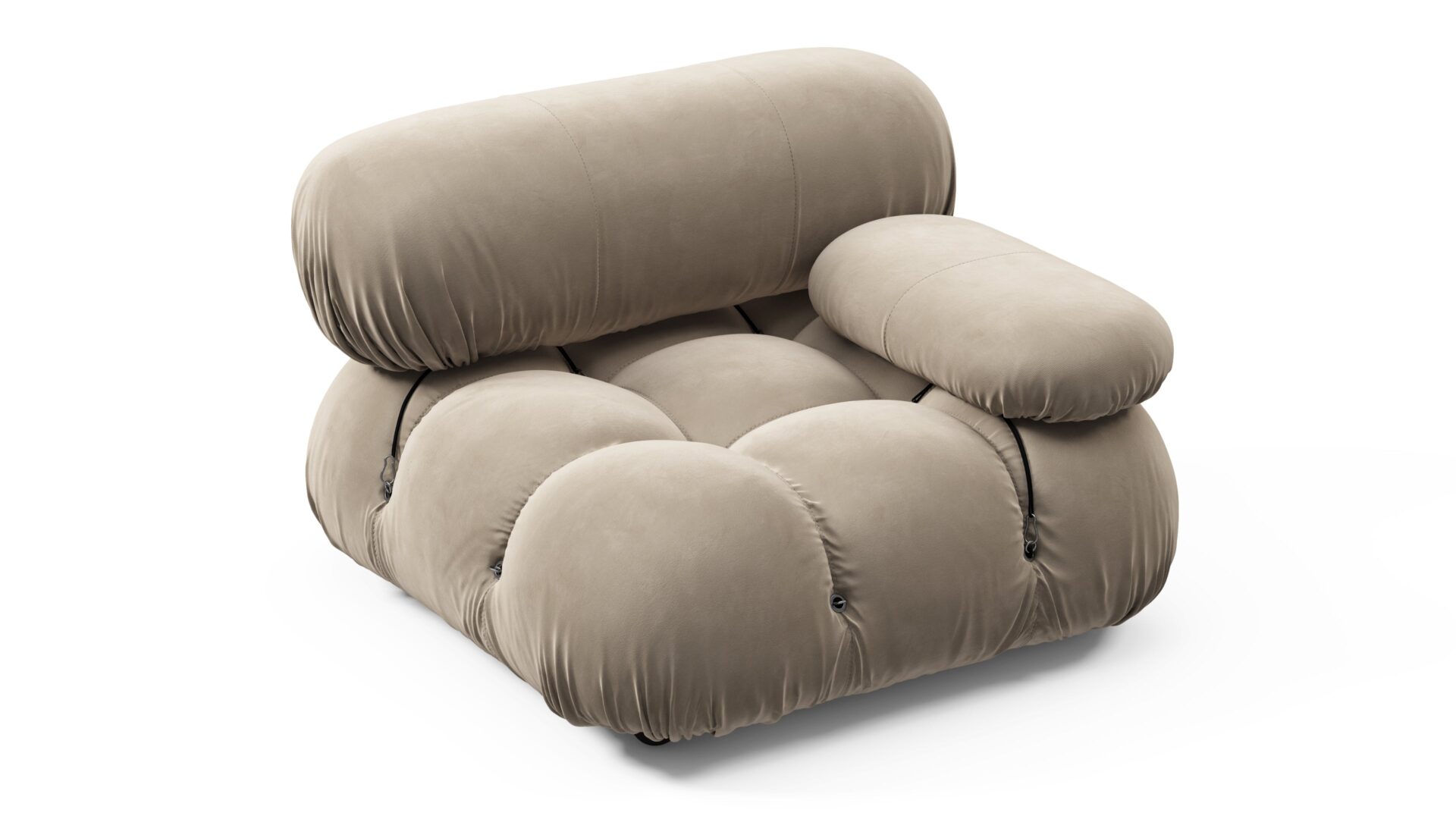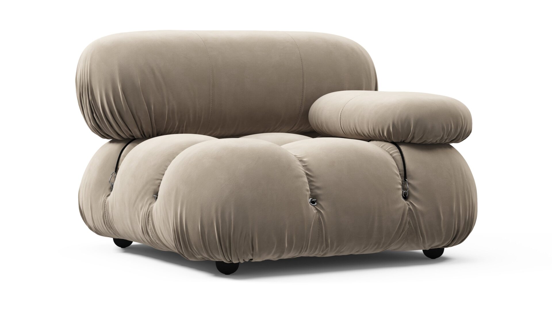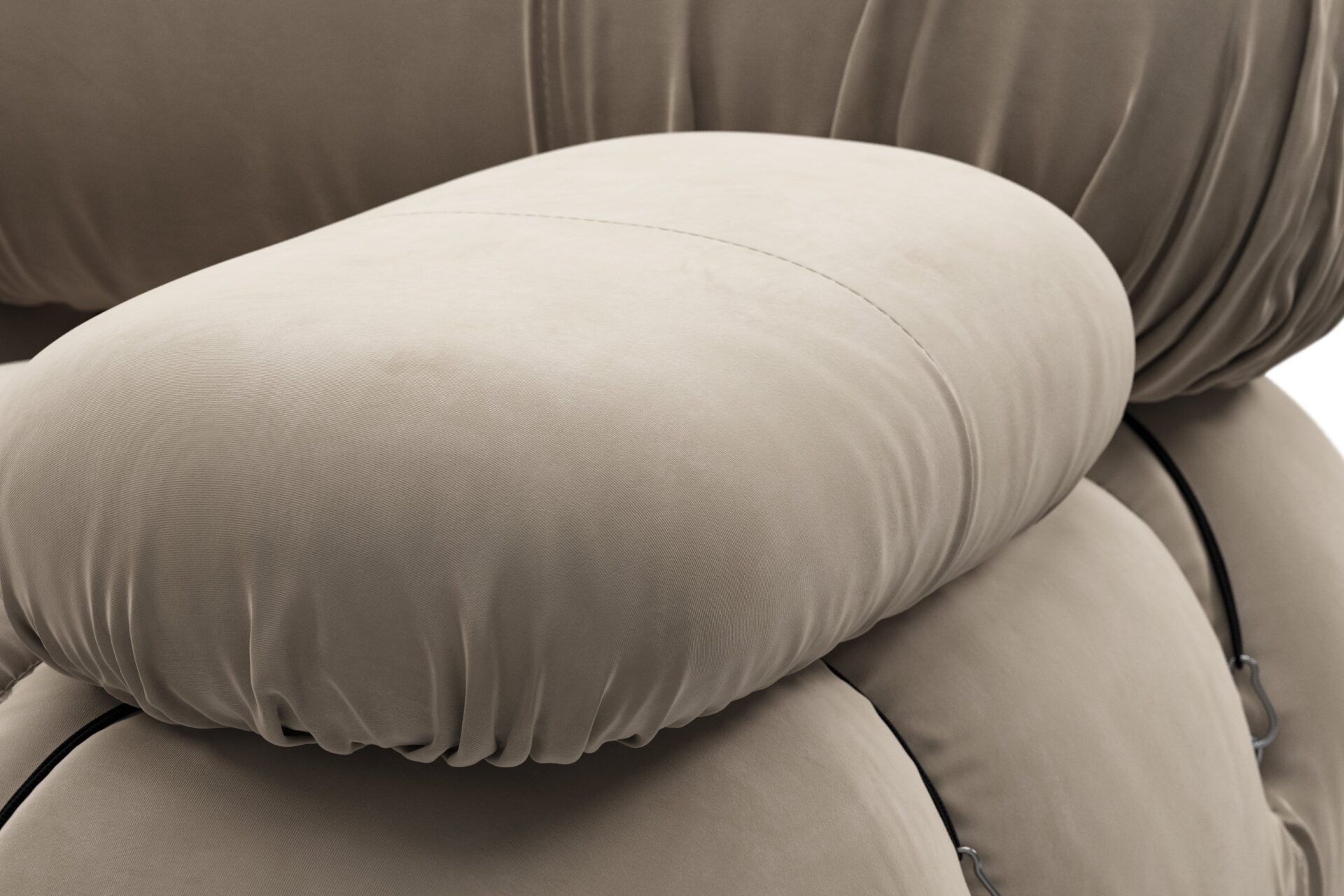 - Modular Instructions: Each section of the Mario Bellini Sofa is modular and is attached with string ties and carabiners. To assemble or rearrange your sofa, simply unclip the carabiners from one ring and attach to a corresponding ring on the module you wish to connect to.