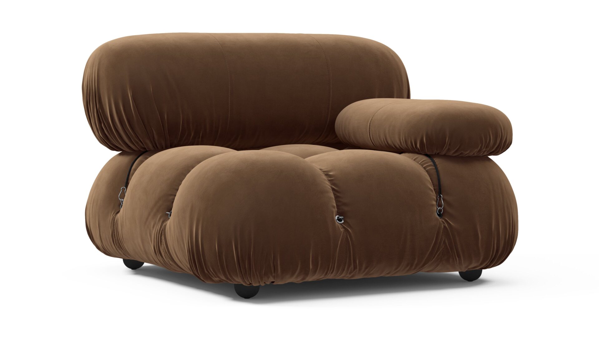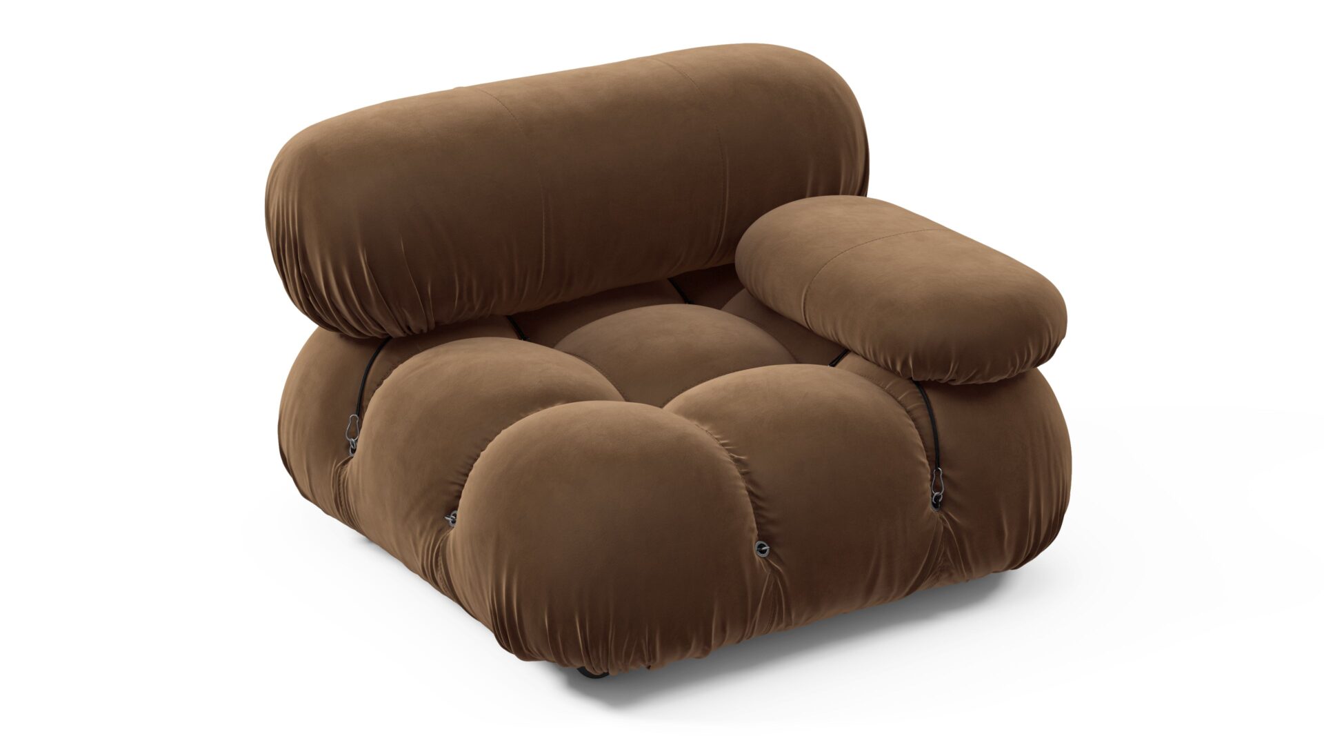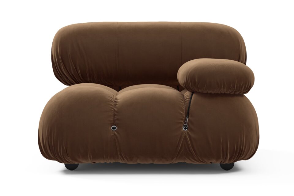 Step back in time to the 1970s with the Bellini sectional sofa, an ode to an era of groovy vibes and carefree living. Embraced by a new generation of furniture enthusiasts, the Bellini's liberating essence shines through. Crafted with a sturdy wooden frame and plush cold-pressed foam wrapped in soft Mocha Velvet, this modular design allows for effortless customization, offering a sense of liberation to your living space. Cherished for its adaptability, the Bellini effortlessly blends relaxation and social interaction, providing endless options for creating a personalized sofa that fits your style and mood.