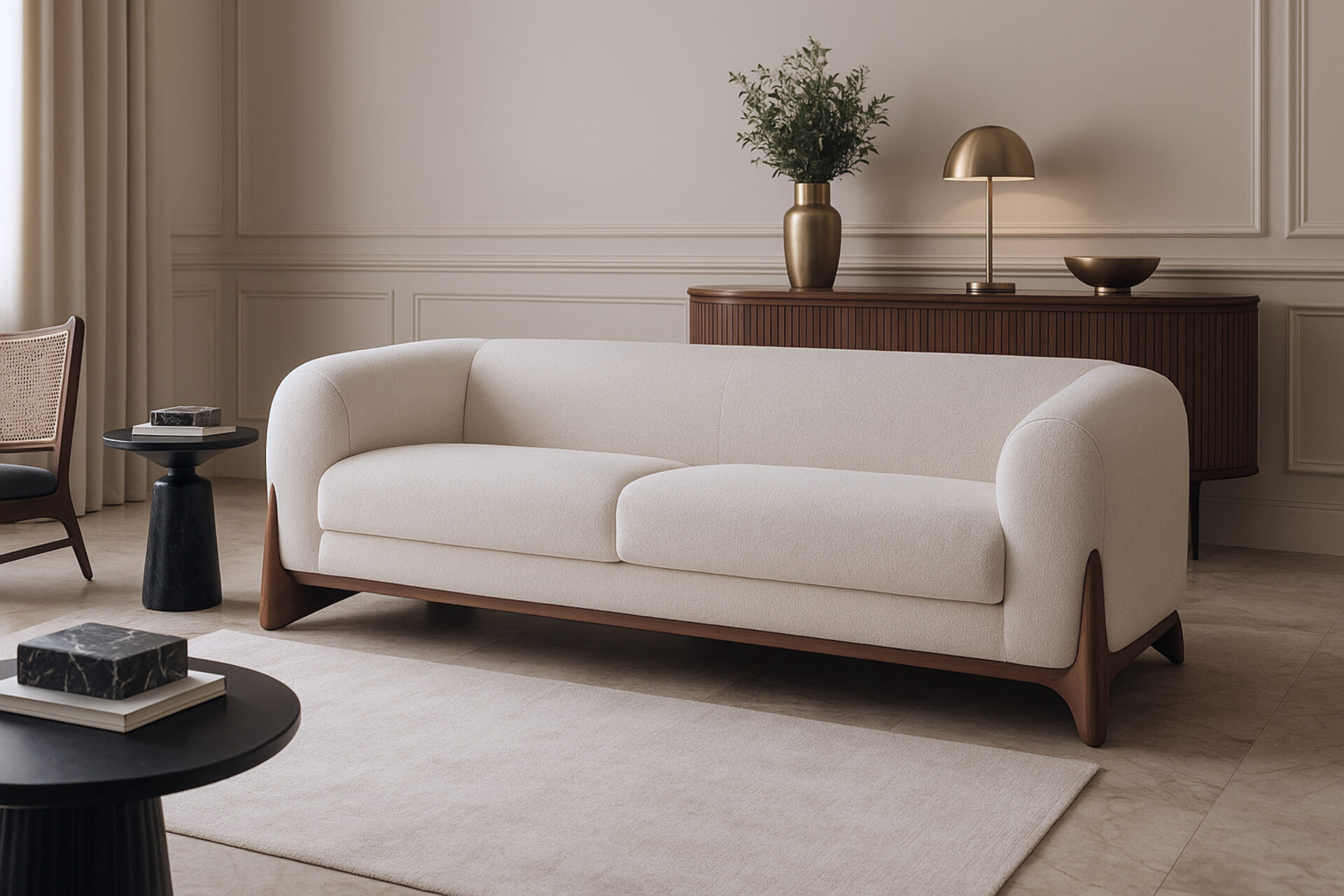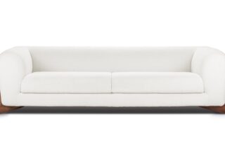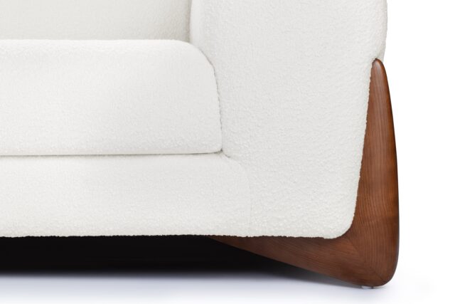 Elevate your space with the luxurious contrast between the deep, rich tones of walnut and the pristine white bouclé upholstery. This superb combination infuses a sense of opulence and sophistication, grounding the Breton sofa in a seamless fusion of natural beauty and modern design.