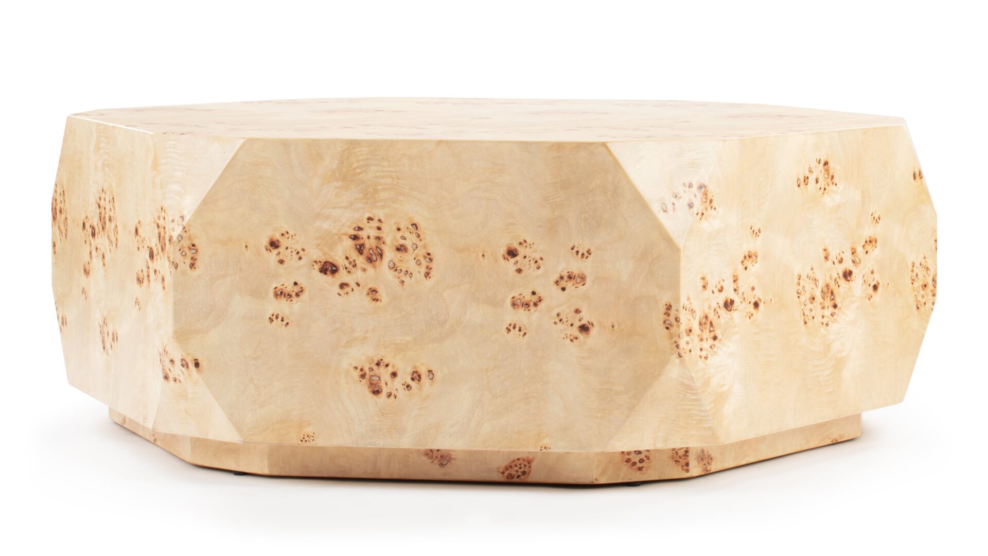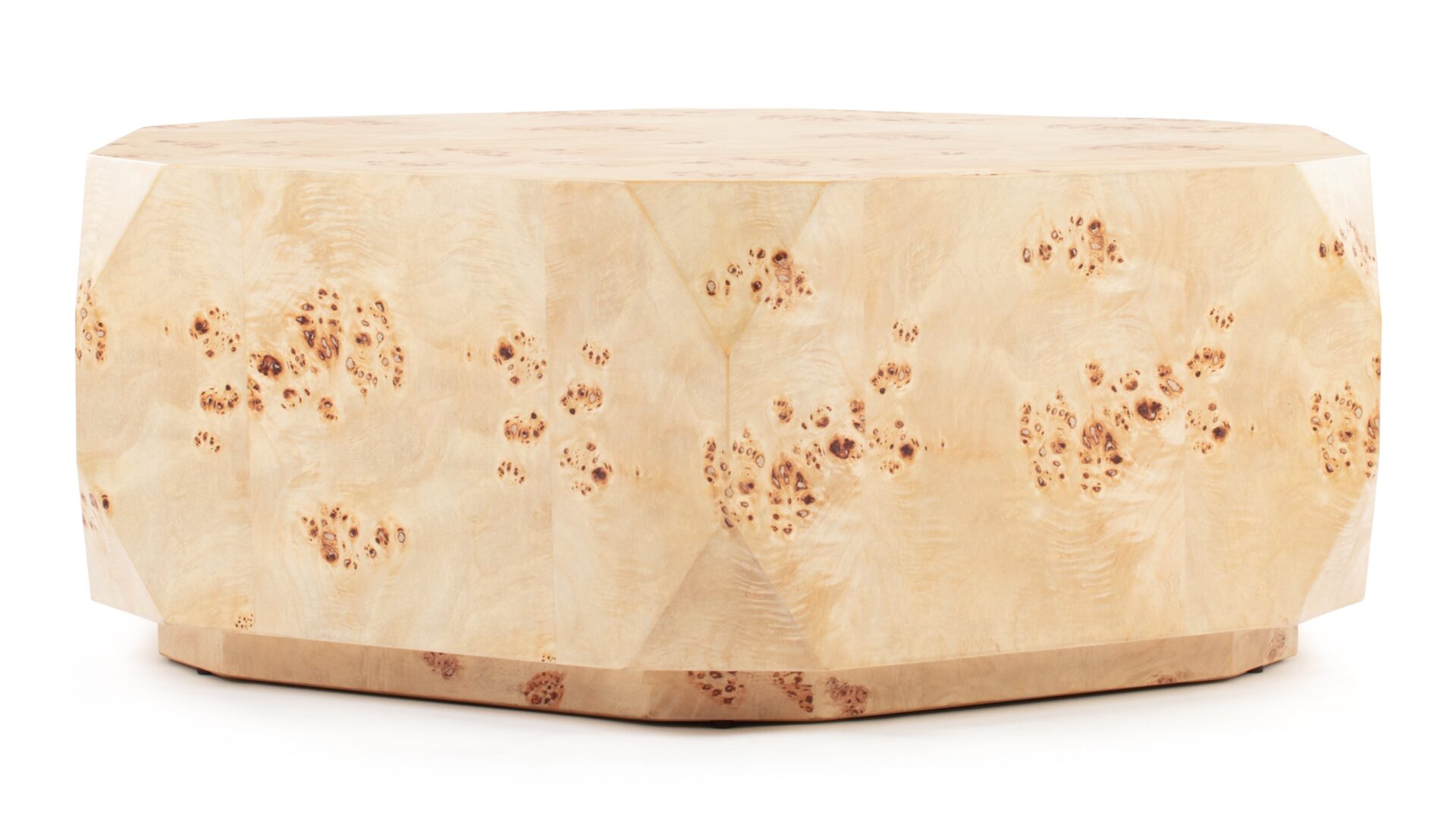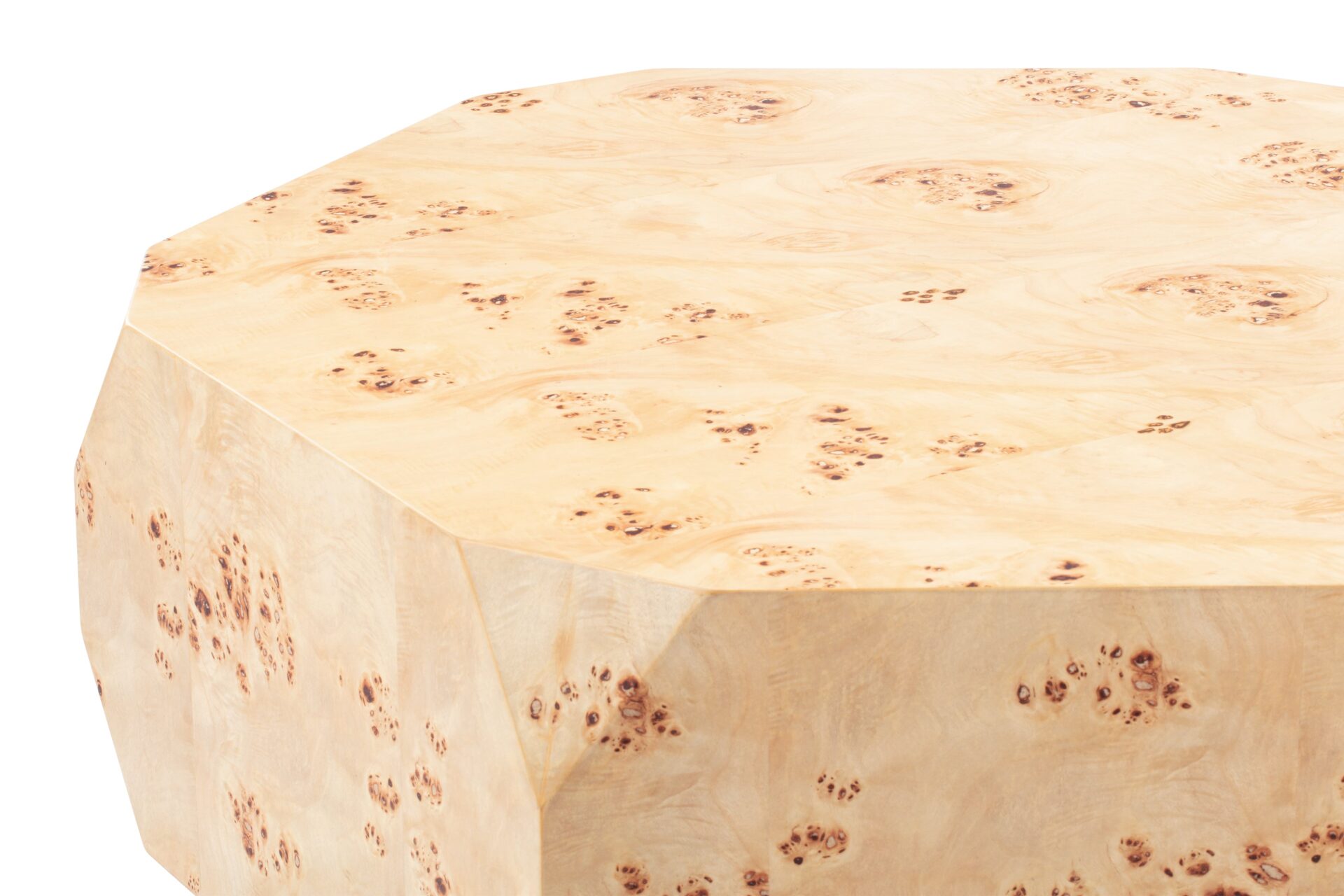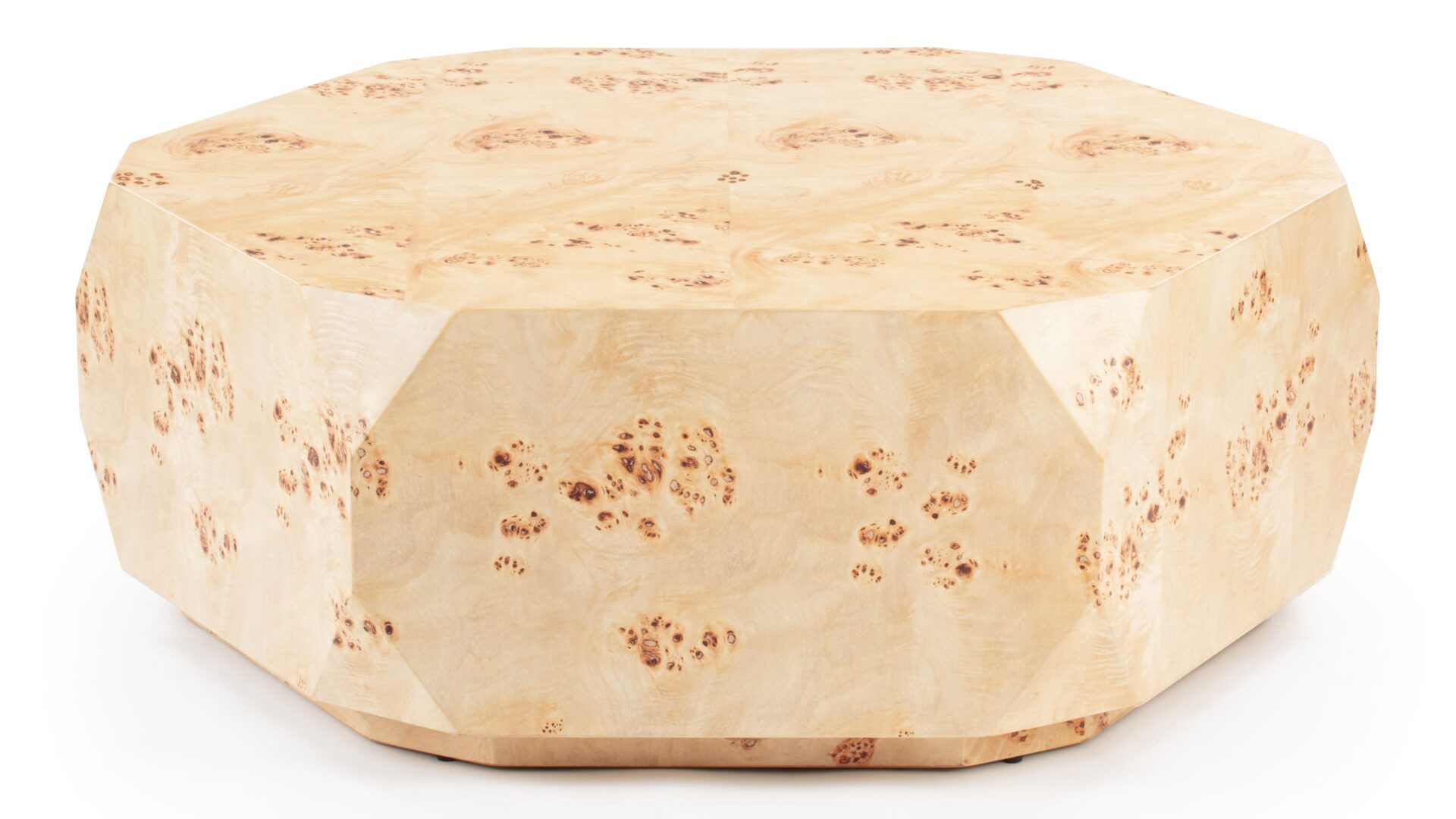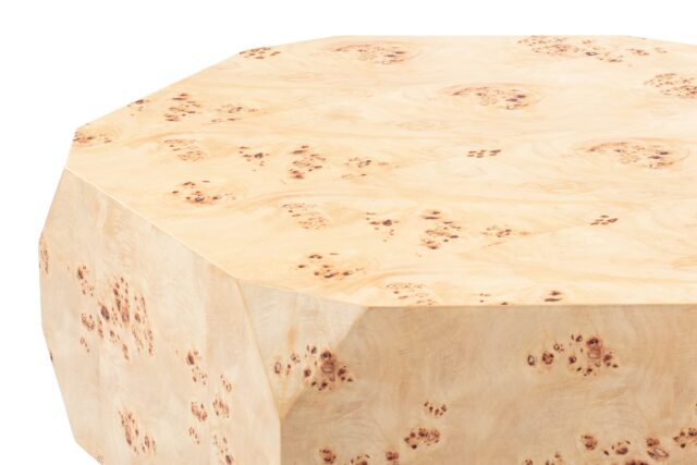 Introducing the Callie Coffee Table, a stunning display of modern aesthetics seamlessly melded with natural beauty. Precision-crafted to perfection, this exceptional furniture piece enhances any space with its unique charm and sophisticated allure. The table's captivating faceted geometric shape creates a visually striking silhouette, exuding contemporary elegance. Elevate your decor with the natural beauty of burl wood showcased in the distinct Callie Coffee Table, destined to be a timeless focal point in any room.