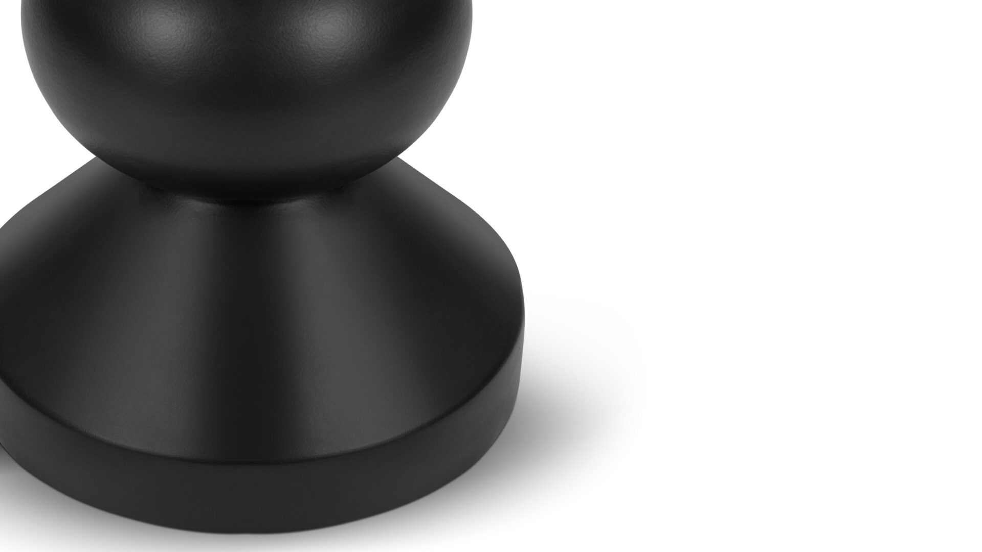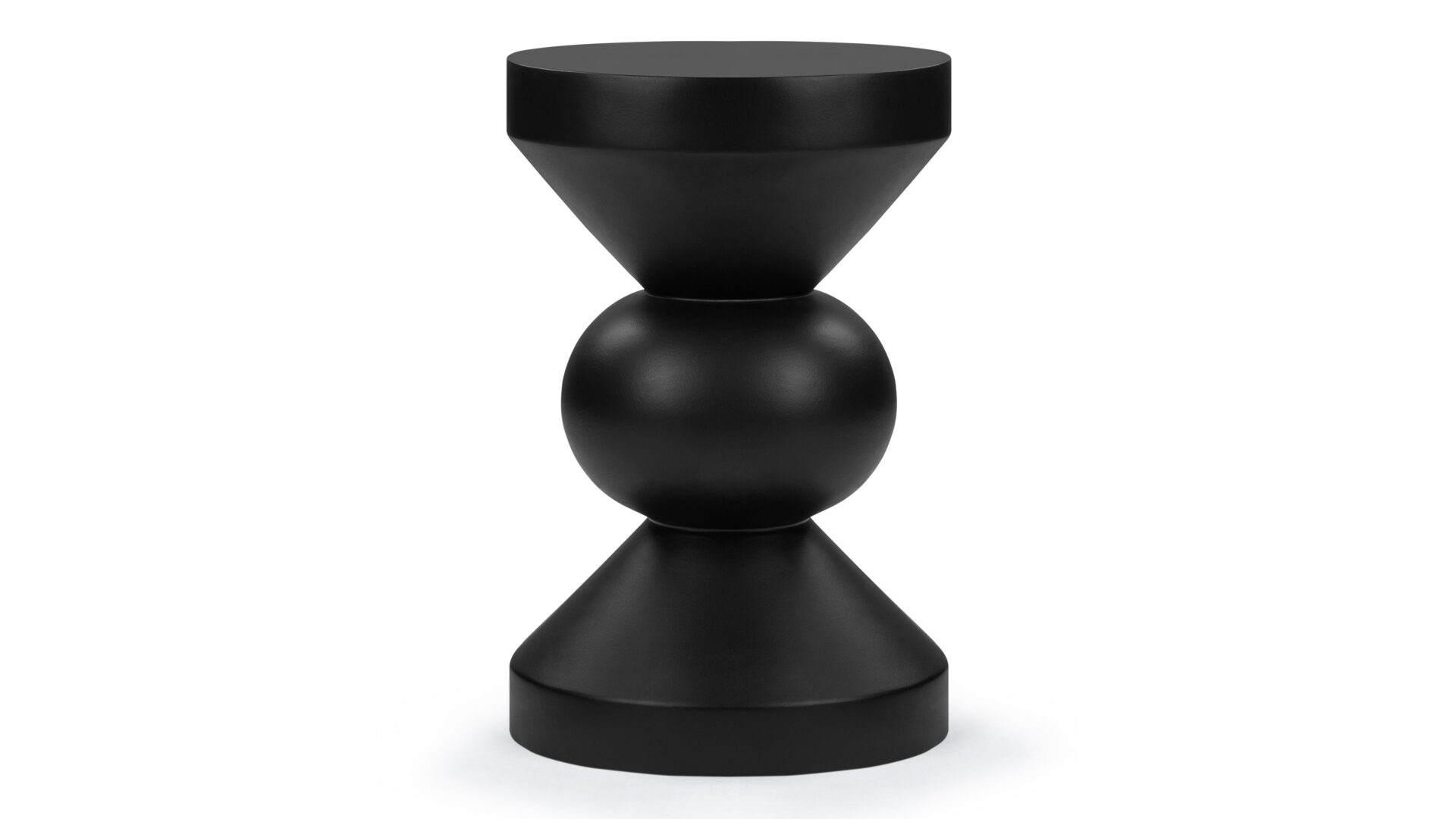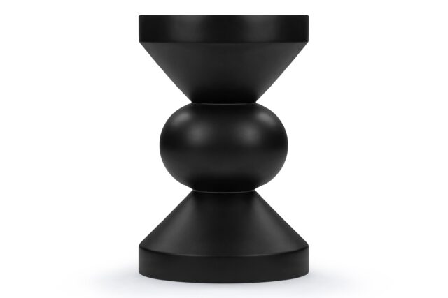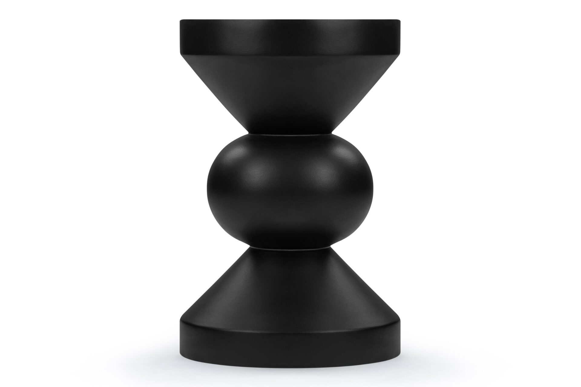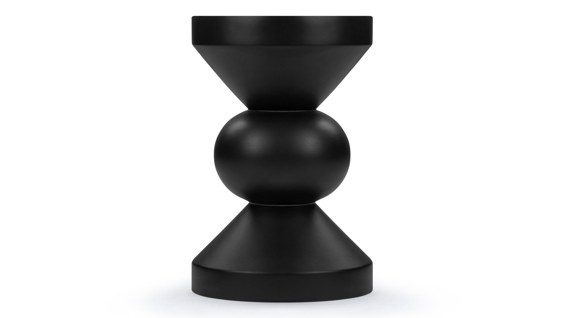 Discover the Chess Side Table, a contemporary, geometric furniture item made from black concrete. It showcases a striking design with a conical base, spherical center, and inverted conical top. The smooth matte finish enhances its minimalist appeal, making it a versatile option for both indoor and outdoor settings.