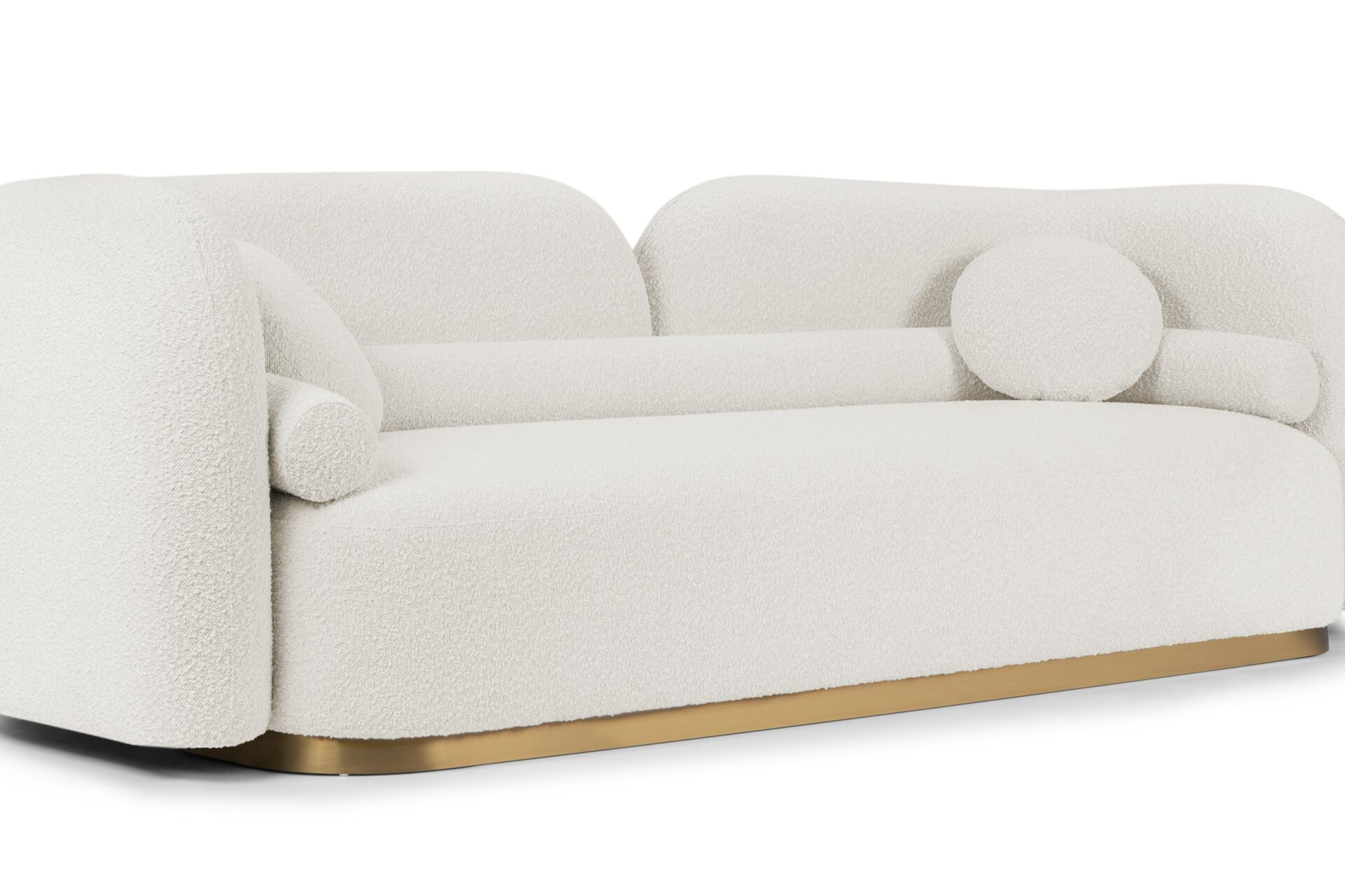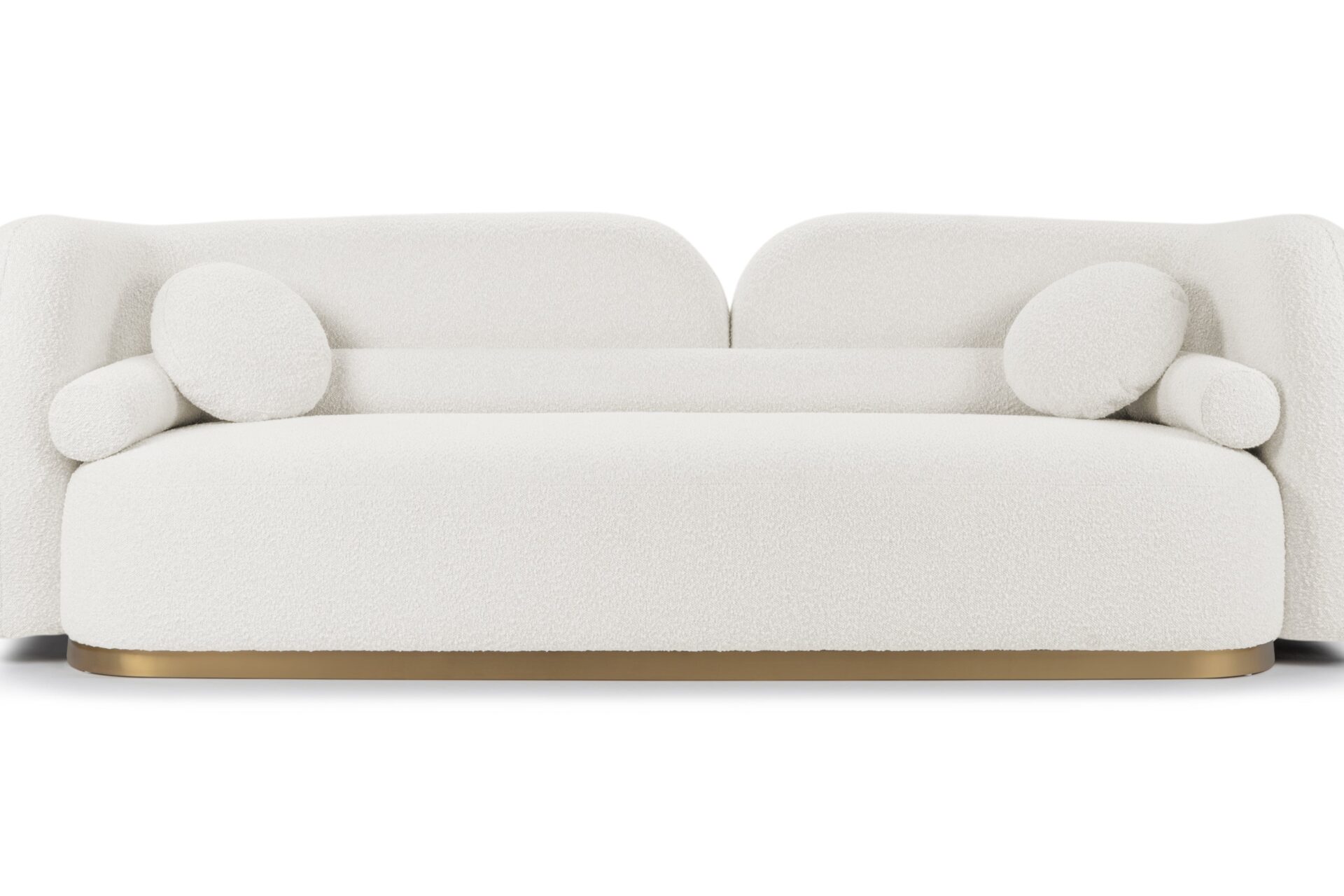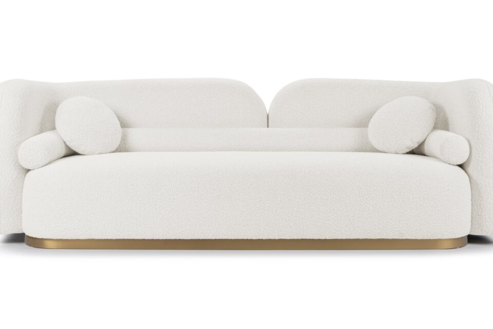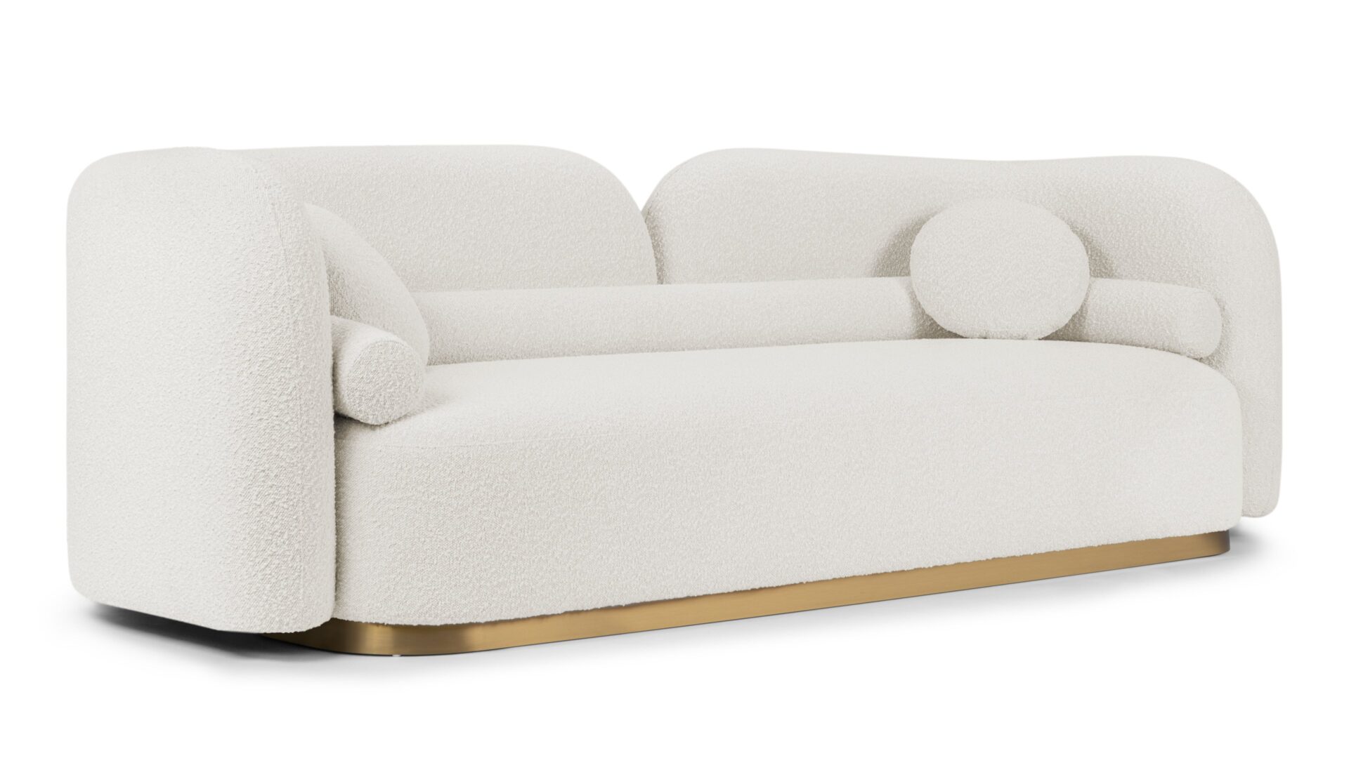Introducing the Cleo Sofa showcasing soft boucle fabric in a cozy warm white hue, paired with a stunning brass-finished base. This beautifully designed piece effortlessly marries indulgent tactile comfort with elegant metallic details, exuding an aura of refined luxury.