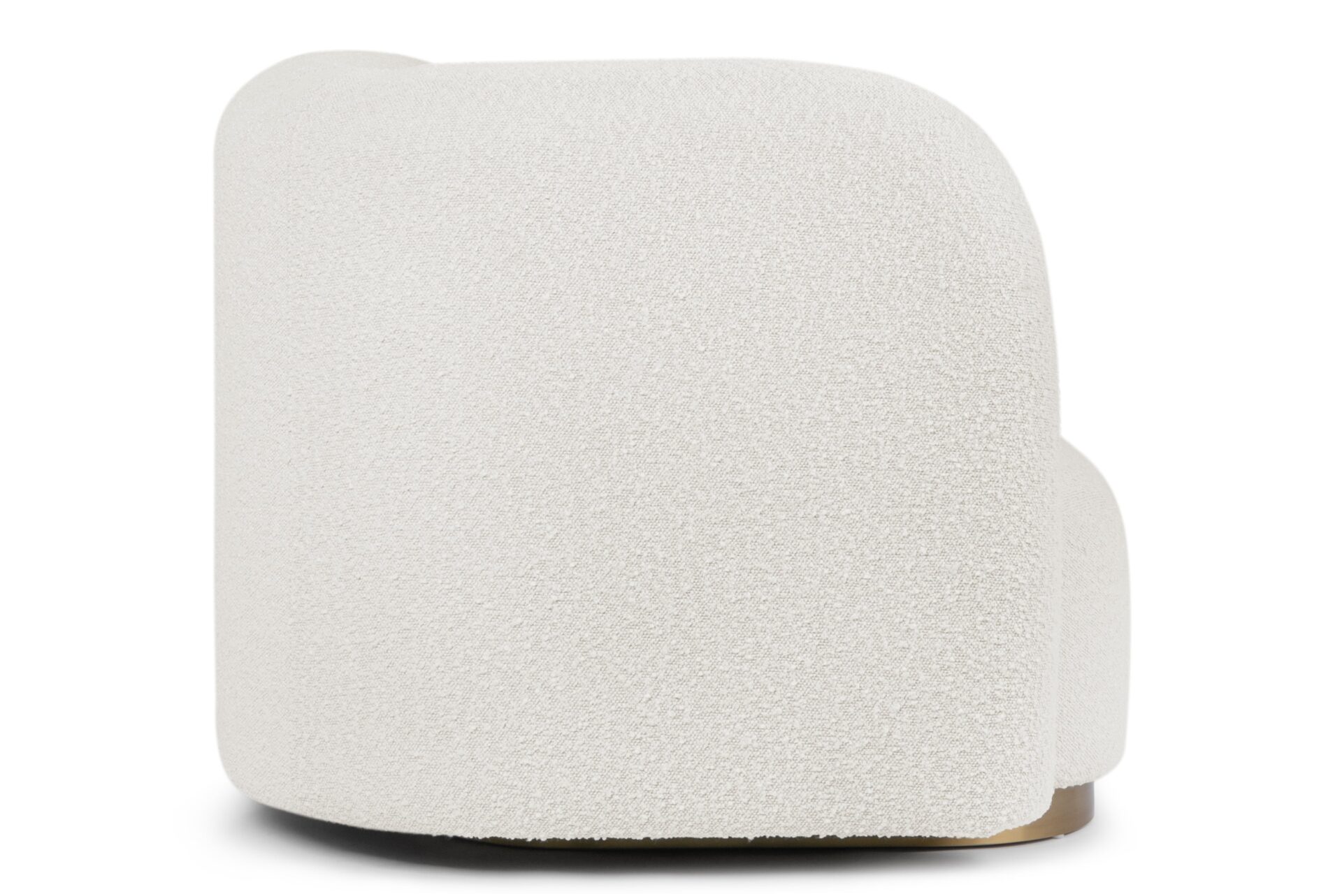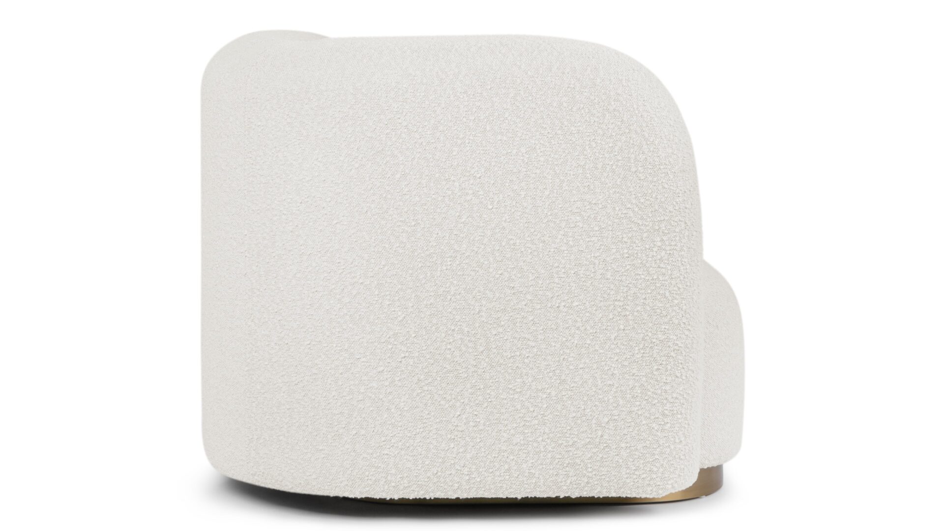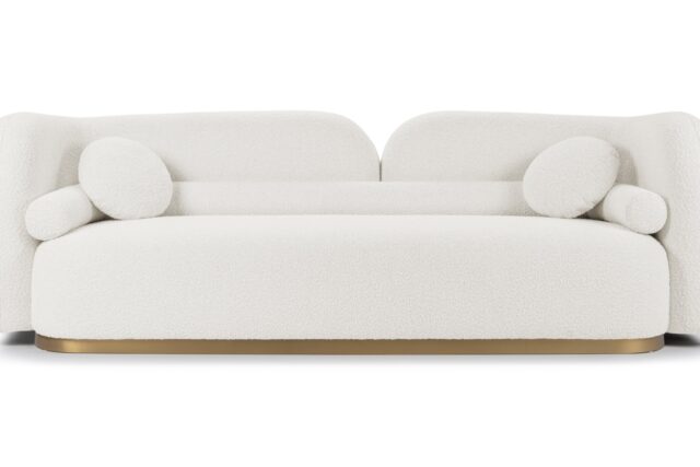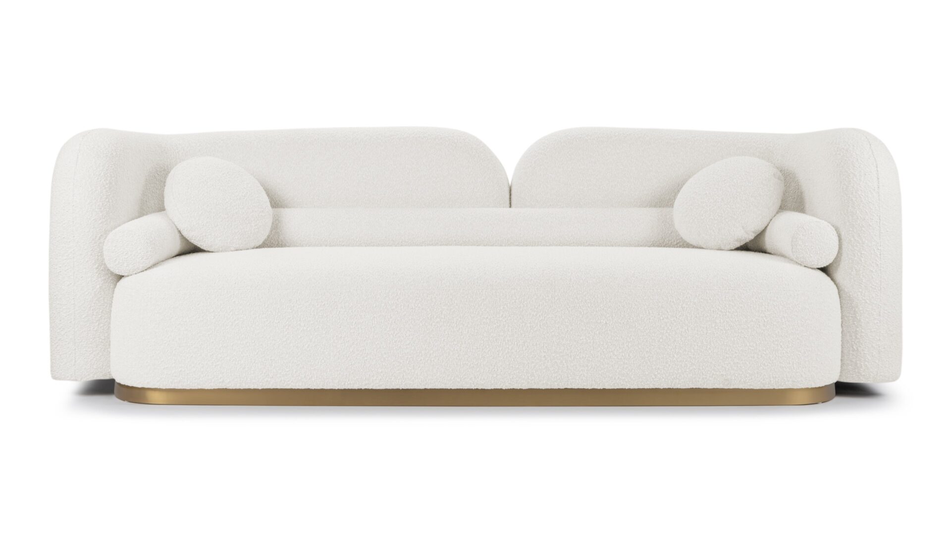 Introducing the Cleo Sofa showcasing soft boucle fabric in a cozy warm white hue, paired with a stunning brass-finished base. This beautifully designed piece effortlessly marries indulgent tactile comfort with elegant metallic details, exuding an aura of refined luxury.