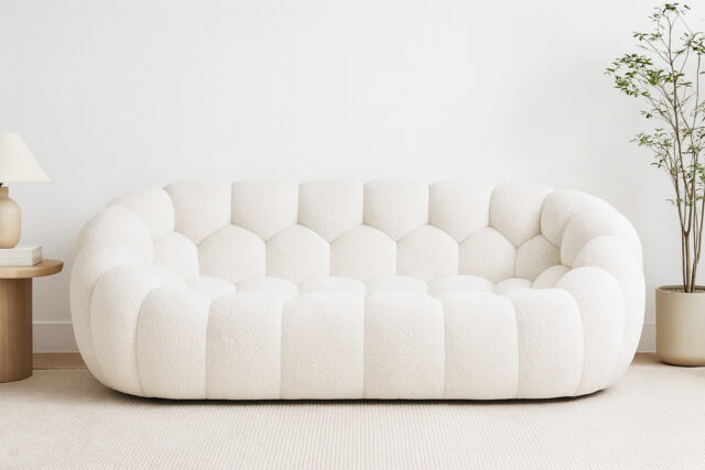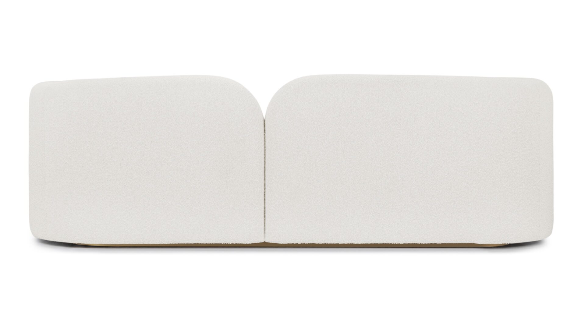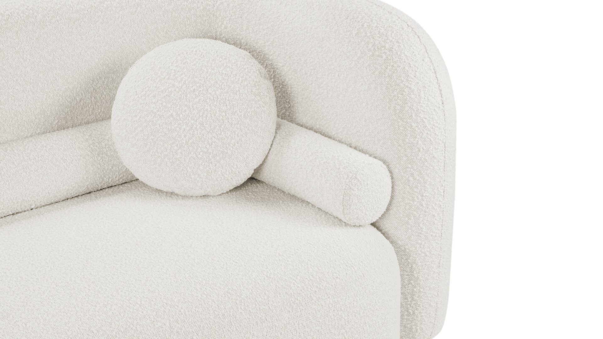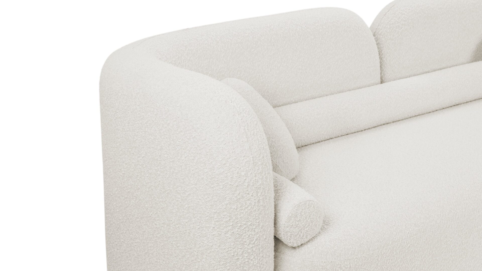 Experience modern sophistication with the Cleo Sofa, featuring asymmetrical curves and a soft, inviting silhouette. The warm white boucle fabric complements the serene, minimalist aesthetic, making it a perfect choice for contemporary spaces.