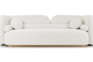 Introducing the Cleo Sofa showcasing soft boucle fabric in a cozy warm white hue, paired with a stunning brass-finished base. This beautifully designed piece effortlessly marries indulgent tactile comfort with elegant metallic details, exuding an aura of refined luxury.