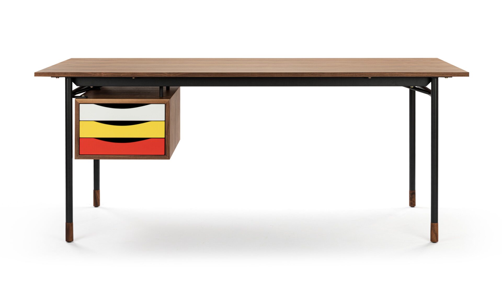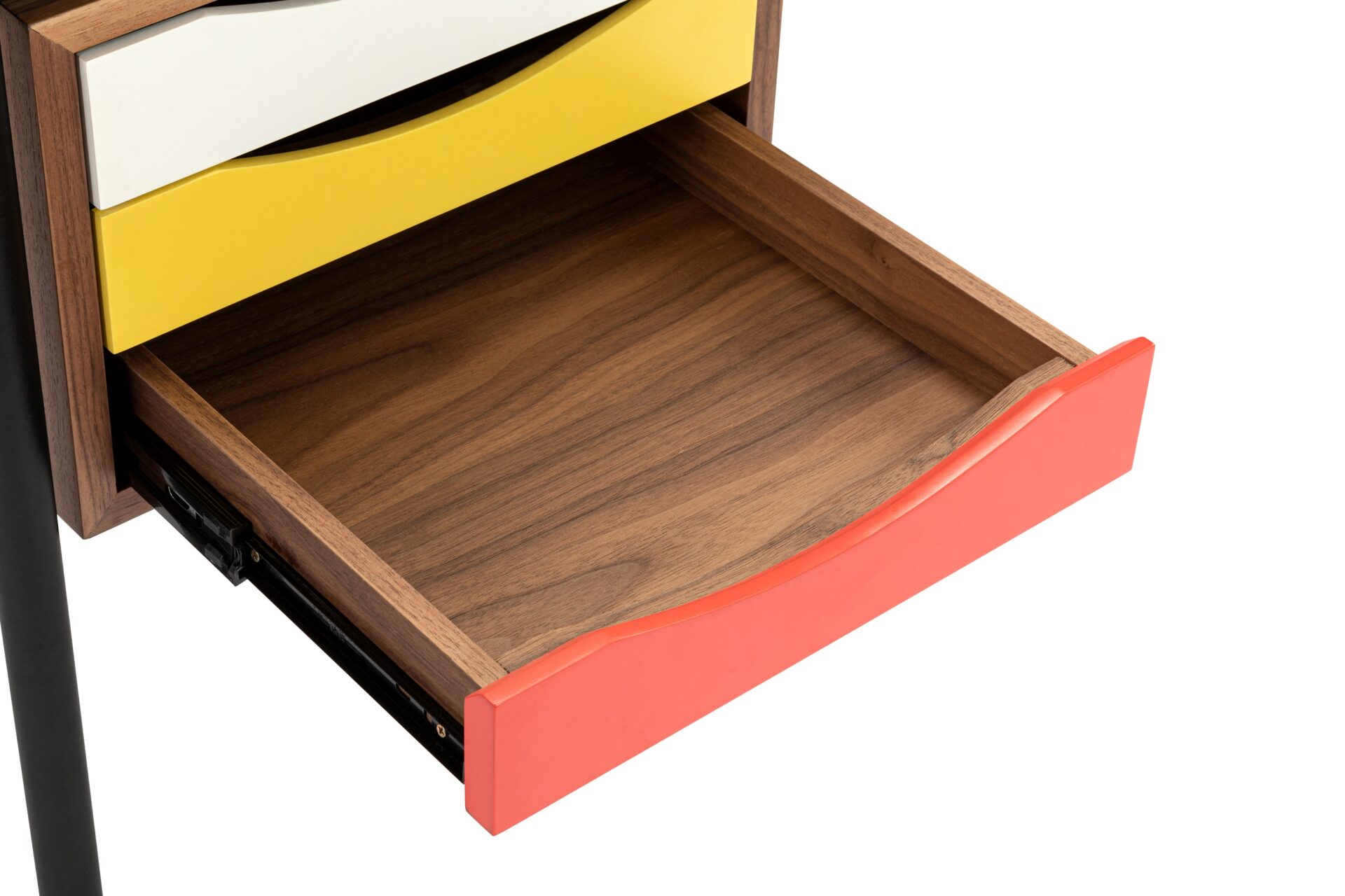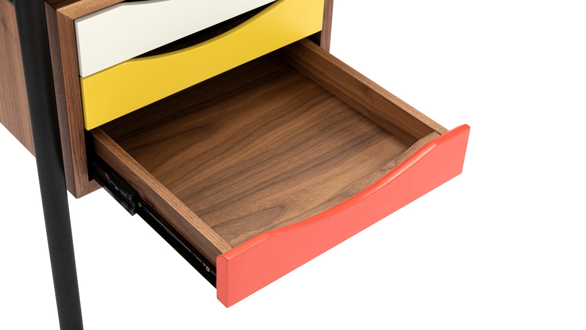 Discover the Coen Desk, an elegant piece showcasing a slender, minimalist outline with sleek lines and delightful details, such as a set of vibrant sliding trays hanging below the surface. This desk serves as a functional base that boosts efficiency, providing both comfort and confidence.