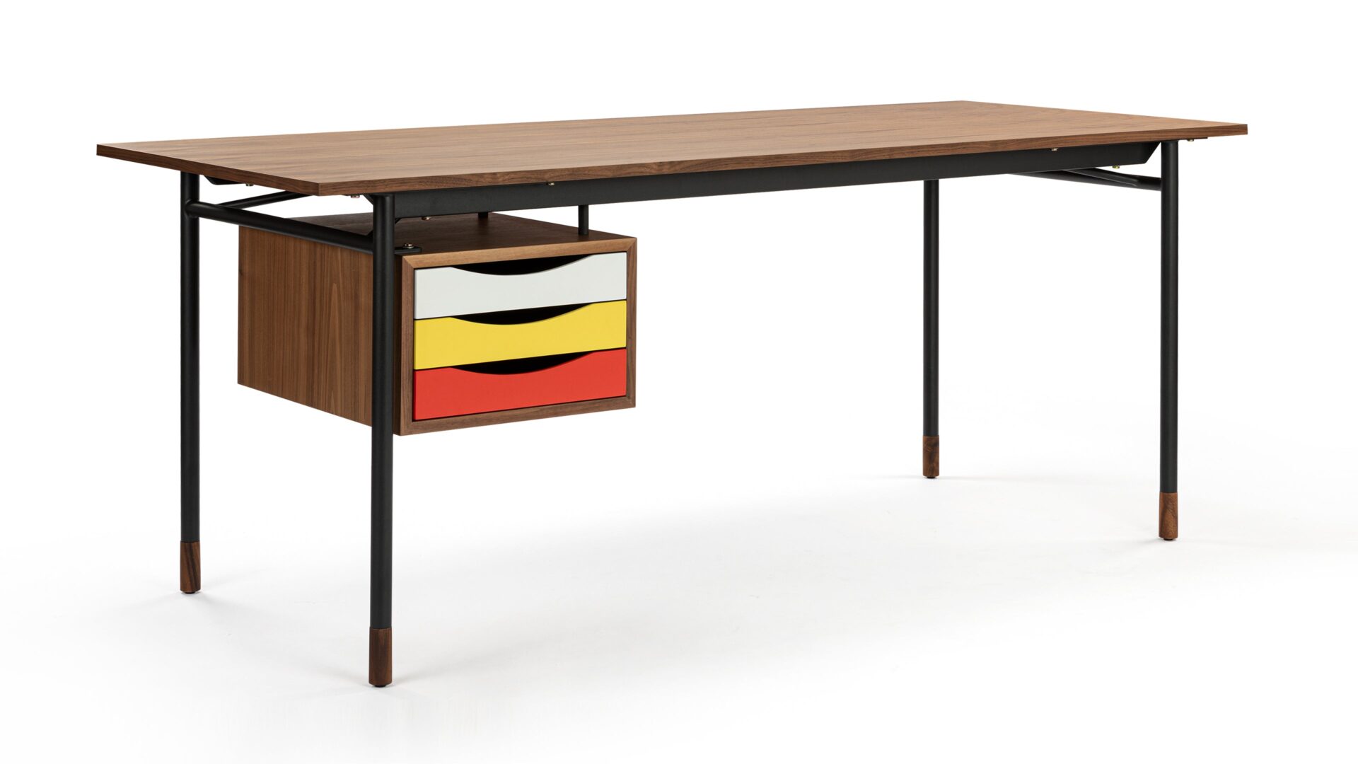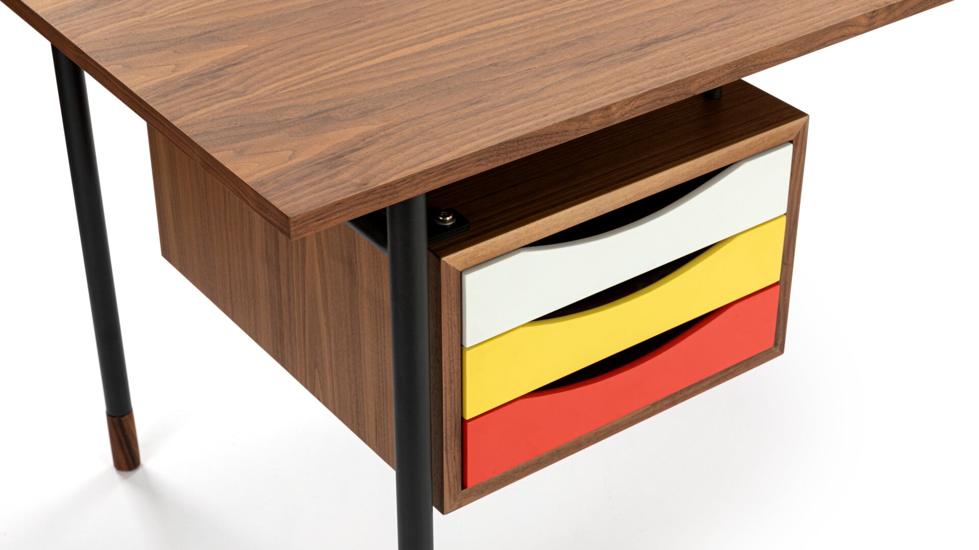 Elevate your workspace with the effortlessly elegant Coen Desk. Combining mid-century modern aesthetics with practical functionality, this iconic piece is perfect for contemporary and traditional settings. Crafted with a walnut veneer, steel base, and solid walnut wood legs, it boasts expert craftsmanship and exquisite design details like vibrant sliding trays. Ideal for home offices and craft rooms, this desk exudes sophistication while boosting efficiency.