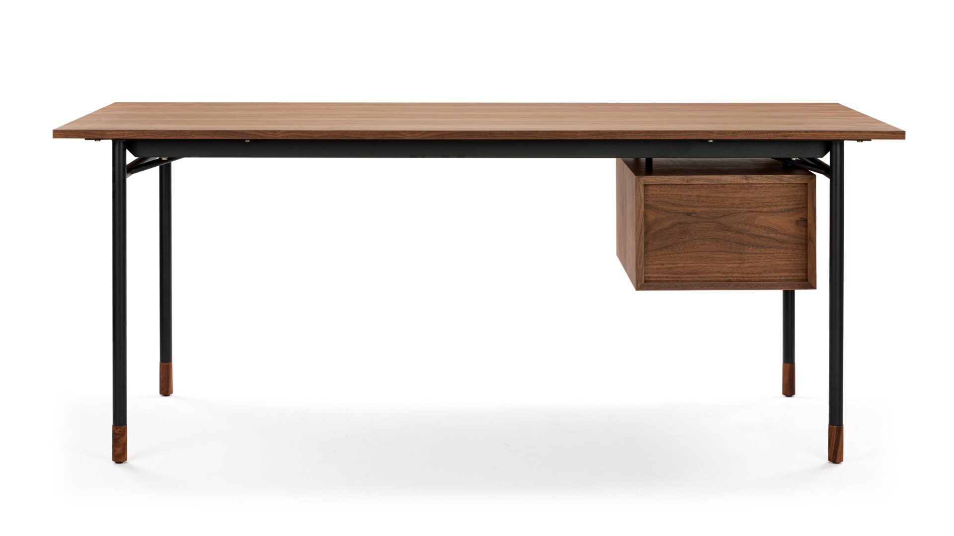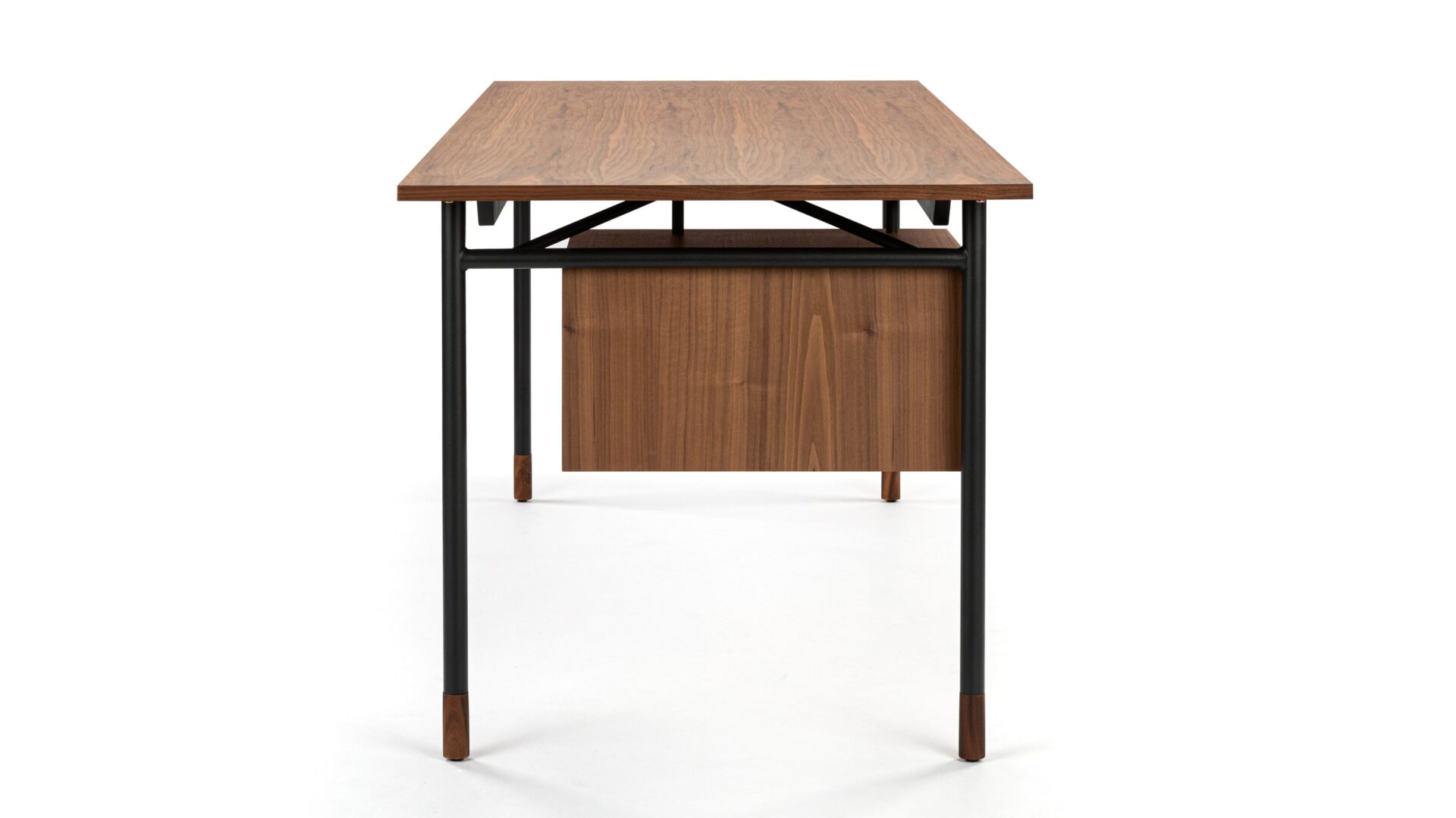 Crafted with a walnut veneer, steel base, and solid walnut wood legs, the Coen desk showcases meticulous artisanship using durable materials. In short, it seamlessly blends durability with sophistication!