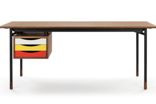 Discover the Coen Desk, an elegant piece showcasing a slender, minimalist outline with sleek lines and delightful details, such as a set of vibrant sliding trays hanging below the surface. This desk serves as a functional base that boosts efficiency, providing both comfort and confidence.