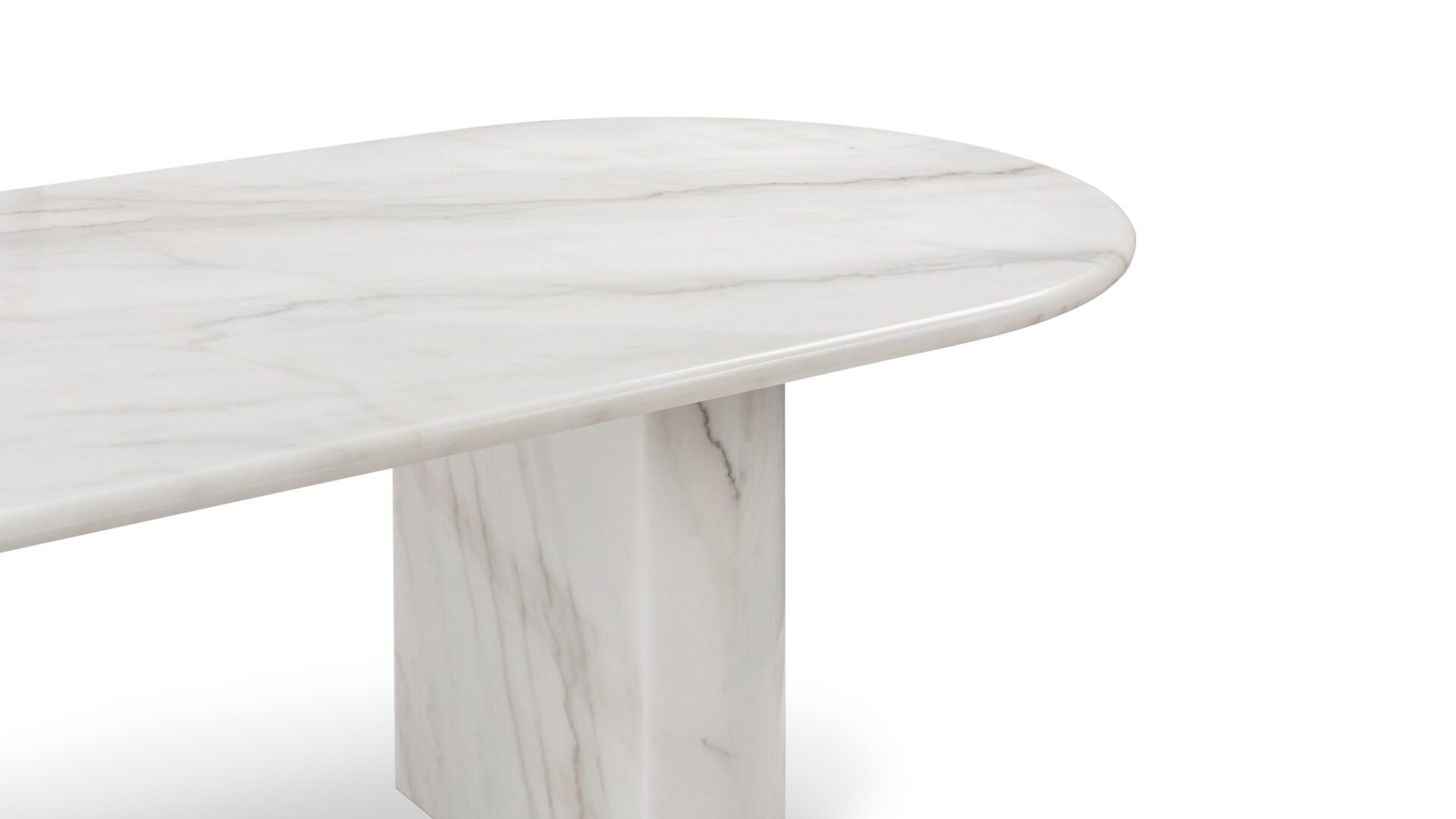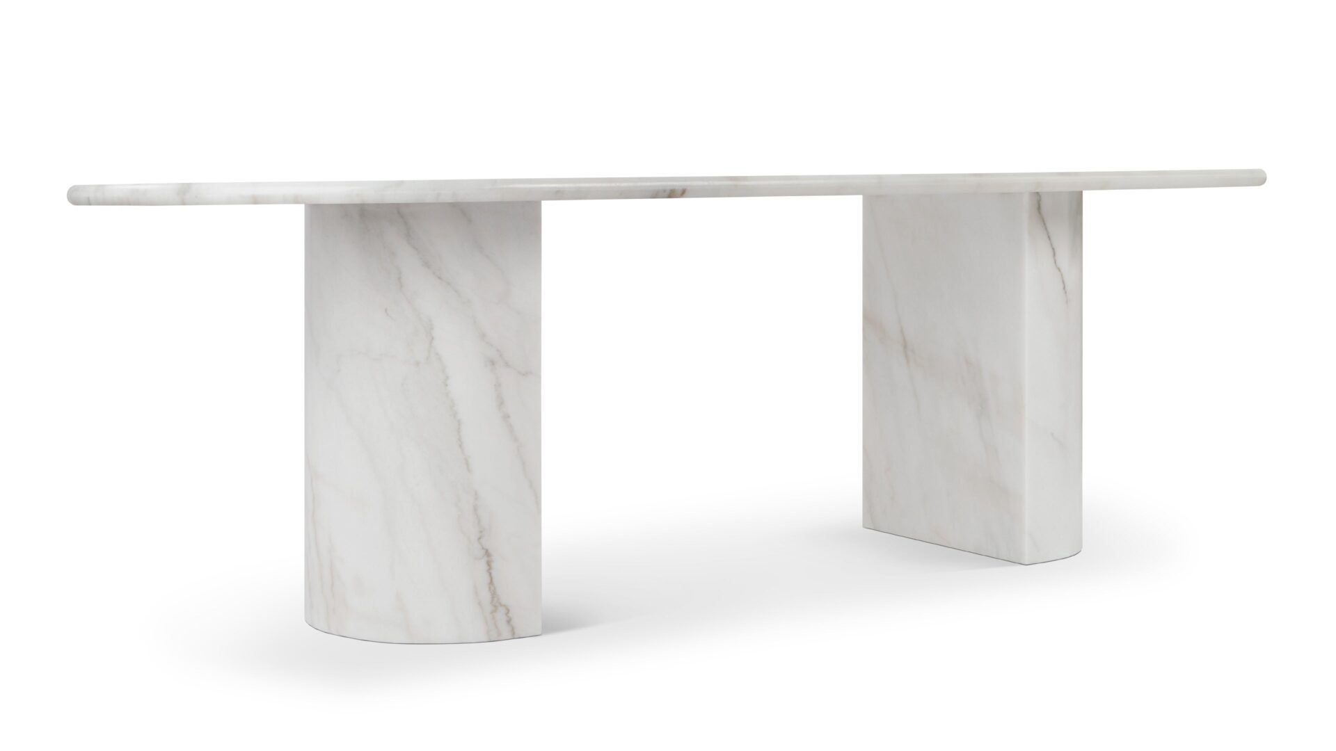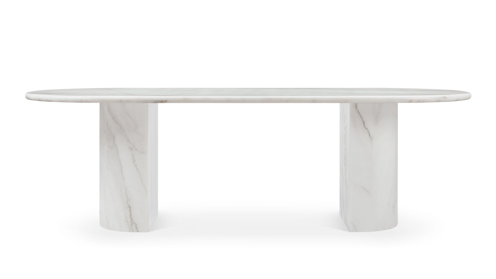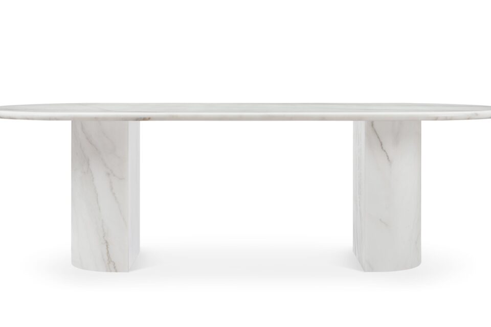 Experience a contemporary twist on the pedestal base table with the Dante dining table. Boasting two demi-lune pillar legs and a spacious 98” oval table top, this design effortlessly accommodates extra place settings, ideal for avid hosts.