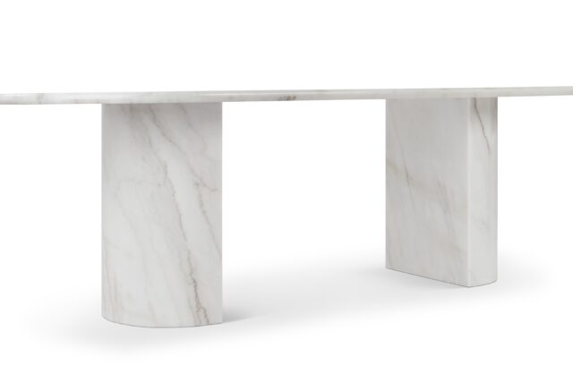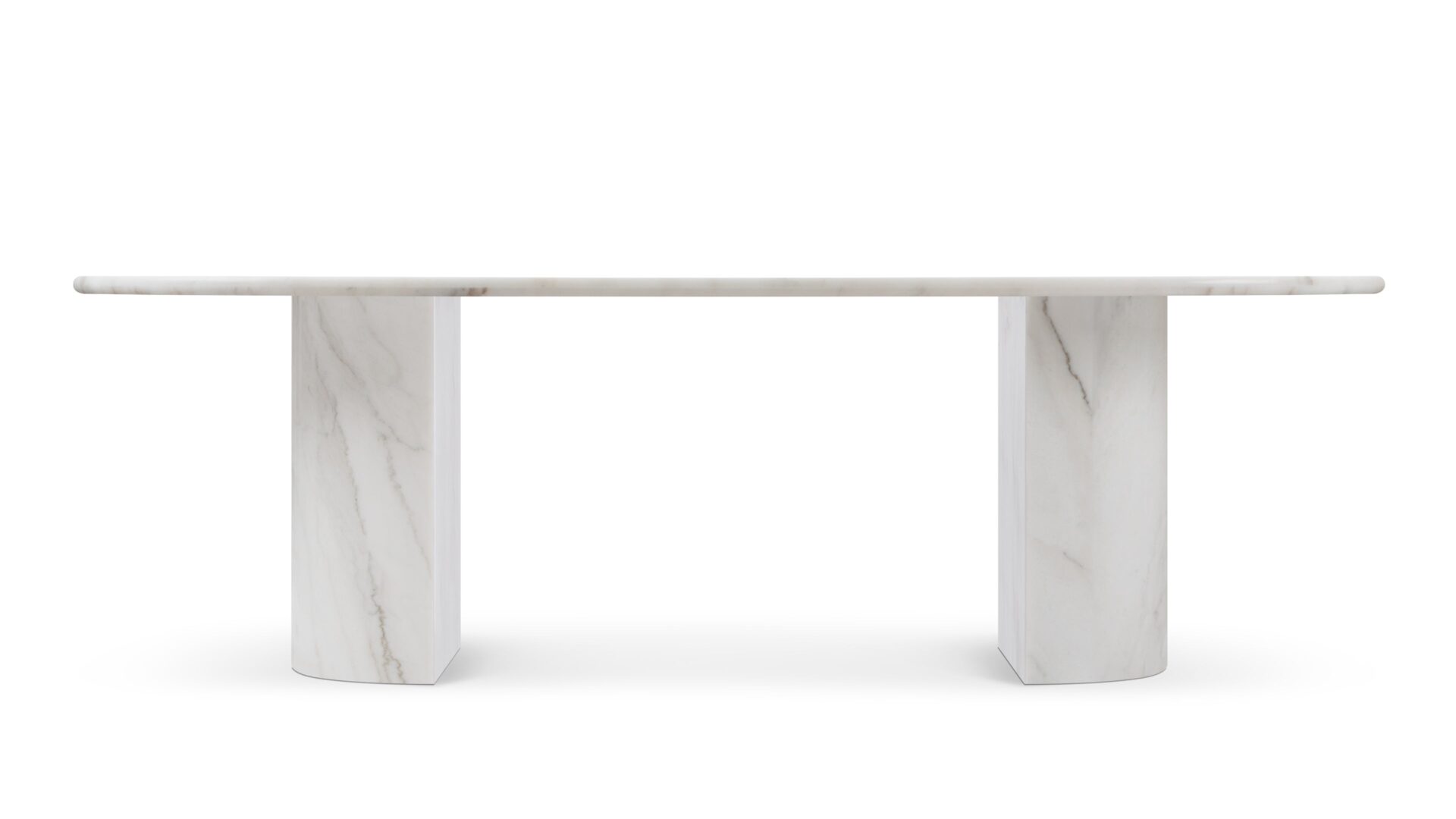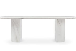 This dining table is designed with a honed finish, providing exceptional durability against stains, scratches, and marks, making it both glamorous and practical for everyday use. The spacious 98” top is supported by two demi-lune column legs, inspired by classical architecture but with a contemporary twist.