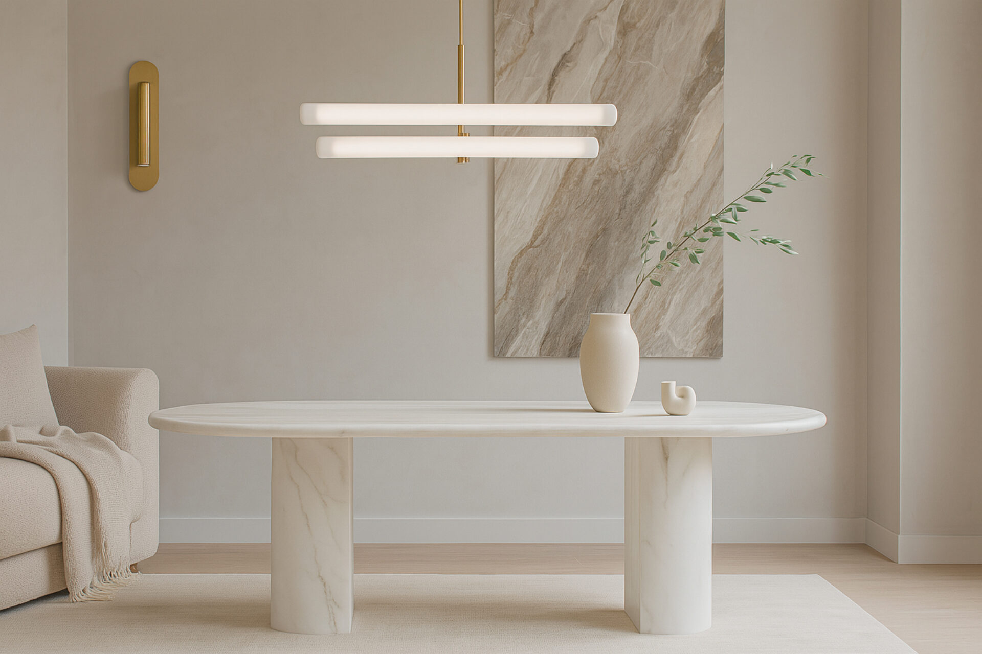 Elevate your space with the Dante dining table, featuring a lavish marble coating from top to bottom. A modern interpretation of the timeless double pedestal table, this opulent piece is crafted to enhance sophisticated, luxurious interiors.