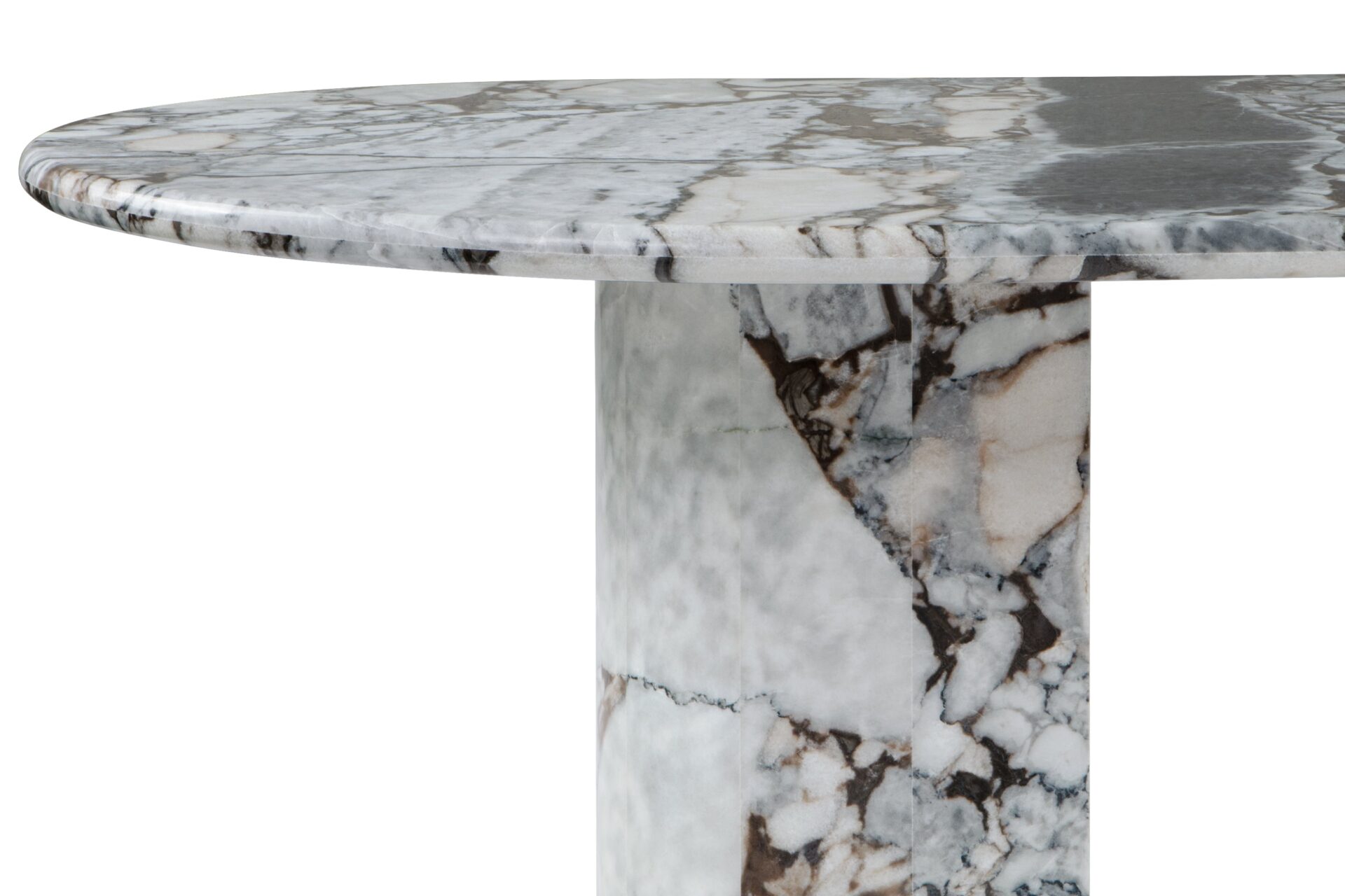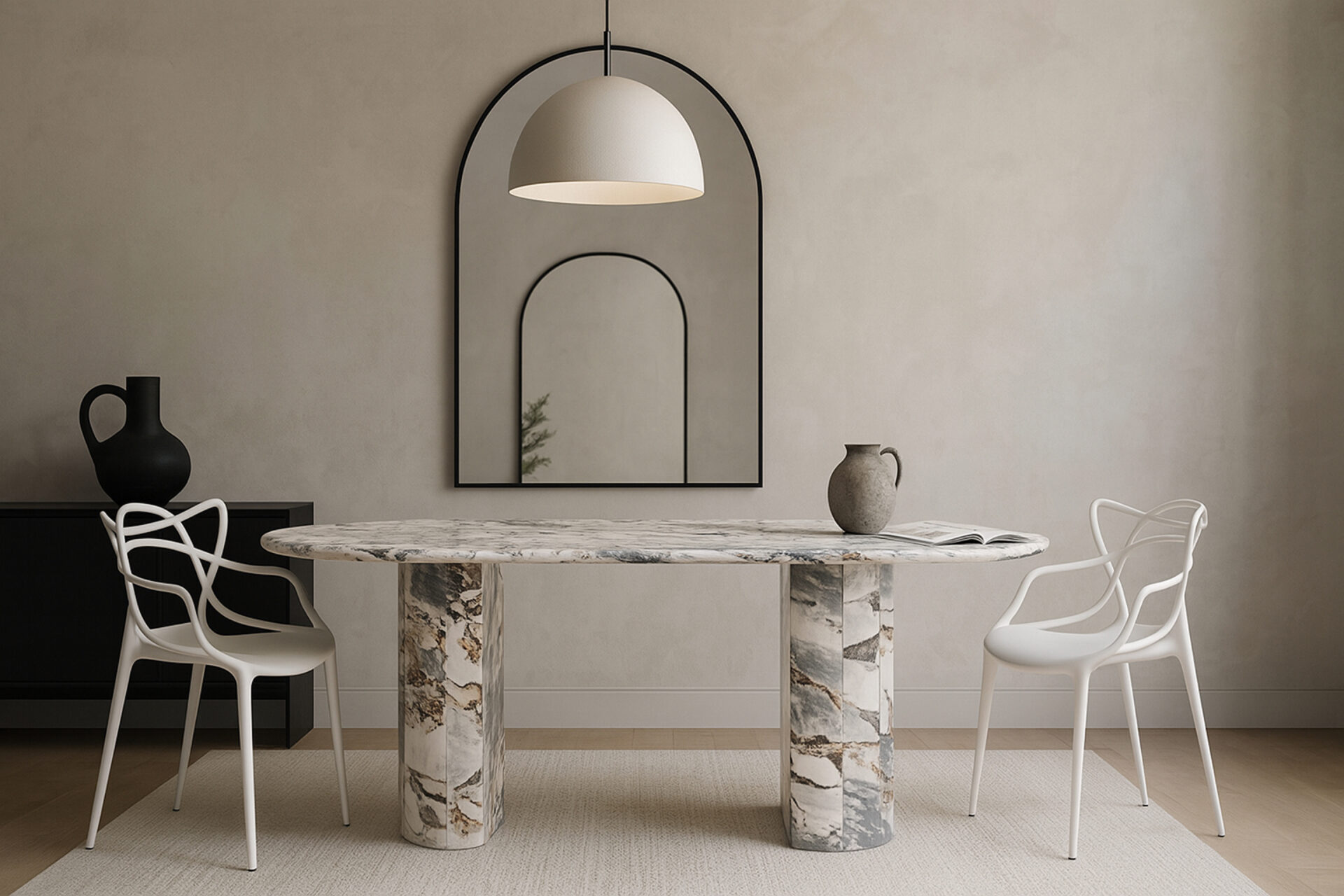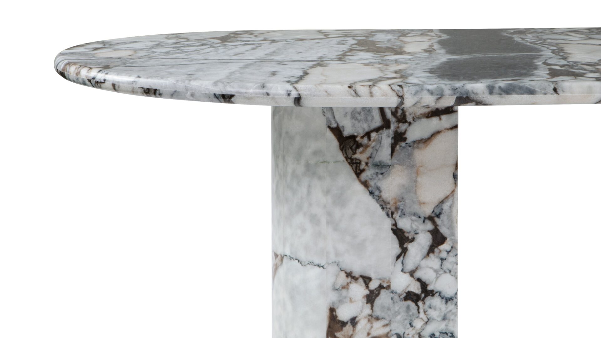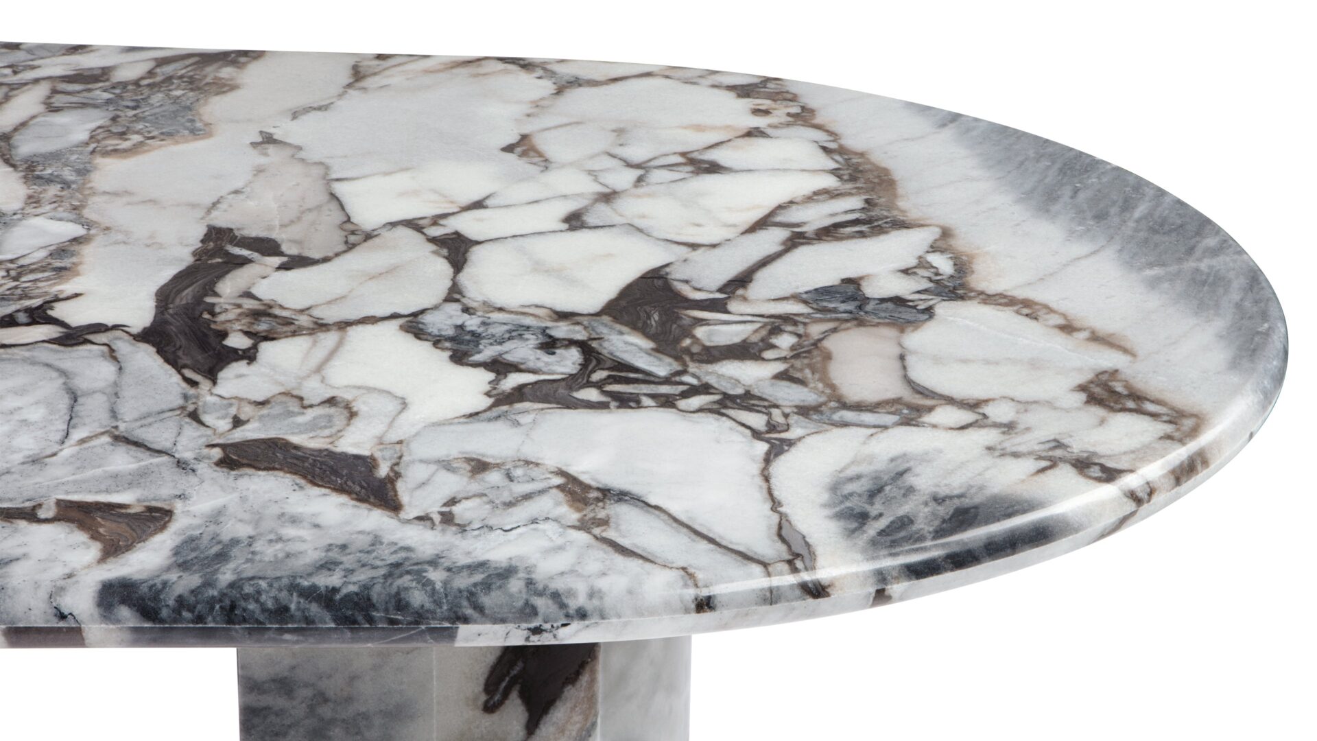 Elevate your dining room with the stunning Dante dining table. This exquisite piece is a beautiful focal point for any dining area, showcasing the elegance of fine dining. Its sleek and uncomplicated design perfectly complements the luxurious Italian modellato marble. With a refined polished finish, the Dante dining table makes a bold statement for both dining and entertaining. The impressive 77” top is elegantly supported by two demi-lune column legs, inspired by classical architecture yet exuding a contemporary flair.