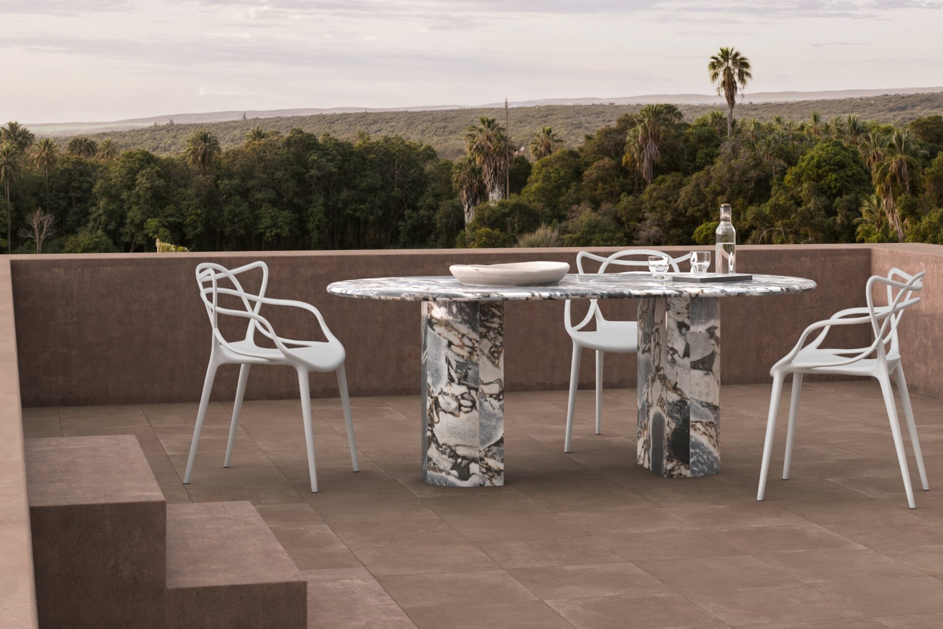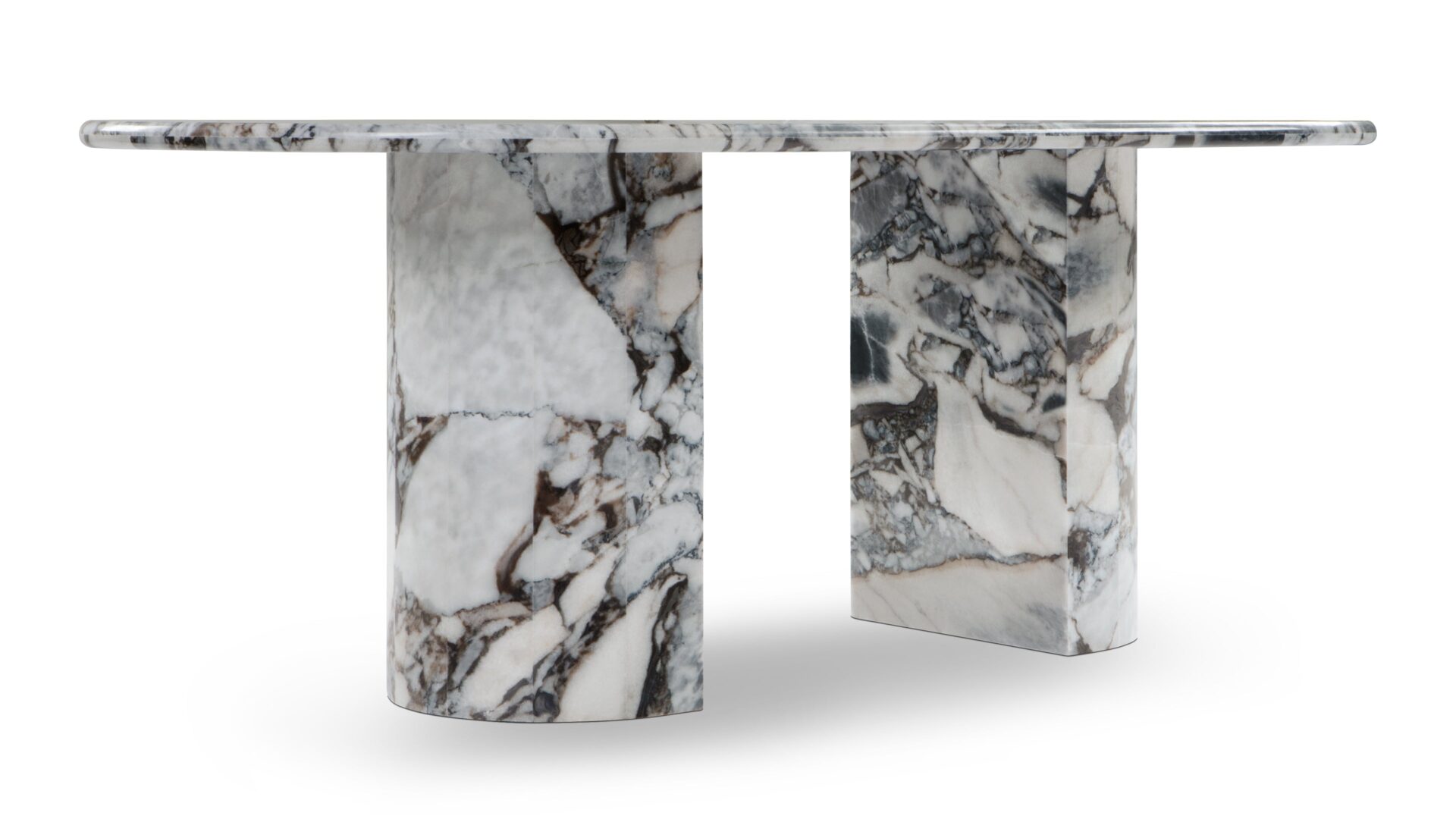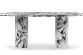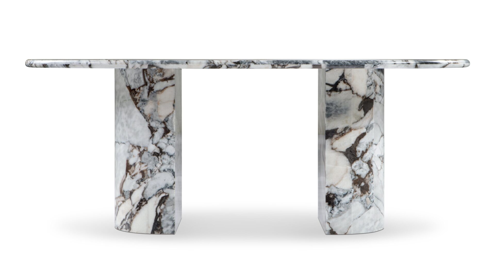 Drizzled in Italian modellato marble from top to bottom, the Dante dining table stands out as the ultimate statement piece. A modern twist on the traditional double pedestal table, this opulent piece is crafted to enhance upscale, modern interiors.