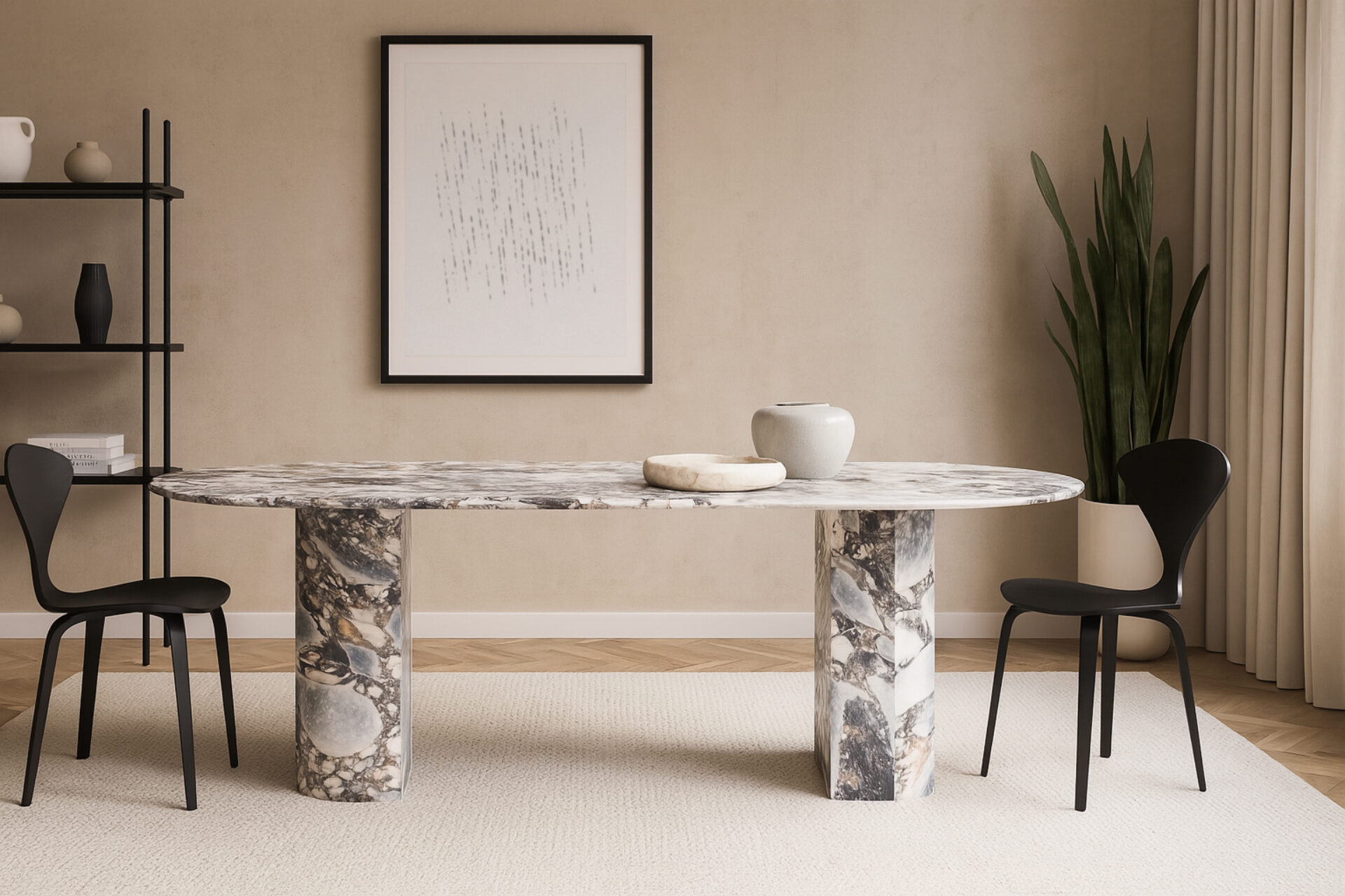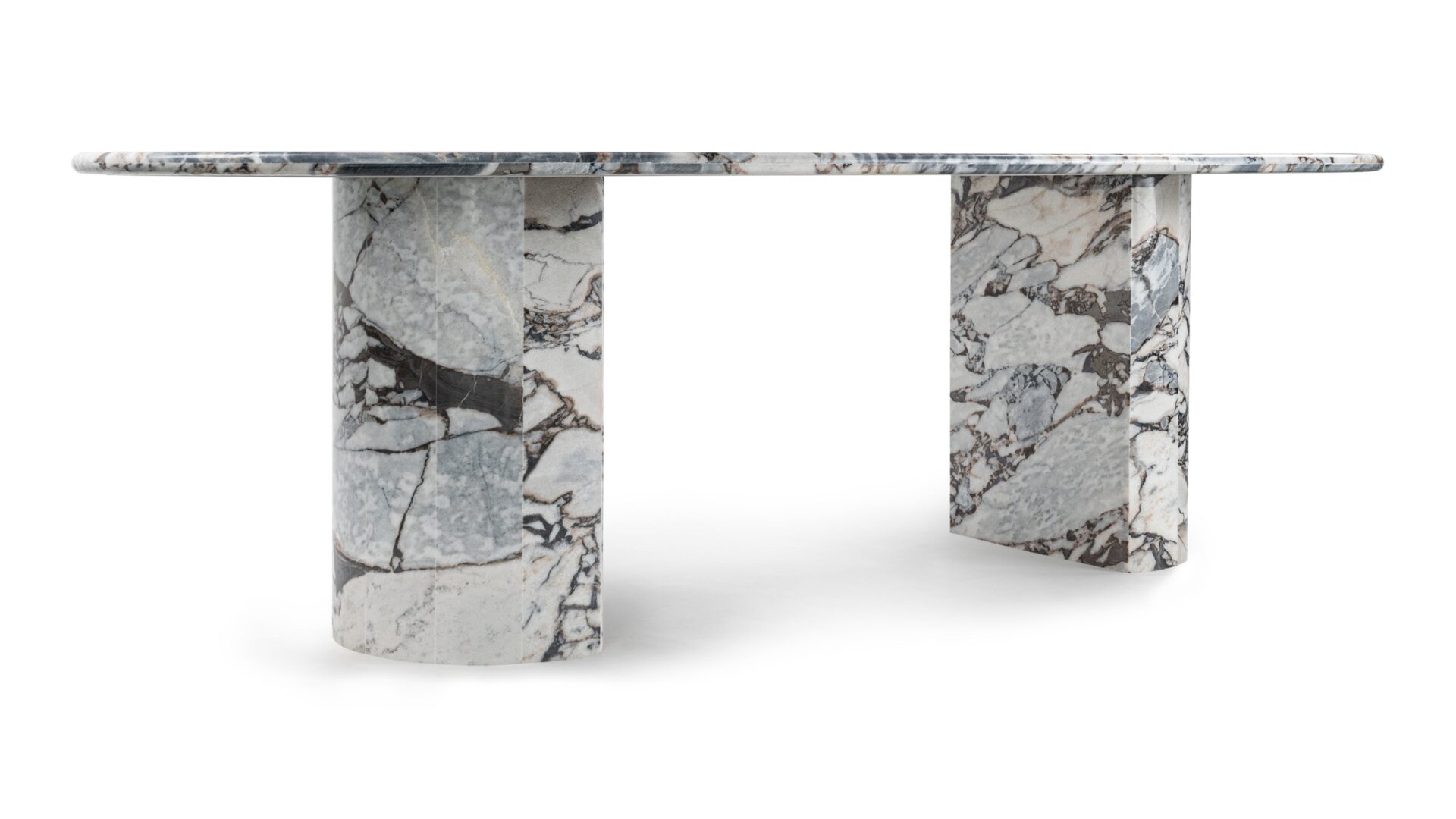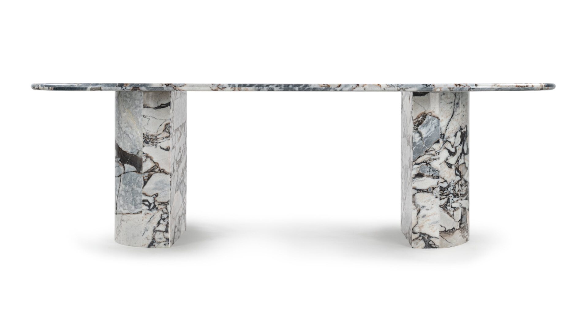 Drizzled in Italian modellato marble from top to bottom, the Dante dining table stands out as the ultimate statement piece. A modern twist on the traditional double pedestal table, this opulent piece is crafted to enhance upscale, modern interiors.