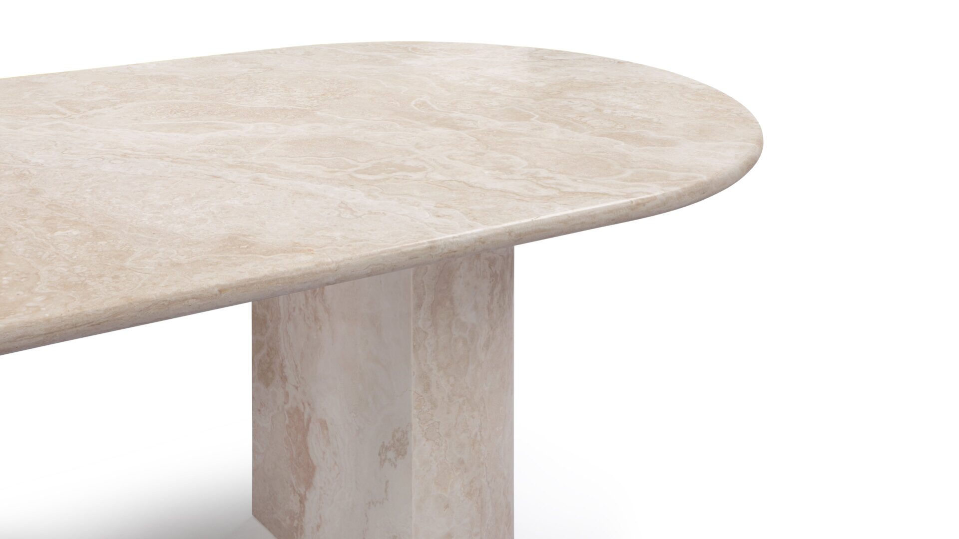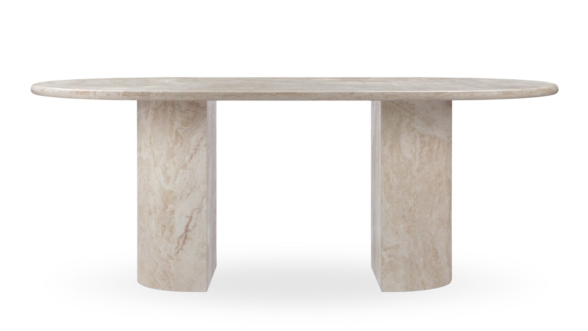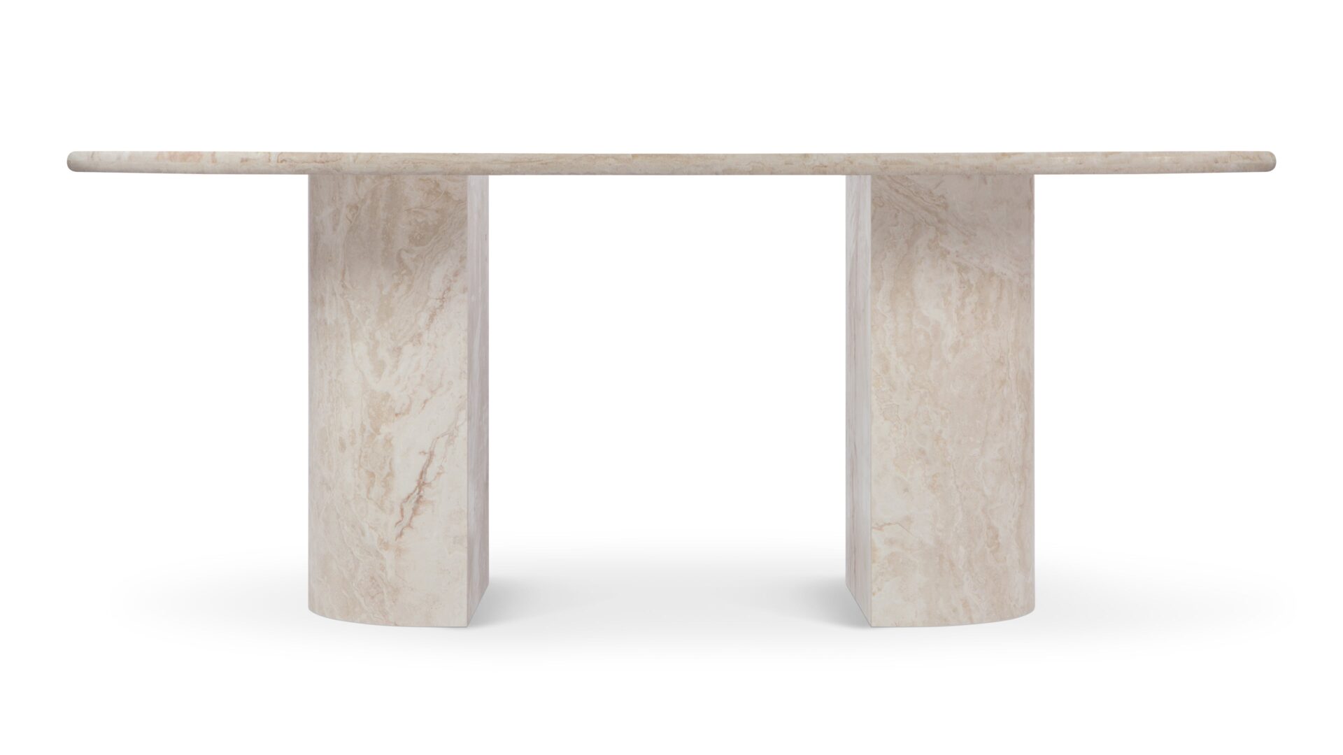 Elevate your dining space with the stunning Dante dining table, a perfect focal point that embodies the essence of fine dining. With its sleek and unpretentious design, this table beautifully complements and enhances the opulent Italian travertine. Featuring a refined polished finish, the Dante dining table is a striking centerpiece for elegant dining and entertaining. Its generous 77” top is gracefully supported by two demi-lune column legs, inspired by classical architecture yet delivered with a modern flair.