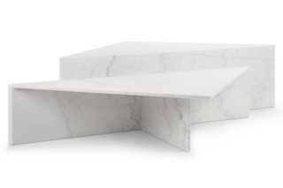 The Dea coffee table set elegantly combines form and function, featuring two marble tables that can be used together or separately. Crafted from premium white marble with graceful gray veining, the Dea coffee tables exude luxury and sophistication. Their assorted heights and angular design create a chic centerpiece, offering a practical spot for a coffee cup and a book. With its timeless allure and sophisticated aesthetic, this coffee table set effortlessly complements both modern and traditional interiors. As marble is a natural, refined material, each piece is inherently unique, showcasing subtle veining, delightful color variations, and charming distinctive characteristics.