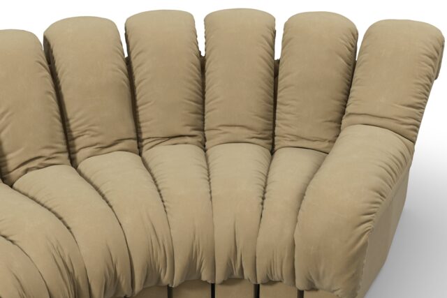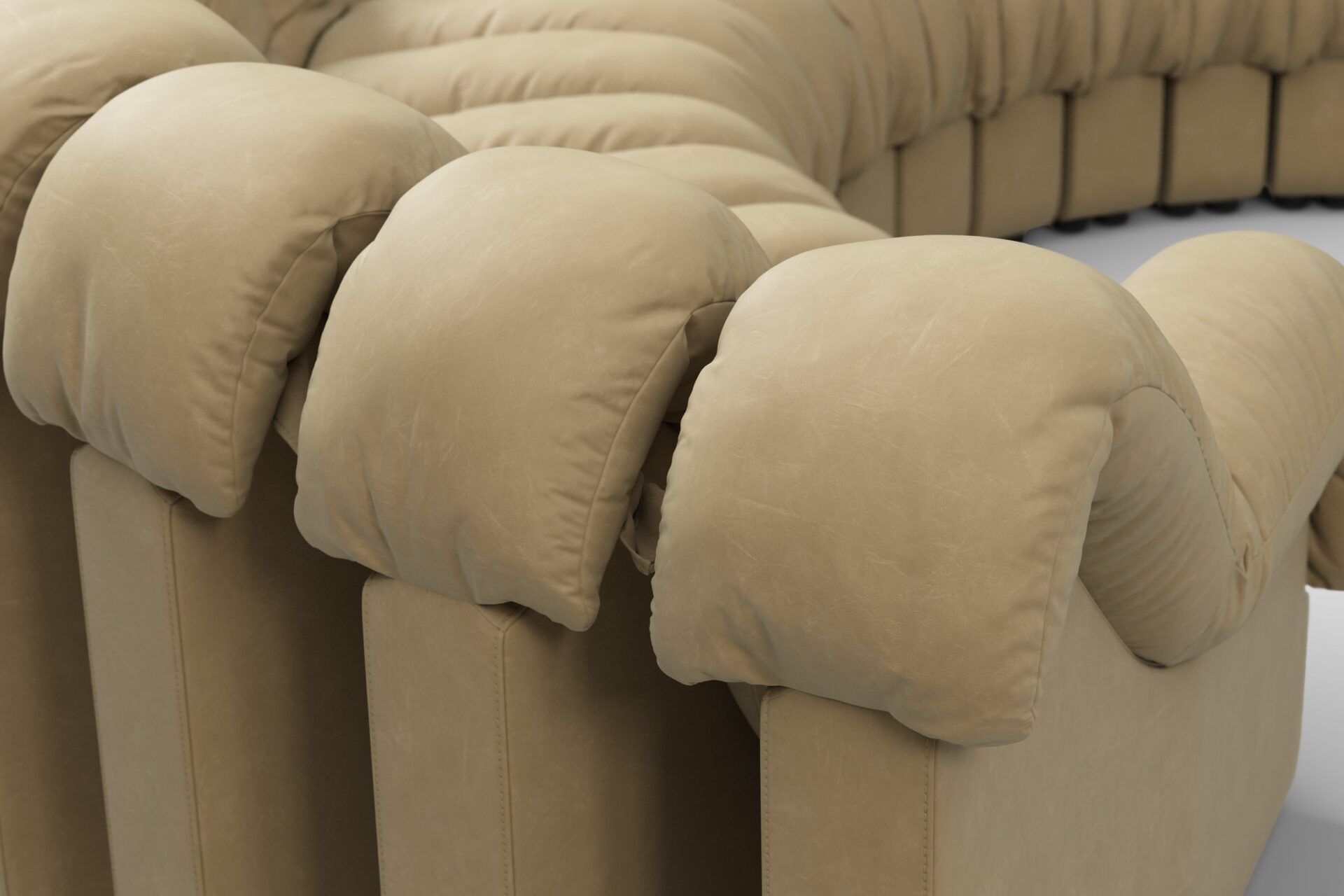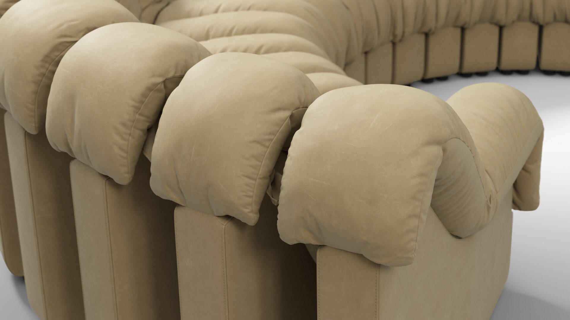 Elevate your space with the DS 600 Sofa, a stunning piece that commands attention with its bold proportions and sleek lines. Inspired by the 1970s, this stylish sectional sofa features innovative design and limitless versatility, perfect for creating an elegant seating arrangement. Crafted with luxurious beige vegan leather, it offers unmatched comfort and timeless appeal.