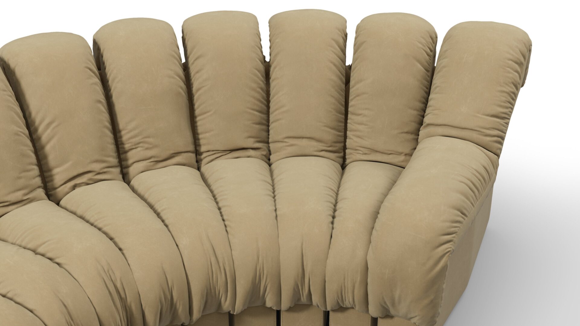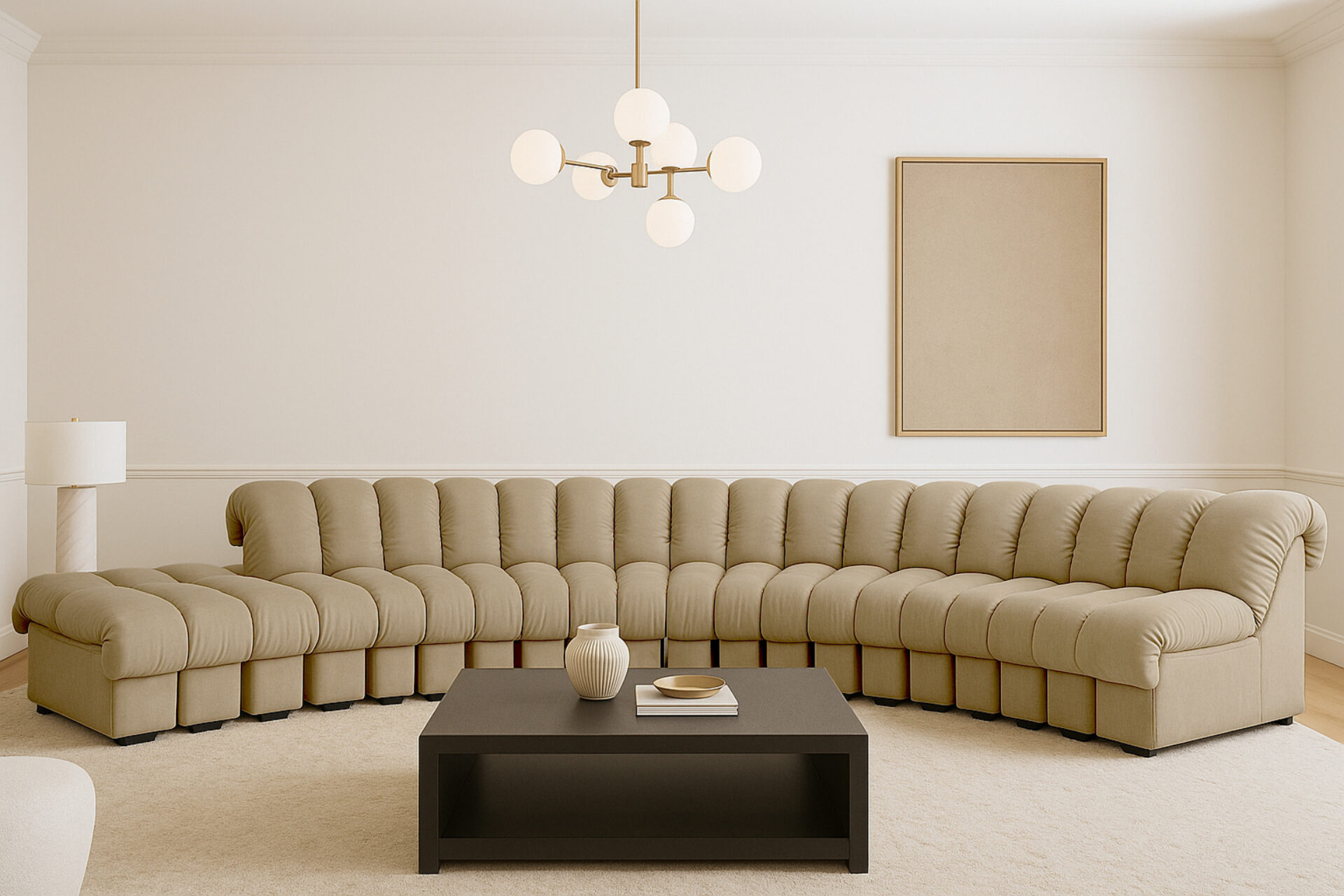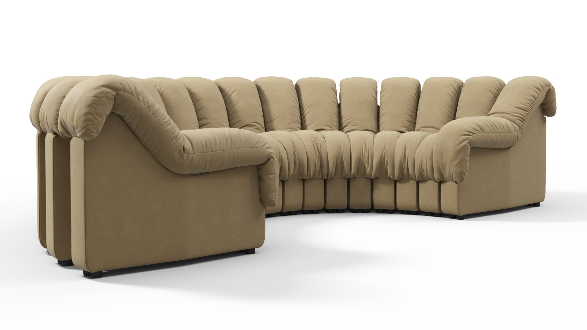 Elevate your space with the DS 600 Sofa, a stunning piece that commands attention with its bold proportions and sleek lines. Inspired by the 1970s, this stylish sectional sofa features innovative design and limitless versatility, perfect for creating an elegant seating arrangement. Crafted with luxurious beige vegan leather, it offers unmatched comfort and timeless appeal.