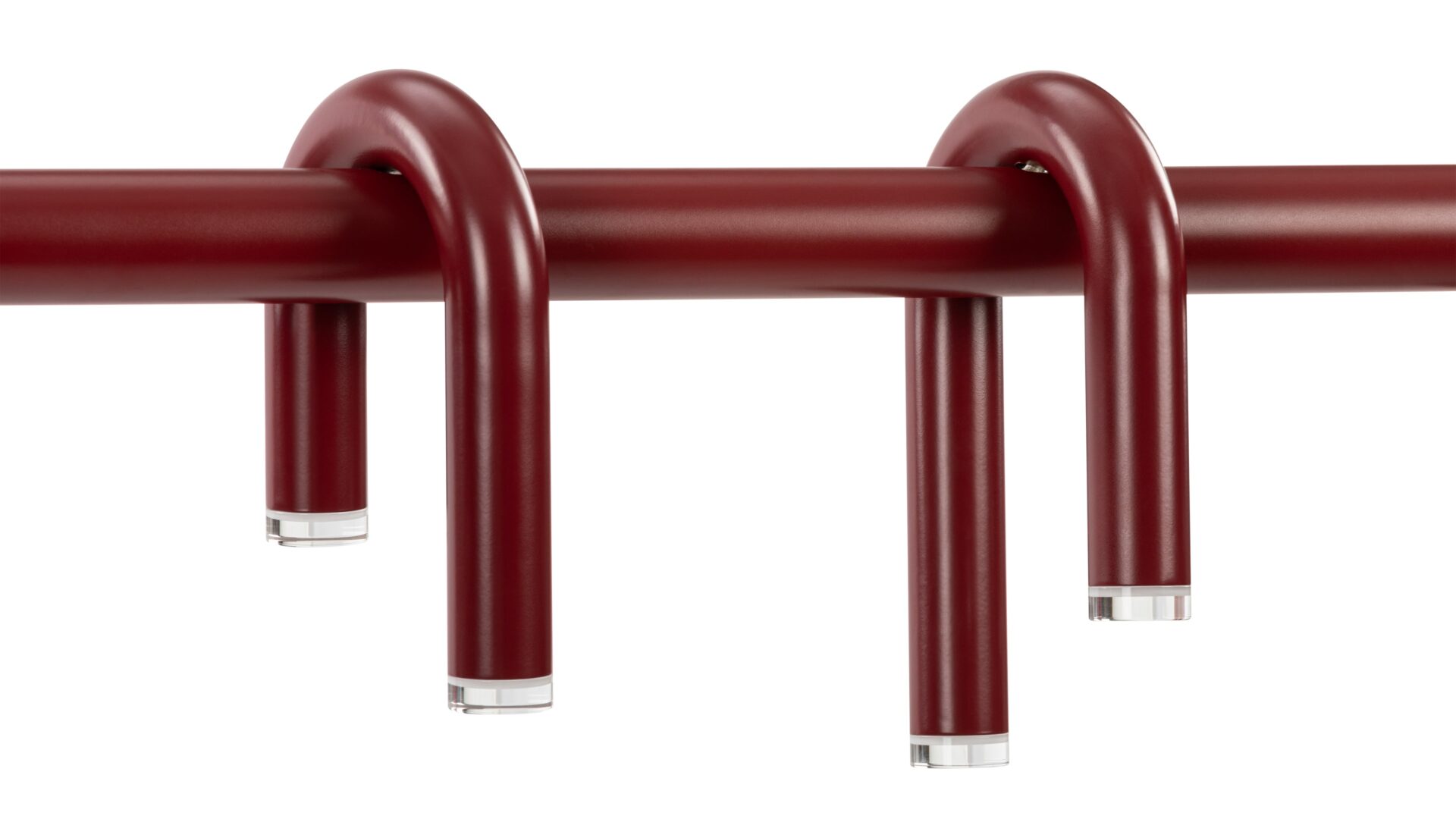 Add modern flair to your space with the Envie Ceiling Lamp. Its unique design of repeated arches in varying lengths, adorned in vibrant red, exudes futuristic allure and whimsical charm. Emitting a soft white light from built-in LEDs, it creates a cozy ambiance while maintaining a visually weightless look. Ideal for contemporary spaces seeking a bold statement.