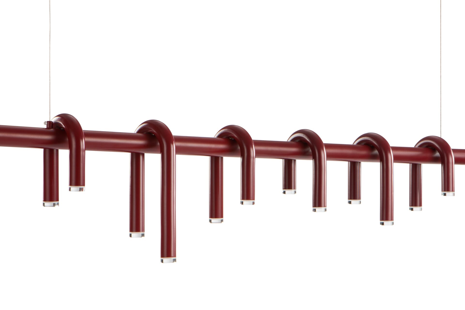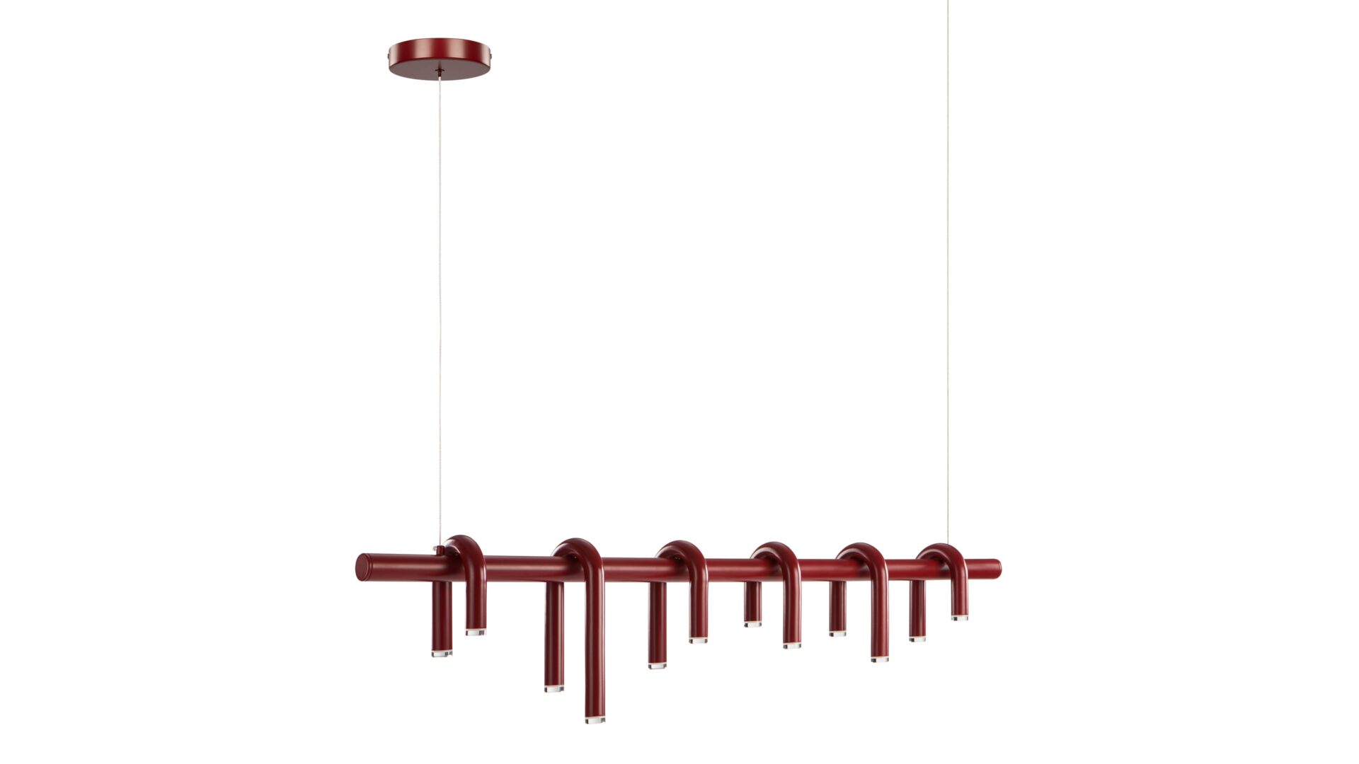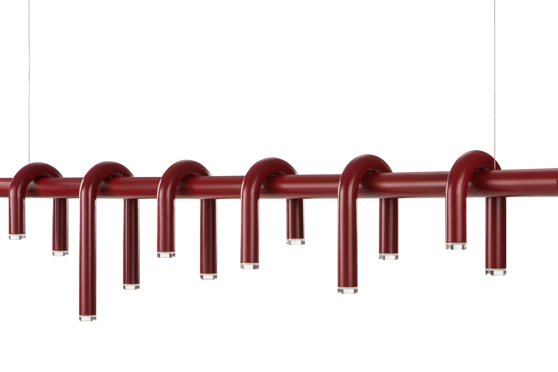 Illuminate your space with the striking Envie Ceiling Lamp, showcasing a unique design of repeated arches in varying lengths that curve over a suspended bar at the center. Adorned in a vibrant red finish, this light exudes a blend of futuristic allure and whimsical charm, skillfully juxtaposing ridged and sinking tubular shapes. The tube ends emit a soft, white light downwards from the built-in LED system, creating a cozy ambiance. Delicately suspended by discreet wires, this fixture maintains a visually weightless look while making a bold statement, ideal for spaces with a contemporary appeal.