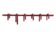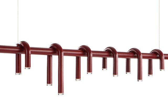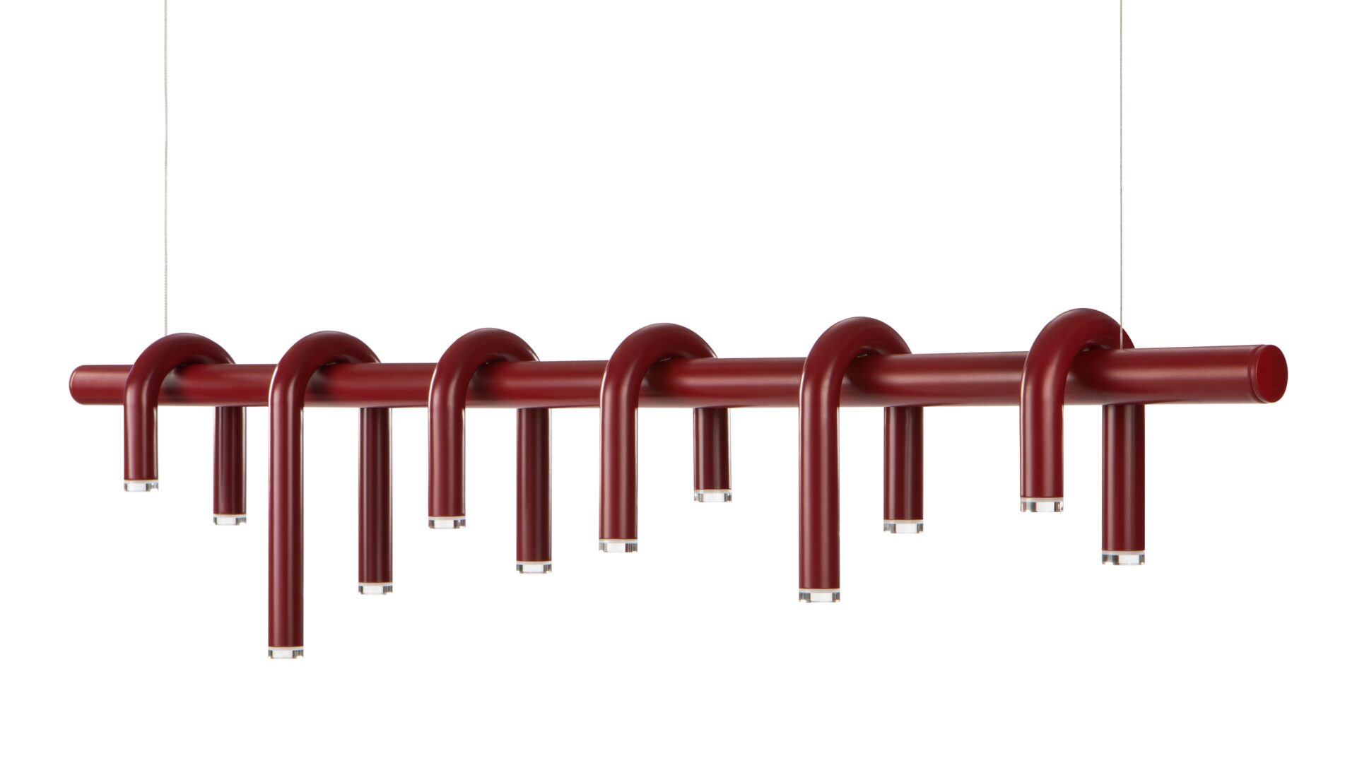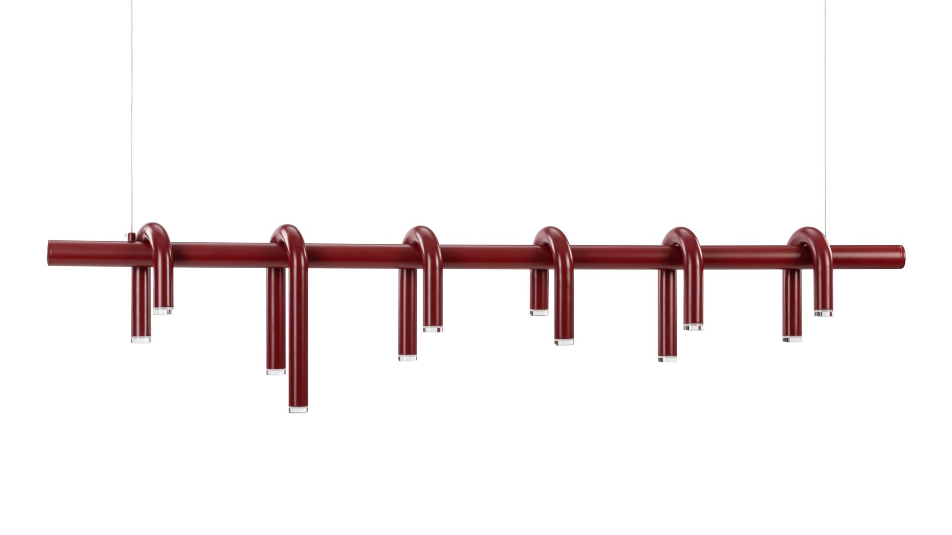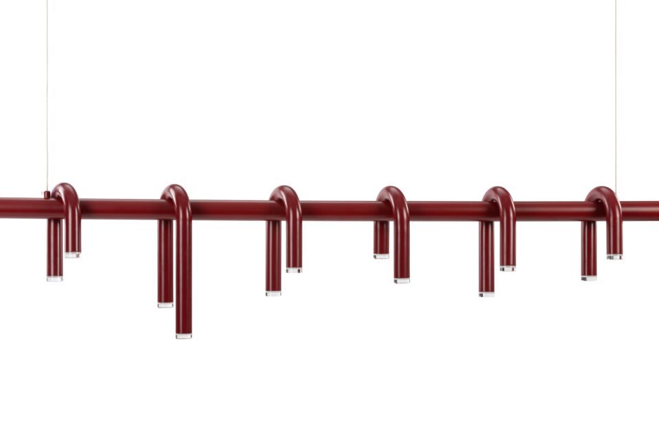Illuminate your space with the striking Envie Ceiling Lamp, showcasing a unique design of repeated arches in varying lengths that curve over a suspended bar at the center. Adorned in a vibrant red finish, this light exudes a blend of futuristic allure and whimsical charm, skillfully juxtaposing ridged and sinking tubular shapes. The tube ends emit a soft, white light downwards from the built-in LED system, creating a cozy ambiance. Delicately suspended by discreet wires, this fixture maintains a visually weightless look while making a bold statement, ideal for spaces with a contemporary appeal.