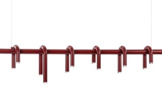 Illuminate your space with the striking Envie Ceiling Lamp, showcasing a unique design of repeated arches in varying lengths that curve over a suspended bar at the center. Adorned in a vibrant red finish, this light exudes a blend of futuristic allure and whimsical charm, skillfully juxtaposing ridged and sinking tubular shapes. The tube ends emit a soft, white light downwards from the built-in LED system, creating a cozy ambiance. Delicately suspended by discreet wires, this fixture maintains a visually weightless look while making a bold statement, ideal for spaces with a contemporary appeal.