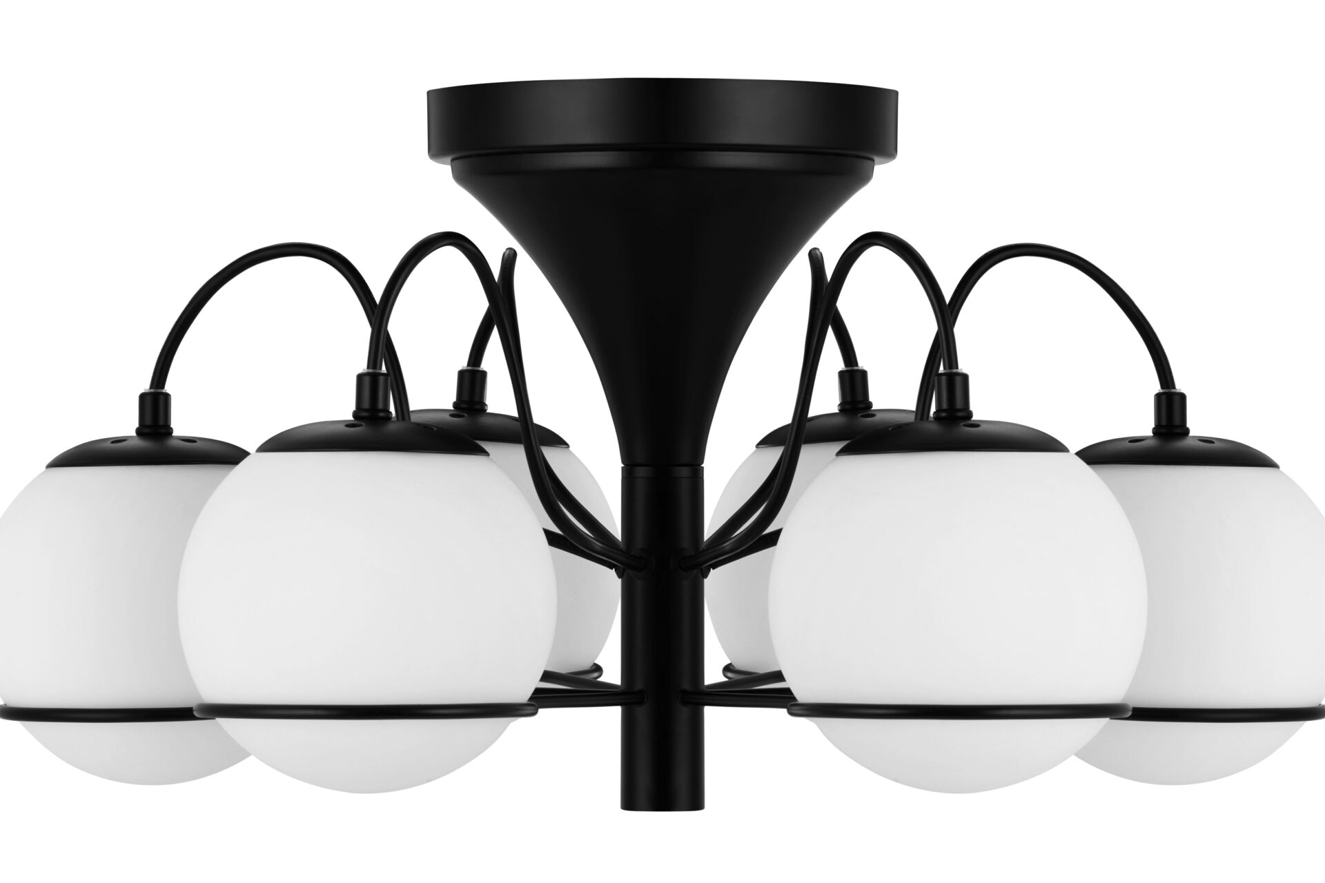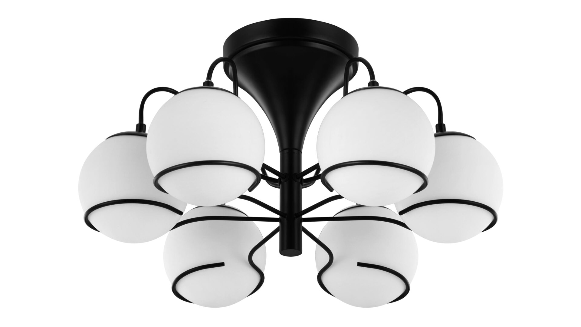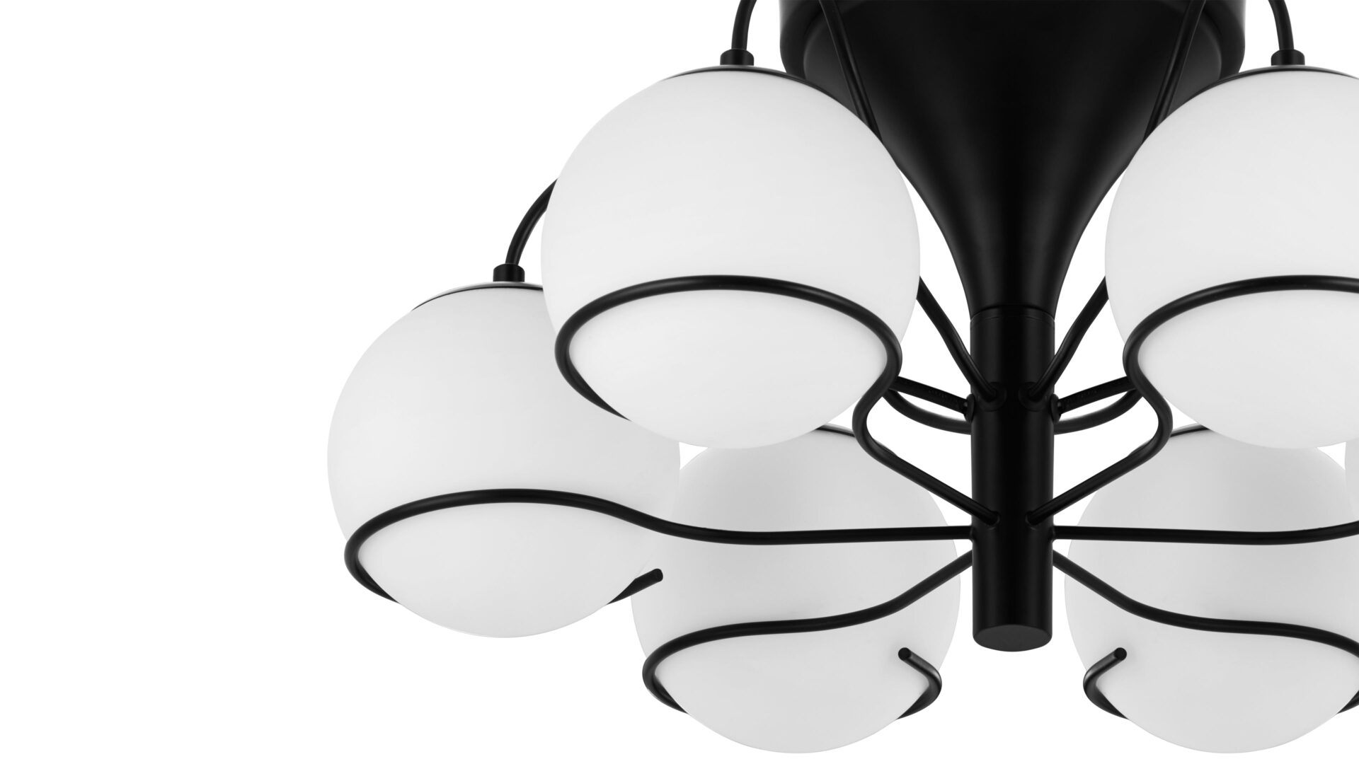 Experience a contemporary charm with the Ette Ceiling Light. Crafted with a matte black finish and white glass globes that emit a soft, diffused glow, this light fixture exudes an essence of airy elegance and minimalist opulence.