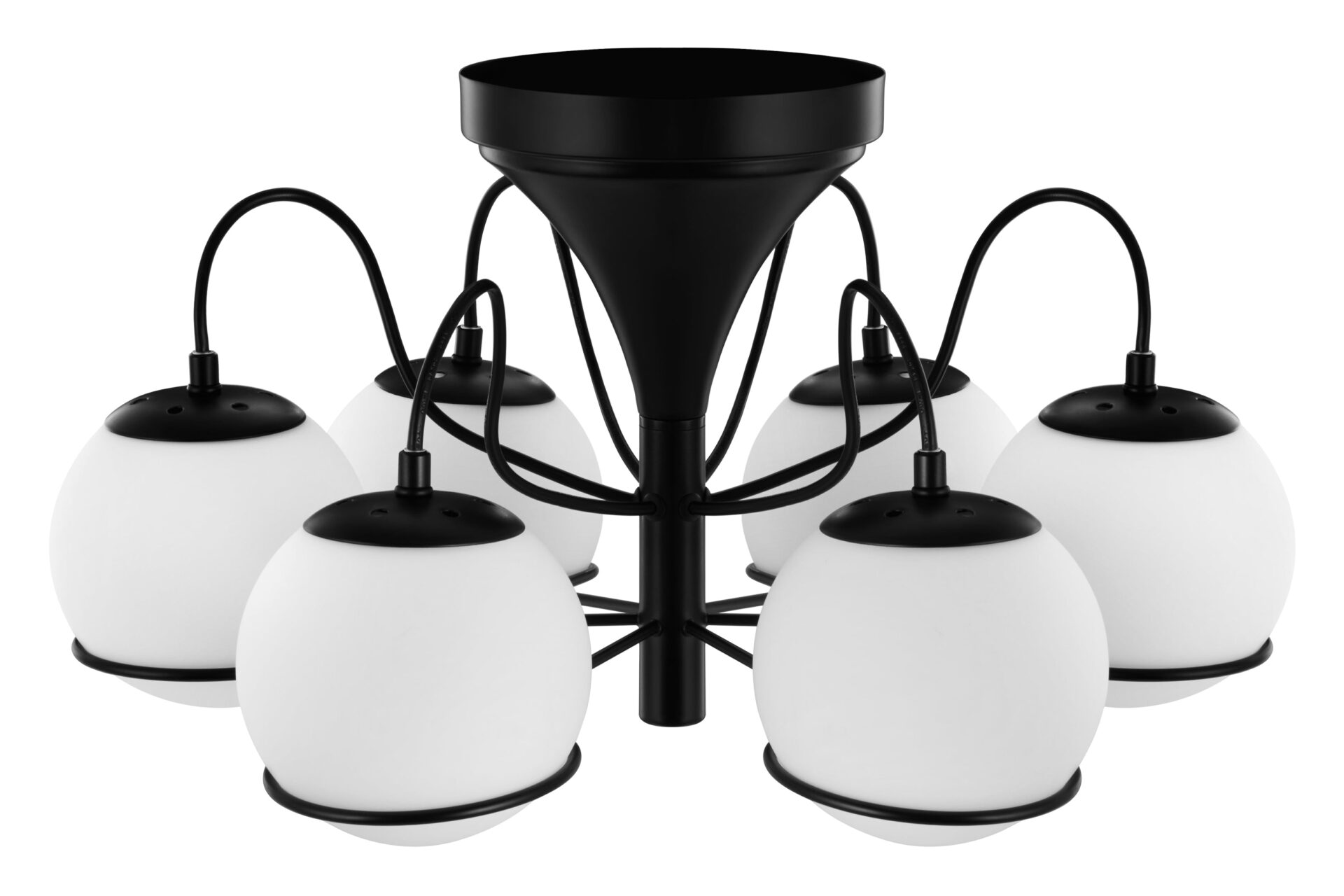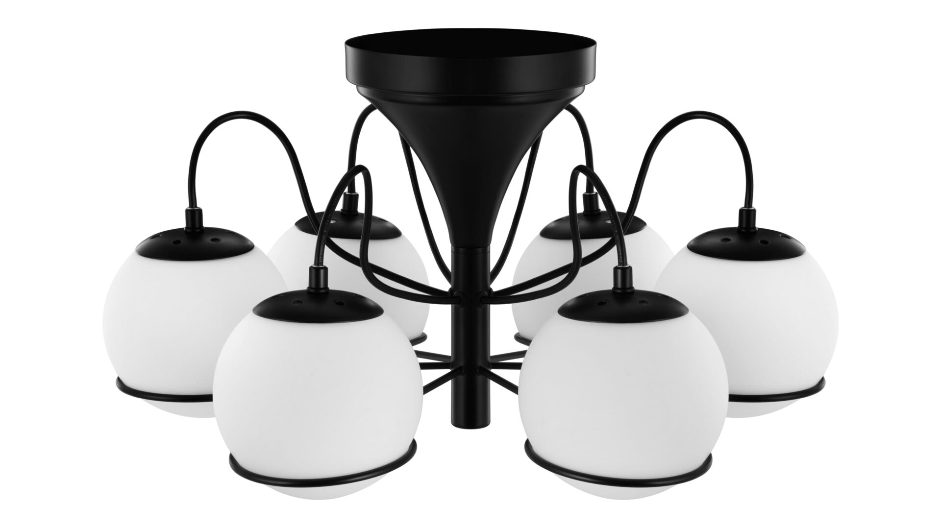 Fashioned from durable iron metal, this chandelier features a sleek matte black finish, complemented by delicate white glass globes that amplify its sophisticated, modern charm.
